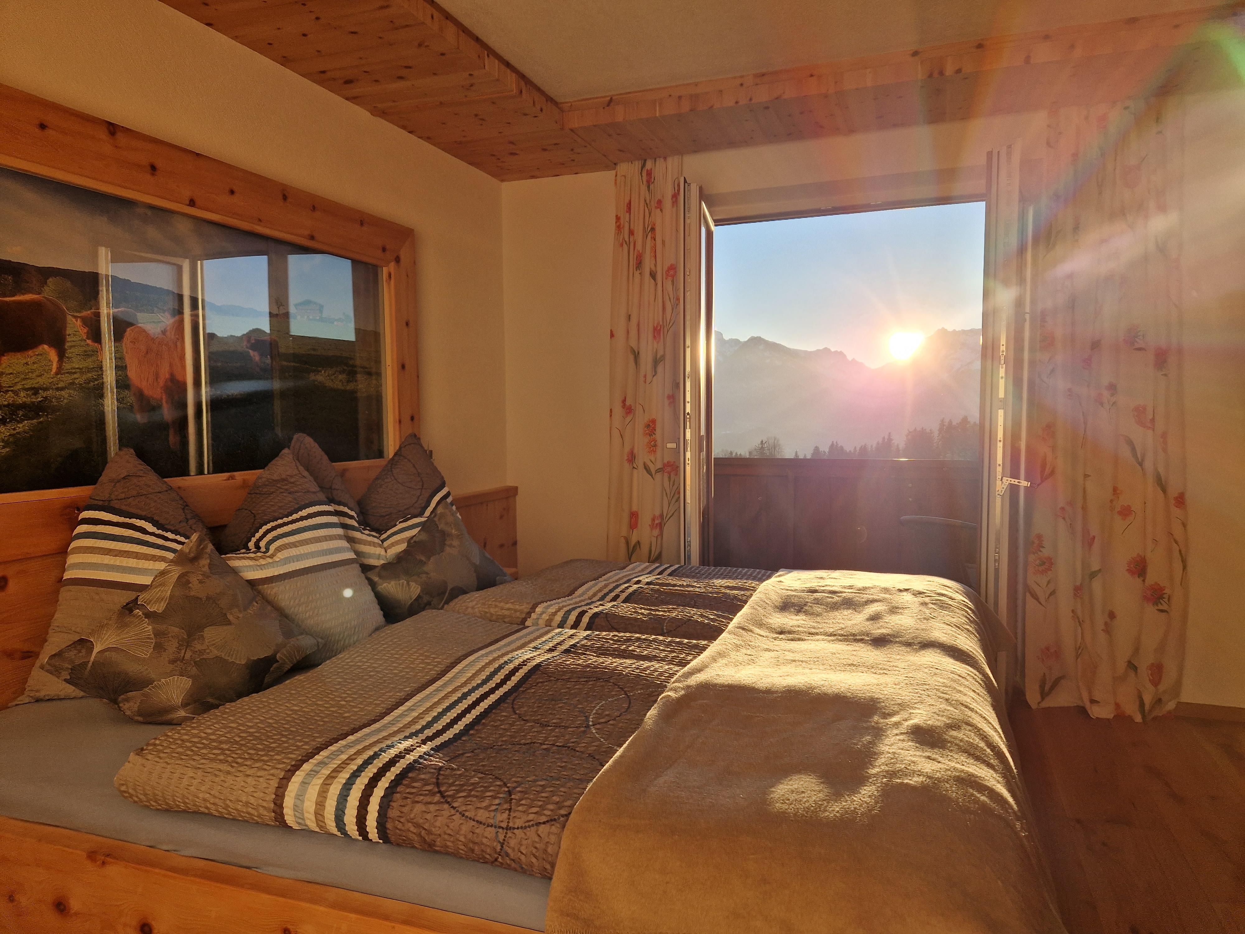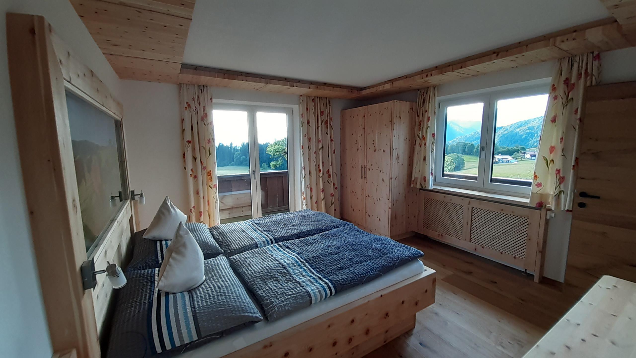 Von Tischlerhand gefertigtes Zirbenschlafzimmer oder Schlafzimmer in gemütlichem Altholz, Essecke rustikal in Altholz, Flat-Screen TV, möblierter Balkon mit herrlichem, freien Blick zum Kaisergebirge – Südwestlage. WLAN, Nichtraucher, Bad mit begehbarer Dusche/WC,