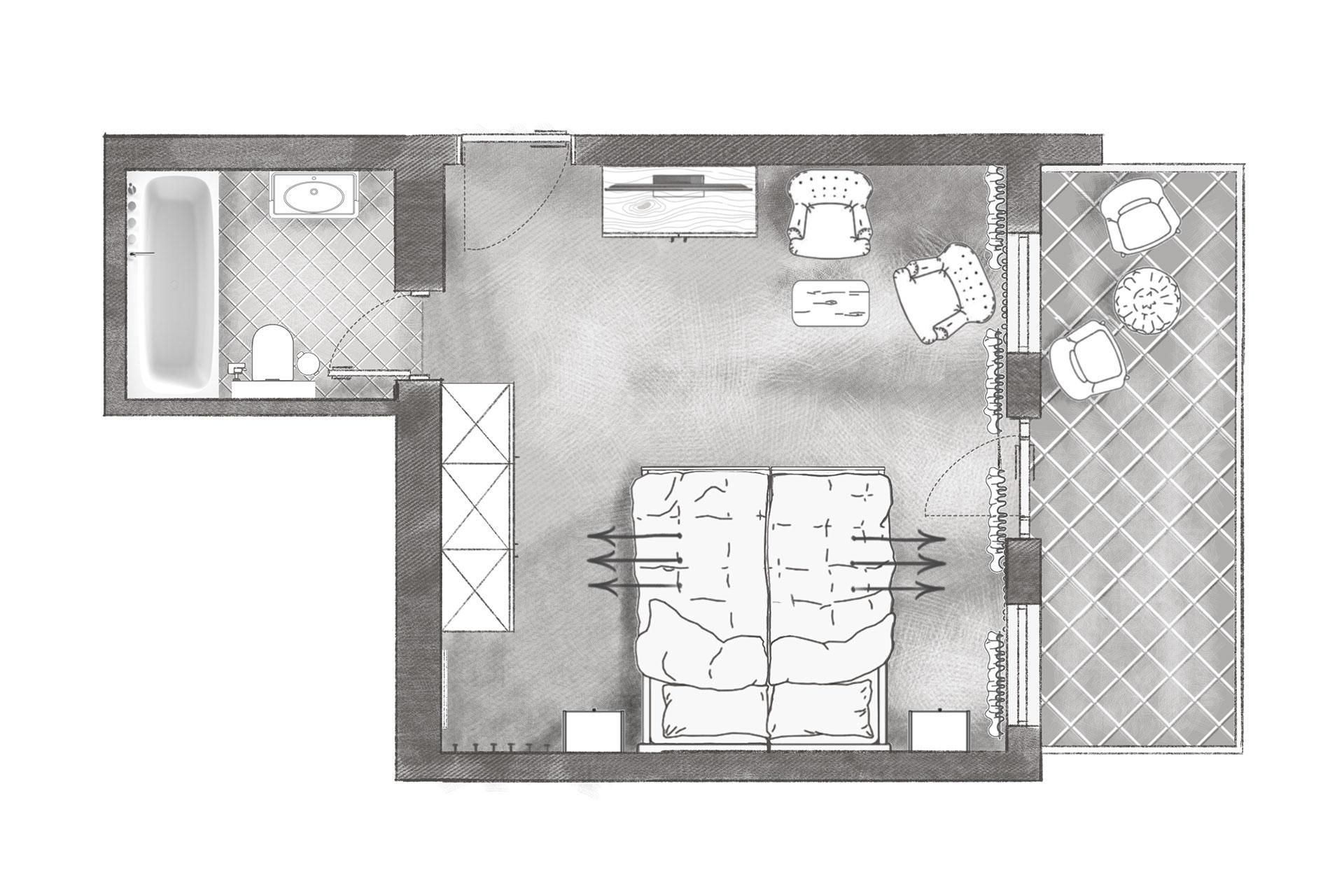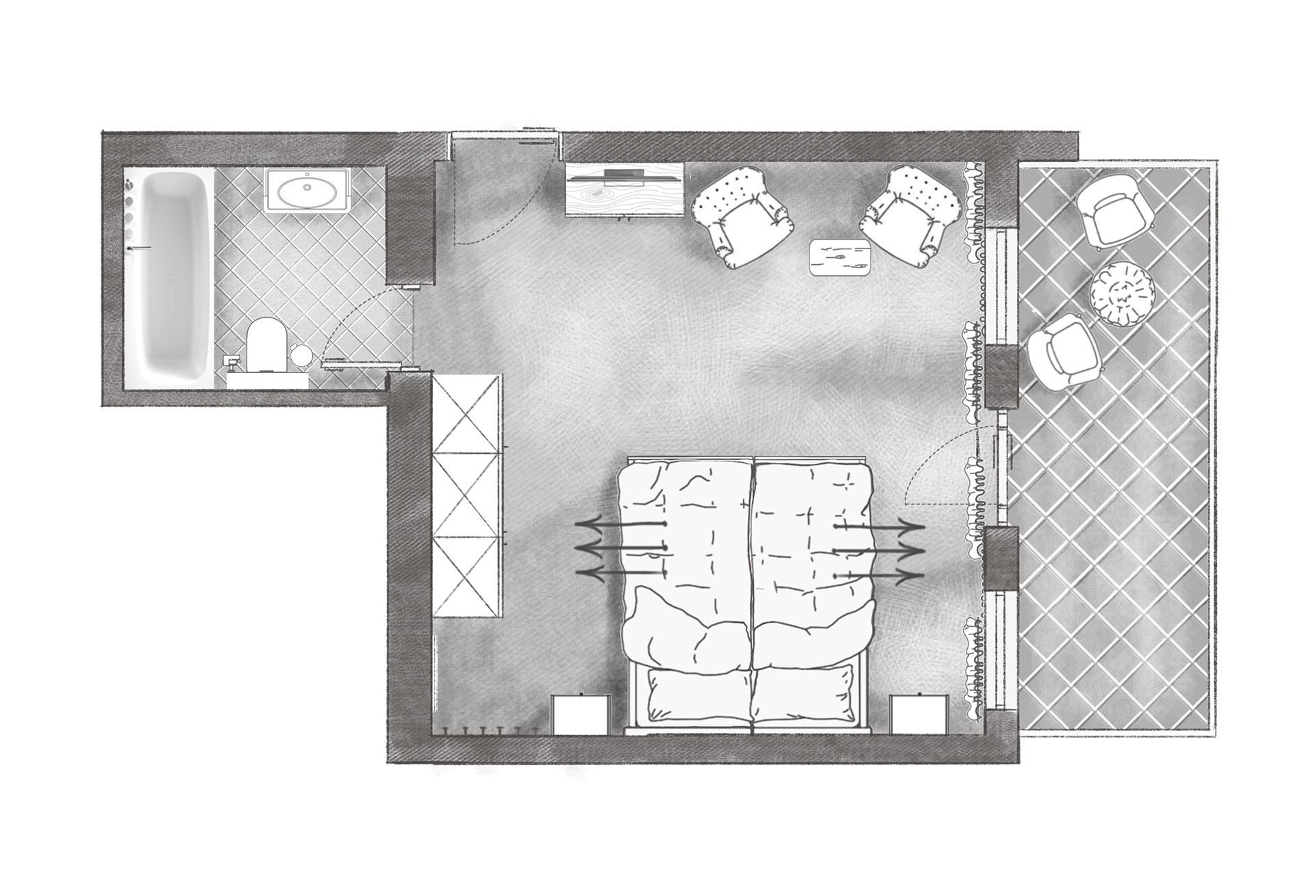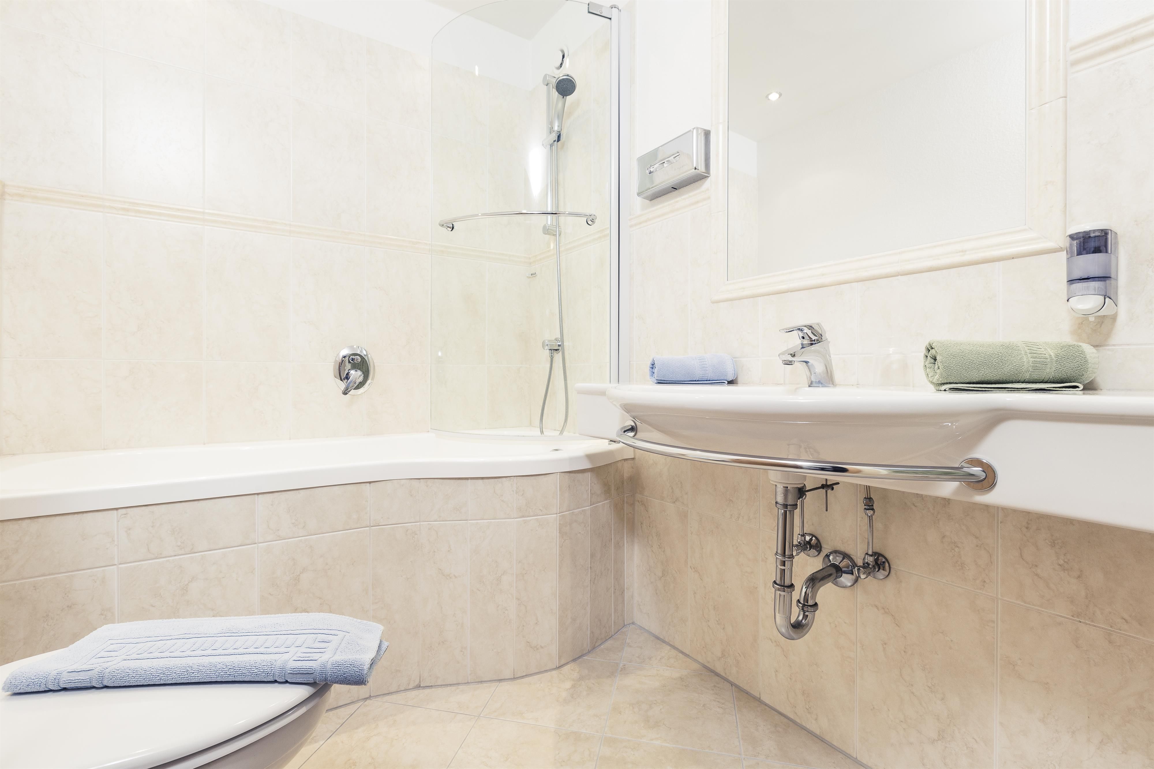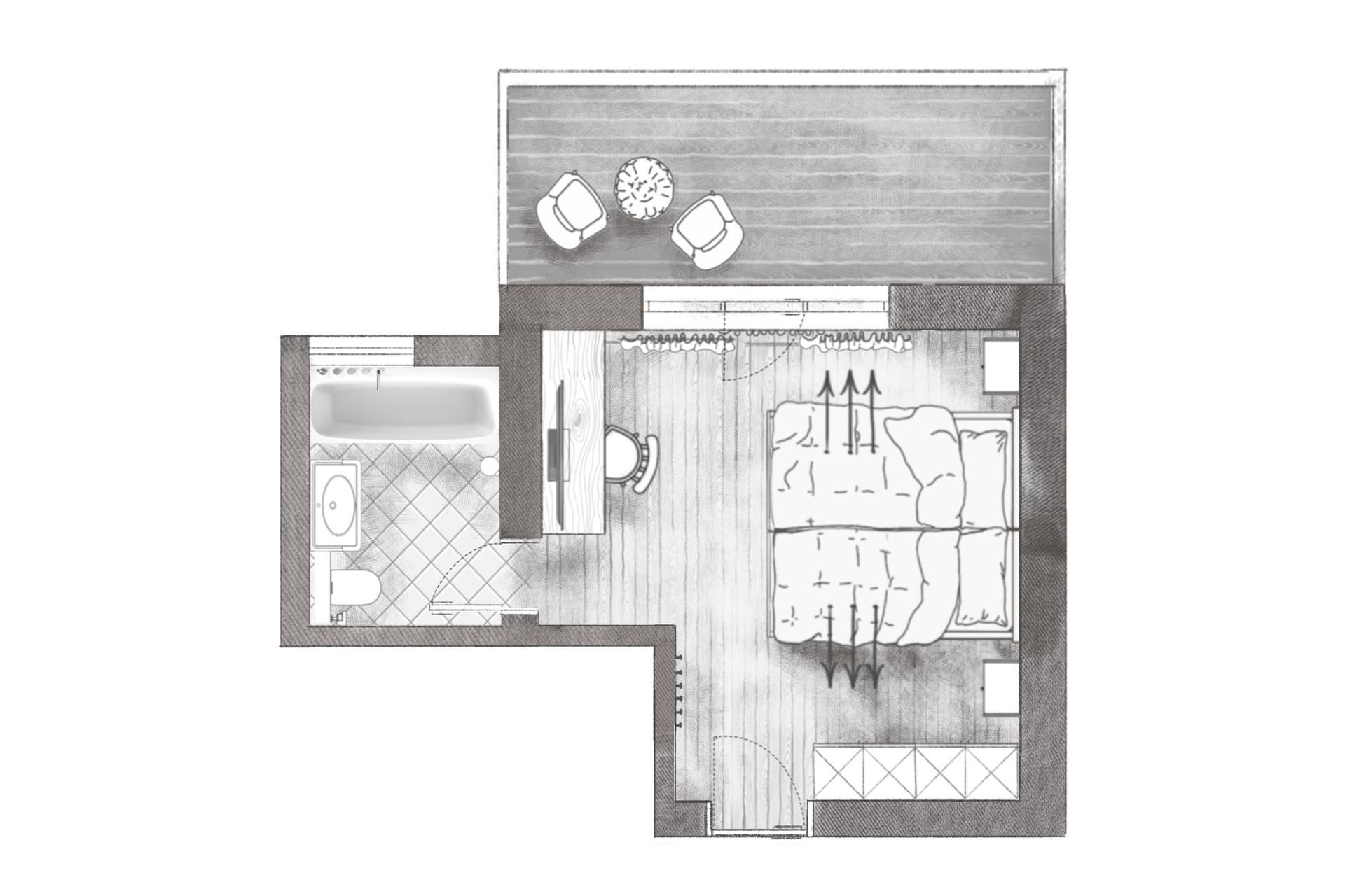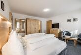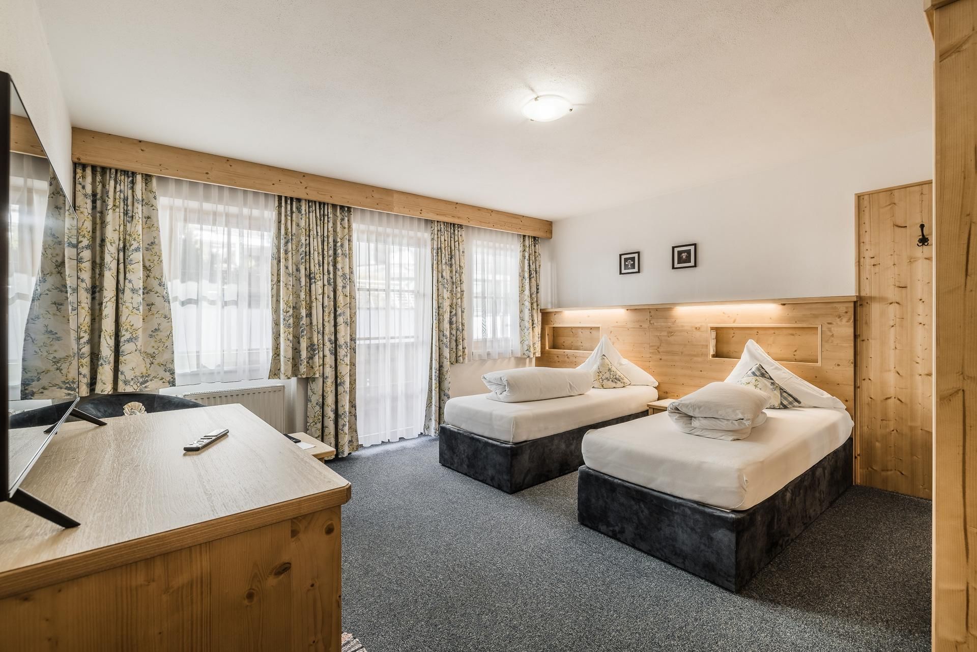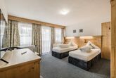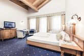 Doppelzimmer Standard für 2 Personen mit Boxspringbett (1,8 x 2 m). West- oder Nordseite mit ca. 24 m². Dieses Zimmer bietet folgende Annehmlichkeiten: Balkon (nach Norden oder Westen ausgerichtet), TV, Radio, Telefon, gratis Wi-Fi, Safe, Badezimmer mit Wanne und integrierter Dusche, WC.