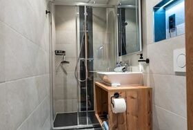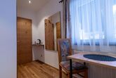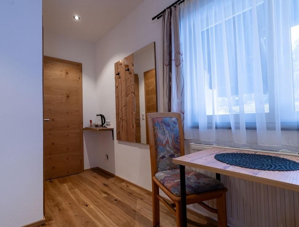 Unser nordseitiges Doppelzimmer ist mit DU/WC, Sat TV, Föhn und Safe und Schreibtisch ausgestattet. Das Zimmer hat keinen Balkon. Im Garten stehen Ihnen mehrere Sitzgelegenheiten für gemütliche Stunden im Freien zur Verfügung.