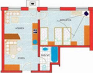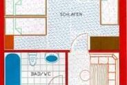 Appartement mit einem Wohn-Schlafraum mit Doppelbett, Kochnische, Essecke und Bad/WC. Größe: ca. 28 m². (Typ 2 und Typ 3 können durch Verbindungstüren zusammengeschlossen werden.)