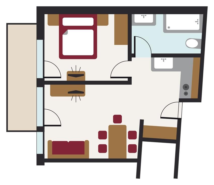 1 Schlafzimmer, 1 Wohnküche mit Balkon oder Terrasse, elektrischer Kachelofen, komplett eingerichtete Küche, Badezimmer mit Bad, WC, Fön, Kabel-TV, Wireless Internet, Telefon, Safe.