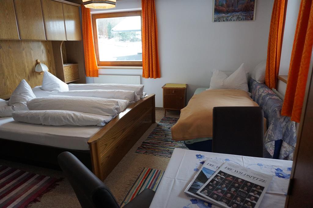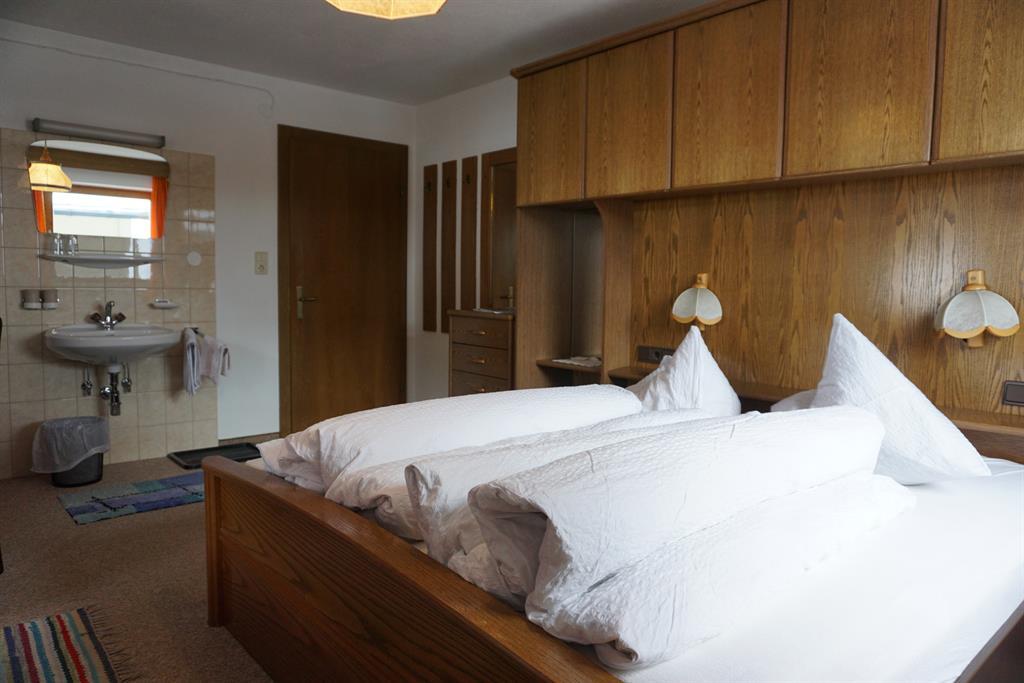 Zimmer mit einem Doppelbett und ein Einzelbett mit Fließwasser (Etagen-Dusche/WC am Flur - benützt wird dieses von einem weiterem Zimmer), Kabel-TV und Balkon. Getrennte Betten auf Anfrage möglich! Größe: ca. 23 m².