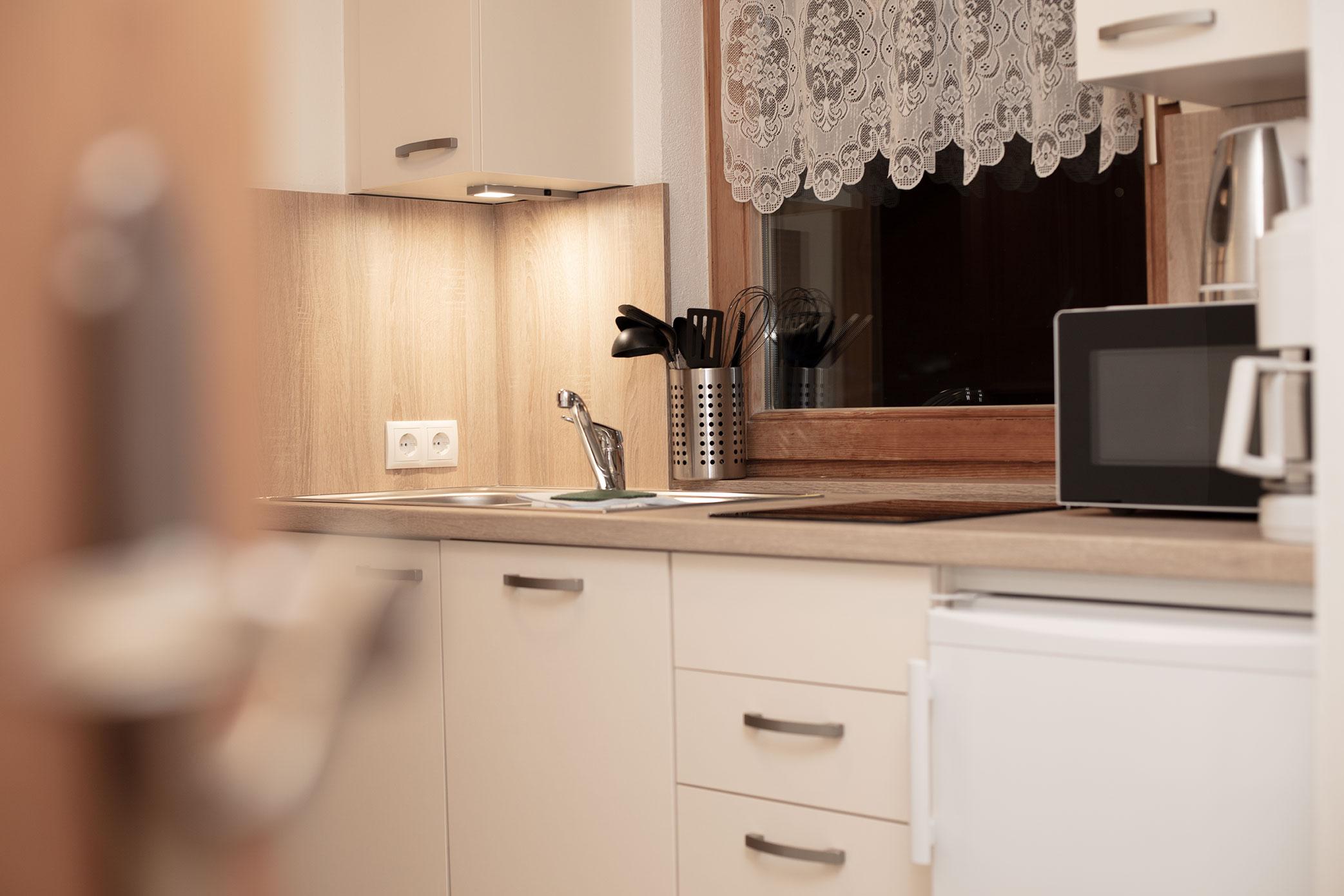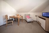 Appartement 1 mit Dachschräge und ca. 30 m² (ohne Balkon): 1 Doppelzimmer, 1 Badezimmer mit Dusche/WC, Wohnraum mit Essbereich, voll ausgestattete Küche mit Geschirrspülmaschine, Kaffeemaschine, Toaster, Wasserkocher, Mikrowelle, 2-Platten-Cerankochfeld uvm.