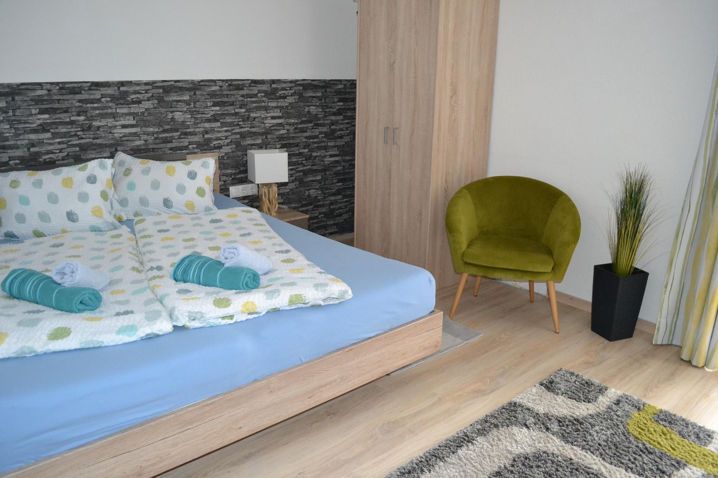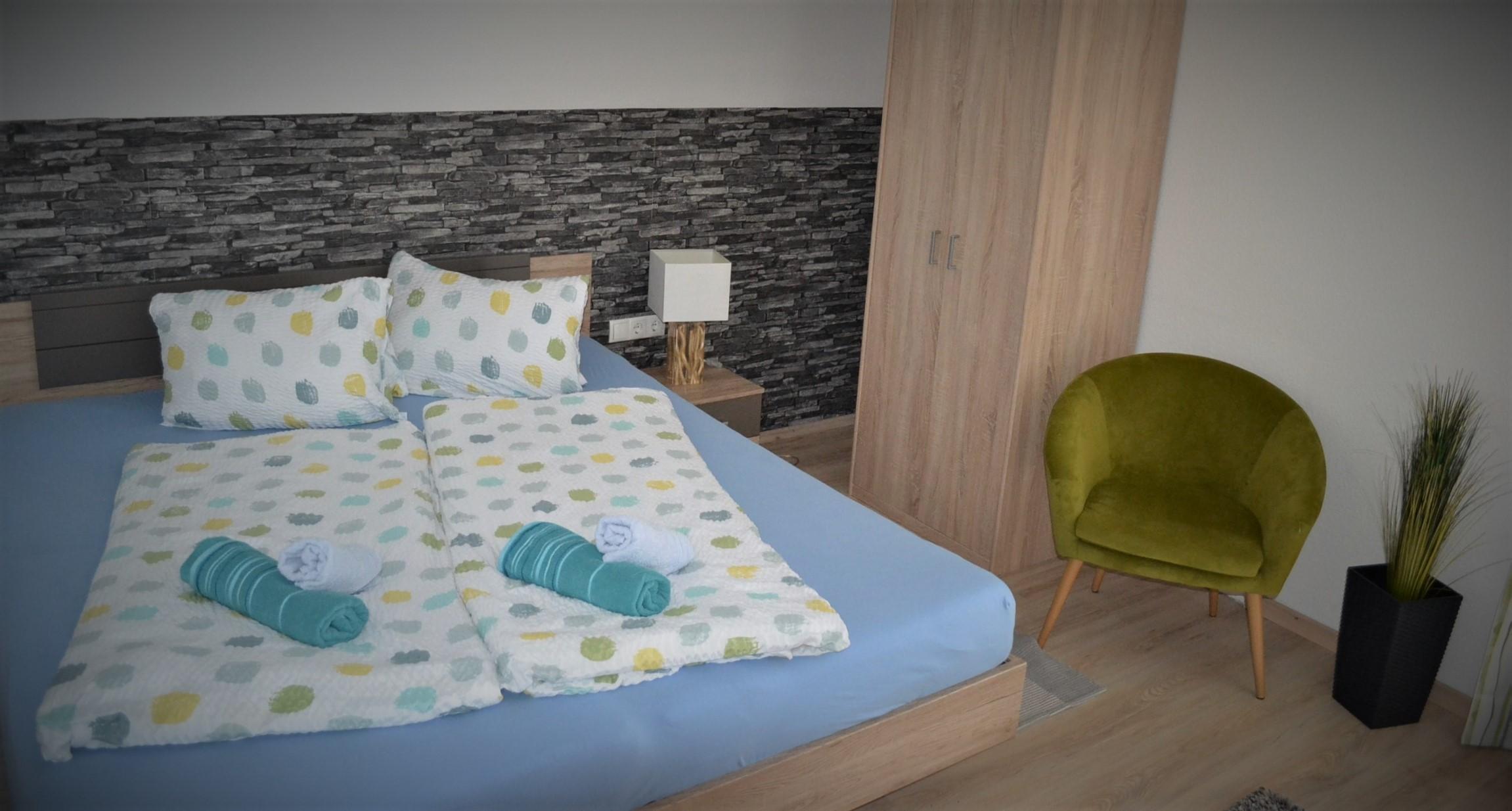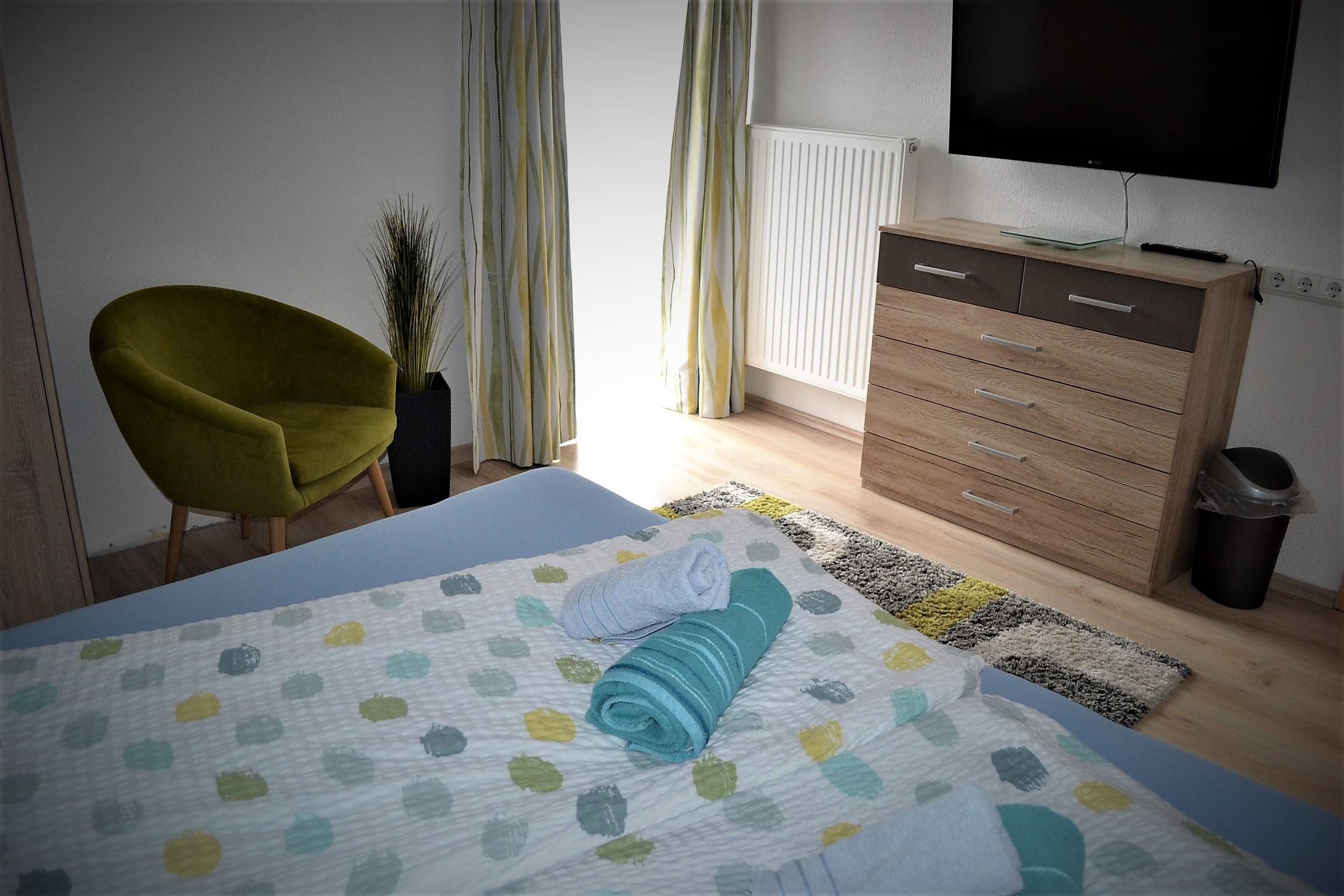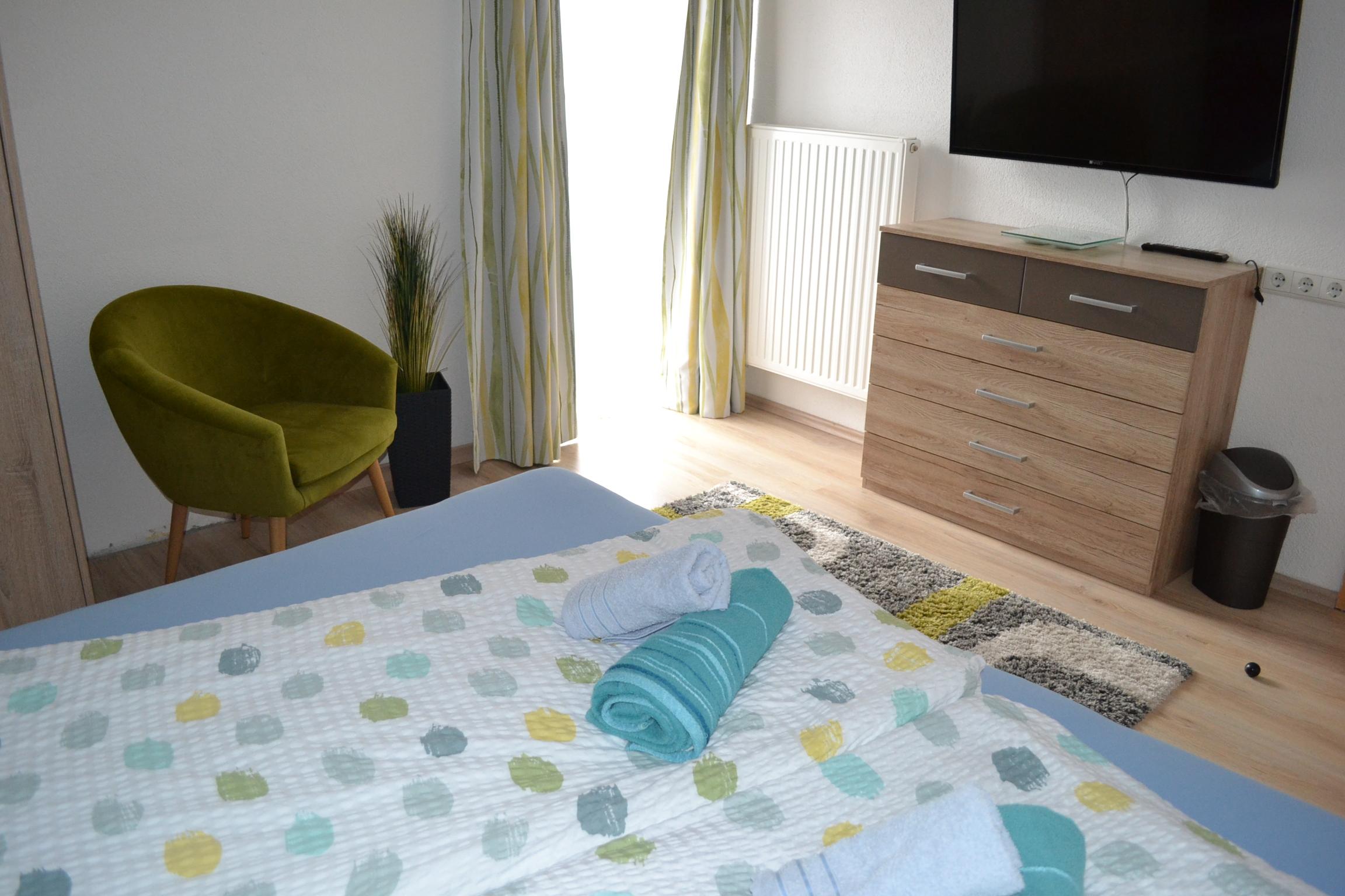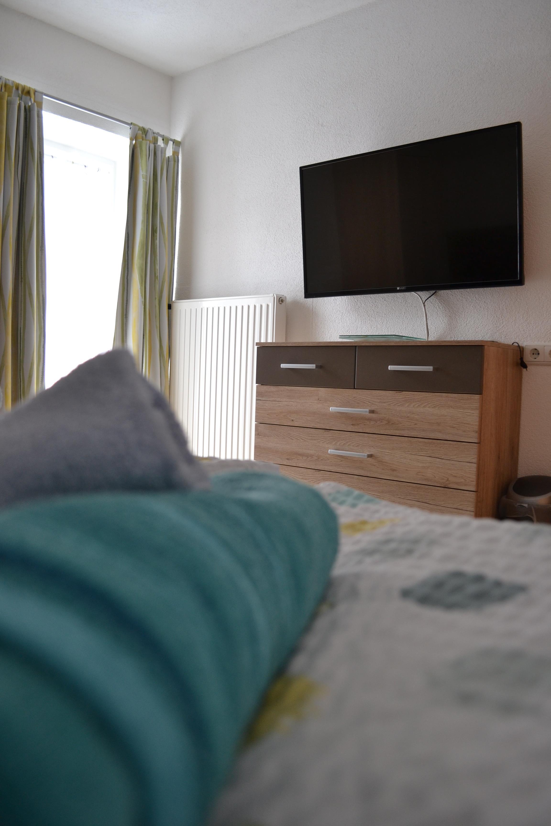 Großes Appartement (ca. 60 m²) besteht aus einem Doppelzimmern mit Wlan-TV, einem weiteren Doppelzimmer, dieses Doppelzimmer ist mit einer Schiebetür von einem Raum mit gemütlicher Wohnlandschaft (Schlafmöglichkeit für die 5. Person) mit Wlan-TV und Schreibtisch abgetrennt, einem Badezimmer mit Badewanne, Dusche/WC, WC separat, großzügige Wohnküche (Cerankochfeld, Backofen, Geschirrspüler, Wasserkocher, Filter-Kaffeemaschine und Tab (Senseo) -Kaffeemaschine, Kühlschrank/Gefrierfach, Mikrowelle, Grundausstattung mit Zucker, Salz, Kaffee usw.) mit TV. Zugang zum möblierten Balkon von einem der Doppelzimmer und der Wohnküche.