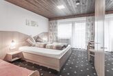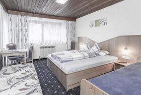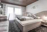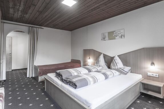 Gemütliches Dreibettzimmer (Doppelbett und Einzelbett) mit Dusche/WC, Flat-TV, Radio, Safe, Wasserkocher und Balkon. Größe: ca. 20 m²