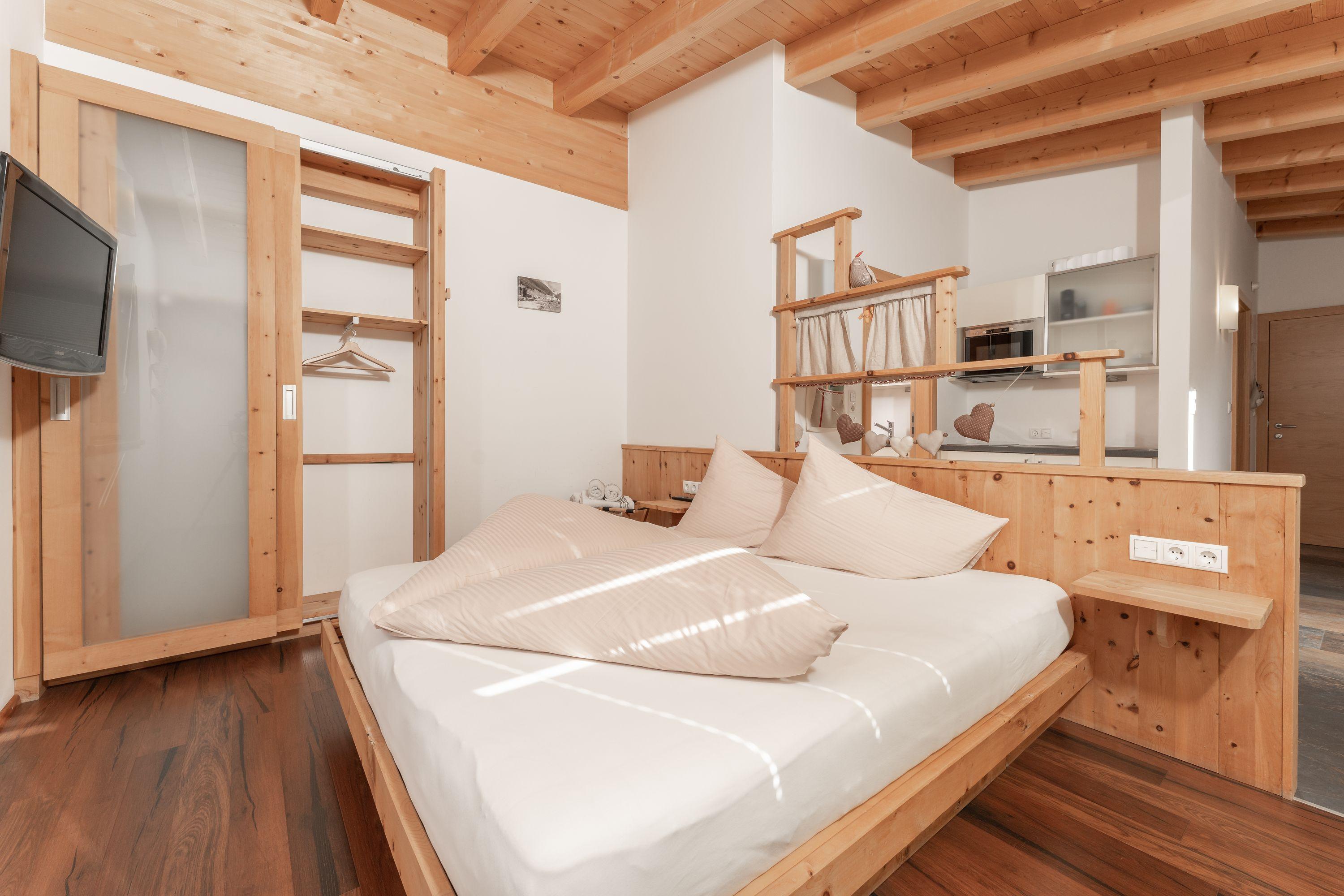 Ihr Doppelzimmerim Dachgeschoss hat 46 m² und verfügt über 1 Schlafraum mit Zirbenholz-Doppelbett, Bad DU/WC, großer Wohnraum mit Sitzecke, Kitchenette und Schlafsofa (für 2 Kinder) und Balkon. Dieses Zimmer hat einen direkten Zugang zum SPA & Wellness Bereich.