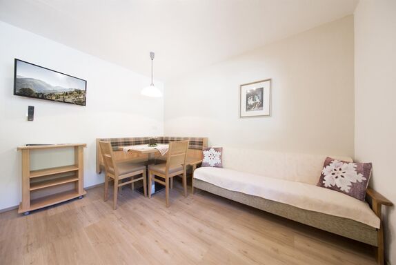 Das neu gestaltete Appartement verfügt über 1 Schlafzimmer mit einem Doppelbett und Einzelbett, Badezimmer mit Dusche und separatem WC, Wohnküche mit voll ausgestatteter Küche, Sofa, Balkon, Flat-TV und W-Lan, Nichtraucher, Safe, Haarfön, grosser Skikeller mit Schuhtrockner. Größe ca. 41 m²