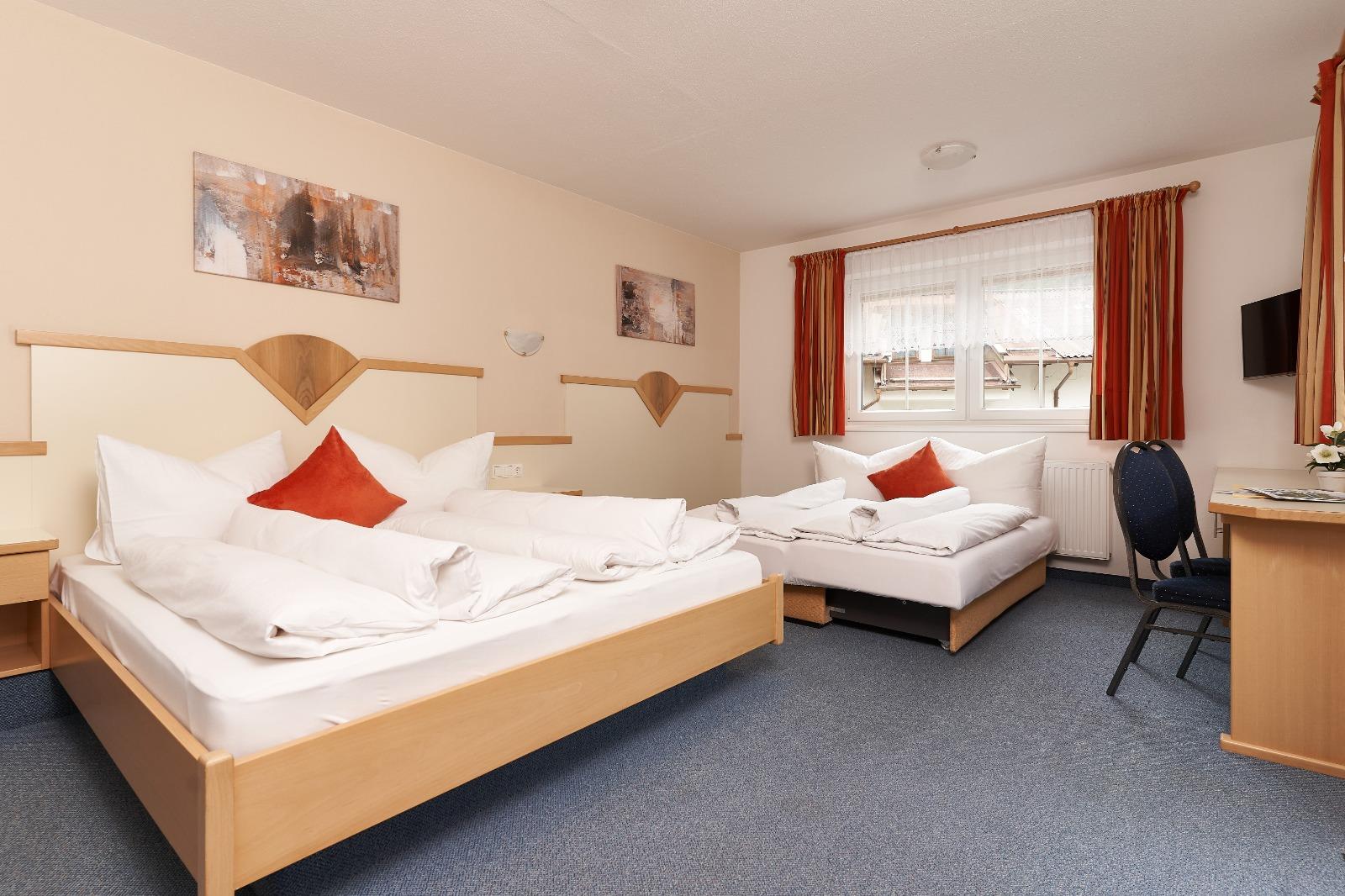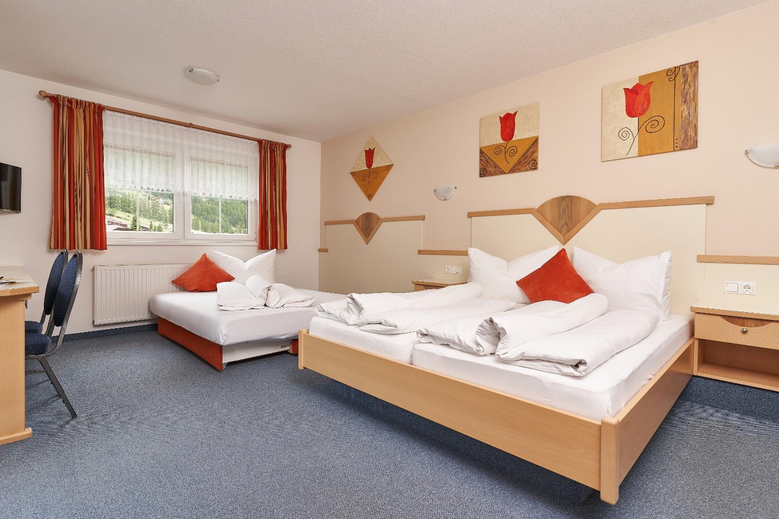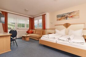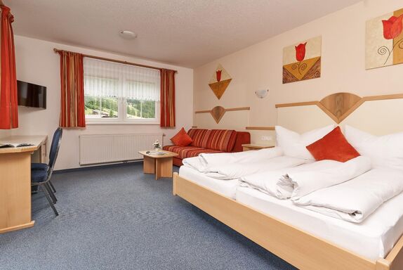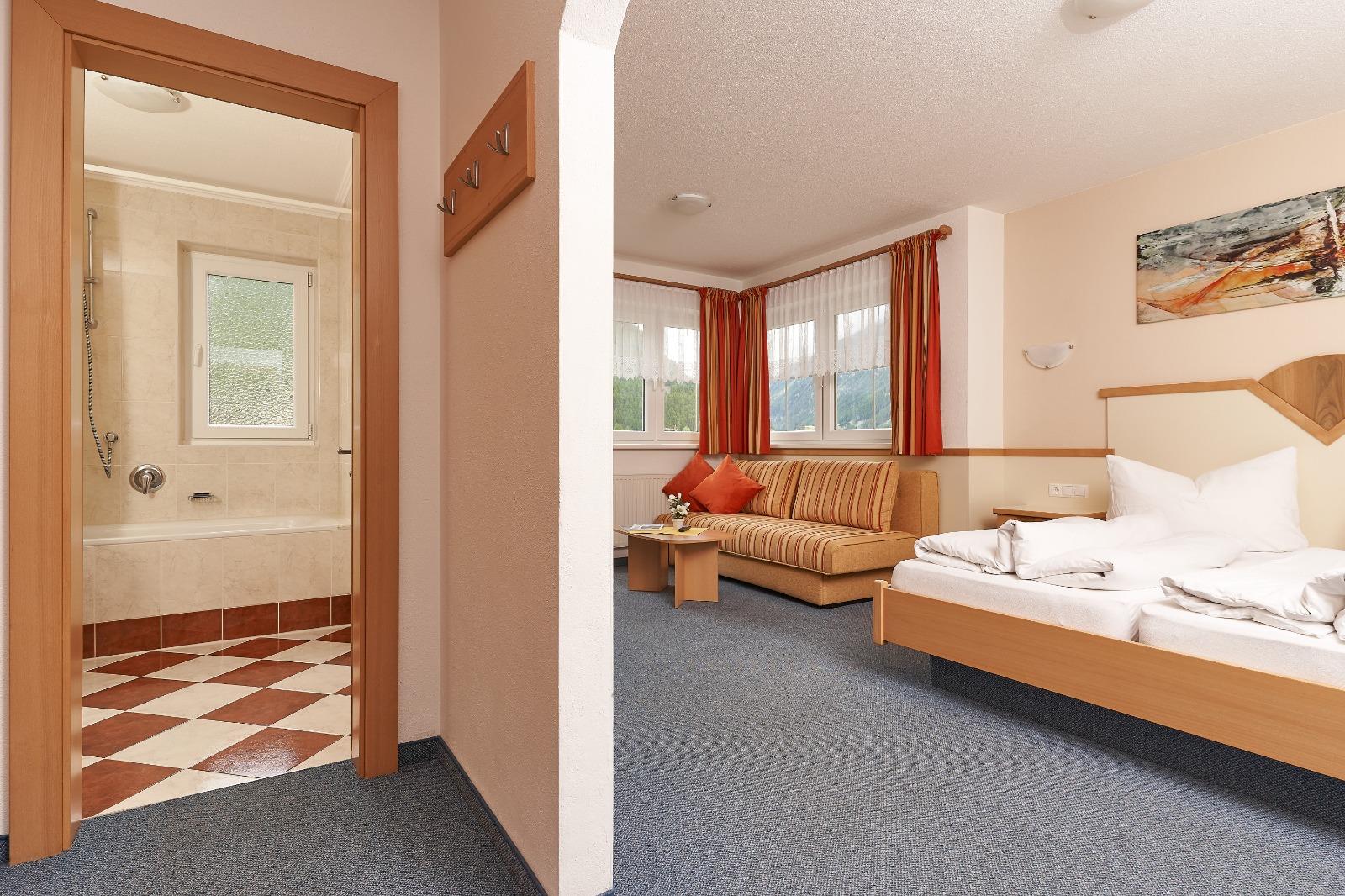Komfortables, grosses Doppelzimmer mit 2 Zusatzbetten, Dusche/WC oder Badewanne/WC, Haarföhn, Kabel-TV, Radio, Safe,W-Lan und Südbalkon. Größe ca. 30 m²