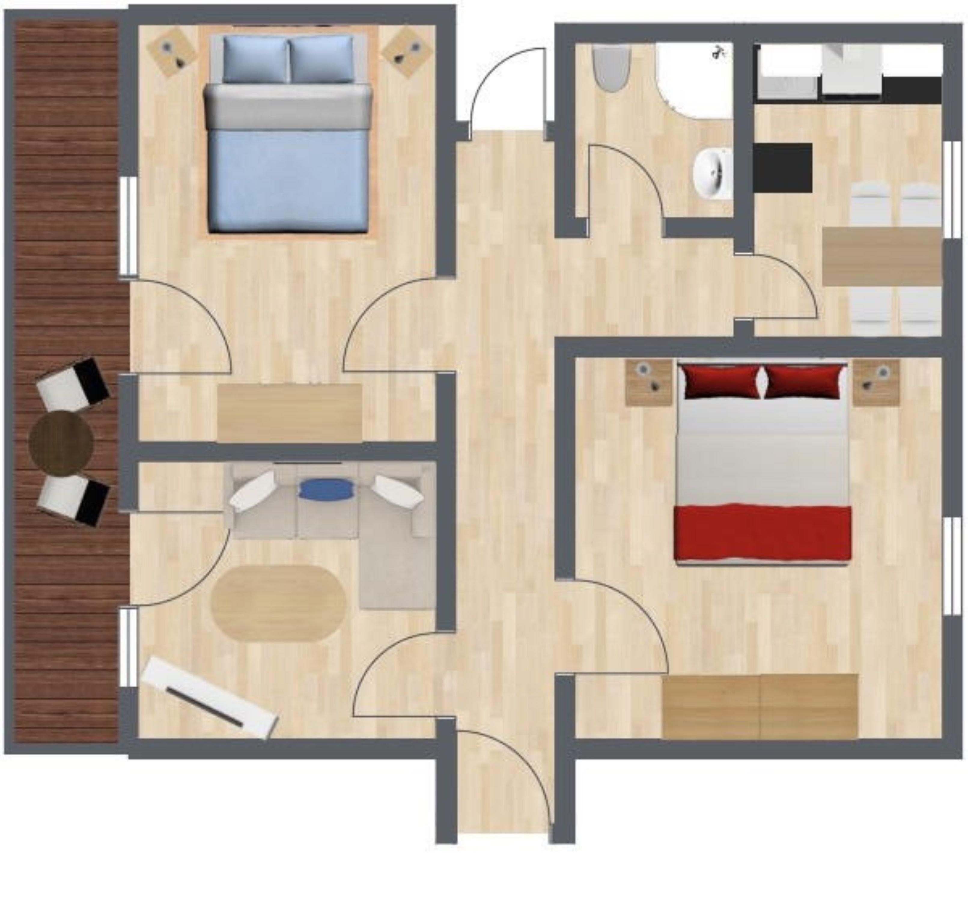 Das Appart Tanja ist ca. 70 m² groß und besteht aus: 2 Doppelzimmer mit Sat-TV, 1 Wohnzimmer mit Couchliege für eine weitere Person und Sat-TV, 2 Badezimmer mit Dusche/WC, 1 separate Küche mit Essbereich, E-Herd mit Backofen, Kühlschrank, Mikrowelle, Kaffeemaschine, Wasserkocher, Toaster, Abstellraum, abgetrennte Wohnungstür und nach Süden ausgerichteter Balkon mit herrlichem Blick auf die Berge.