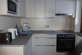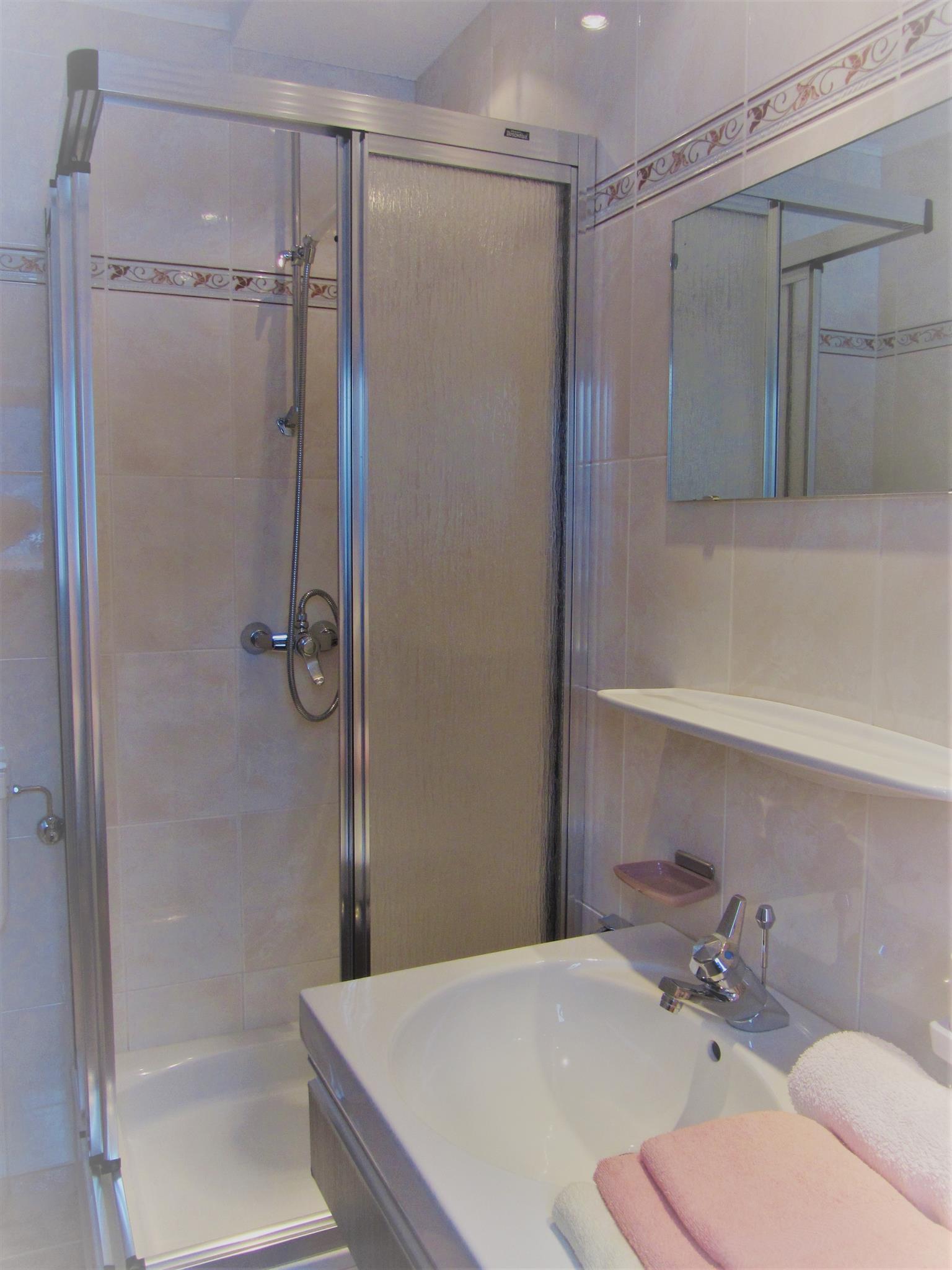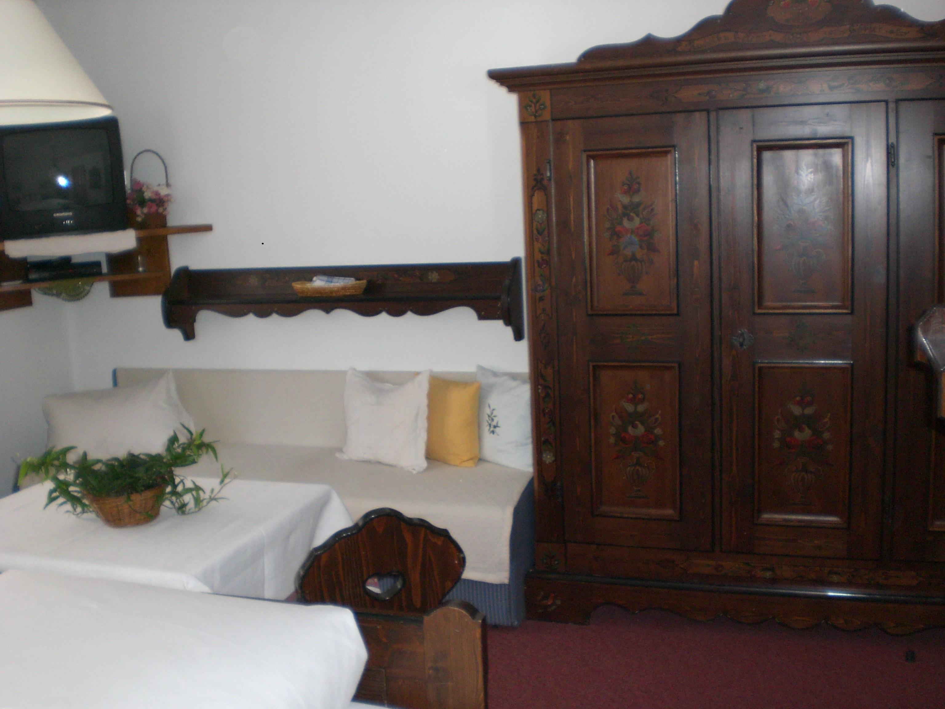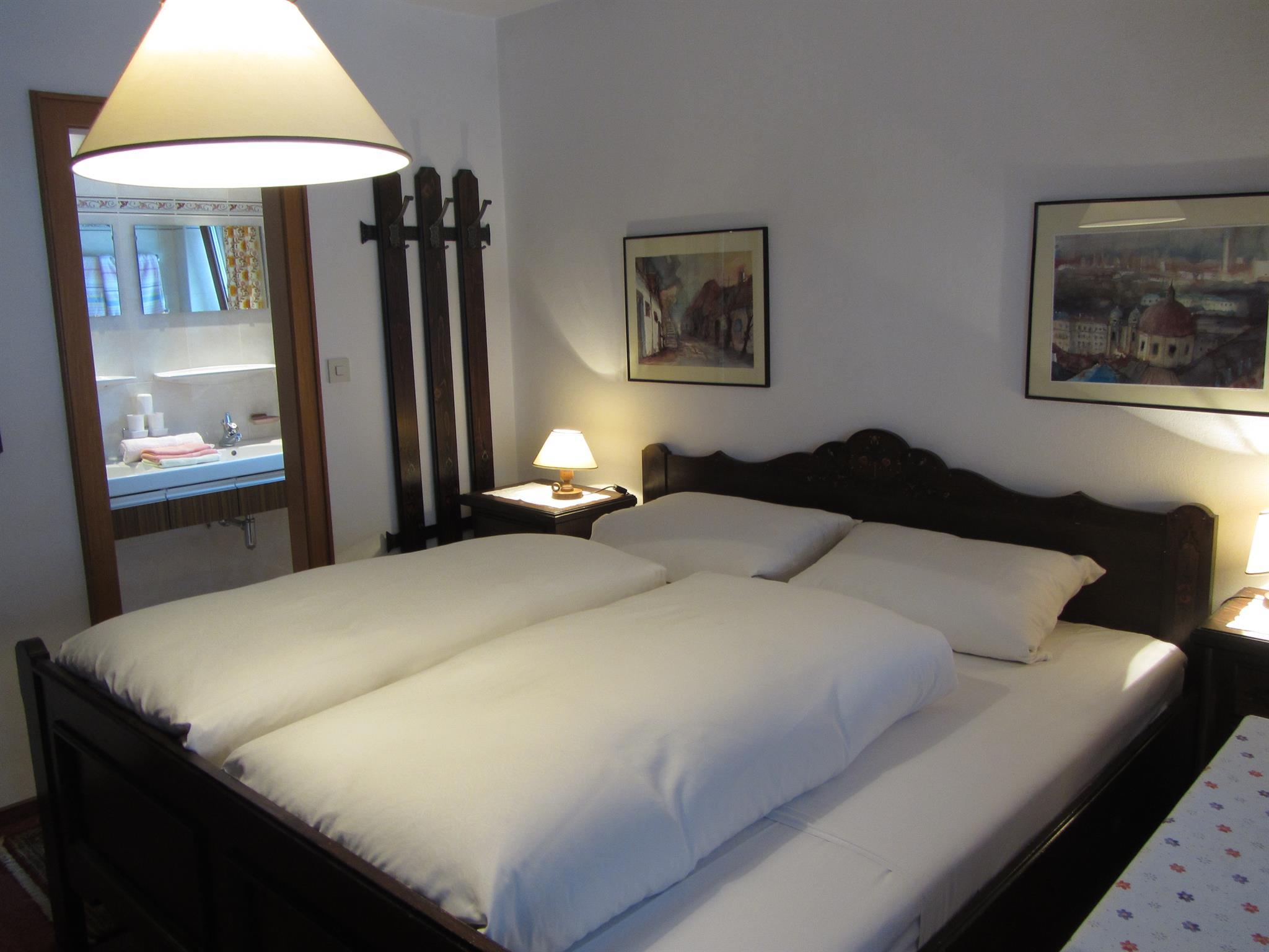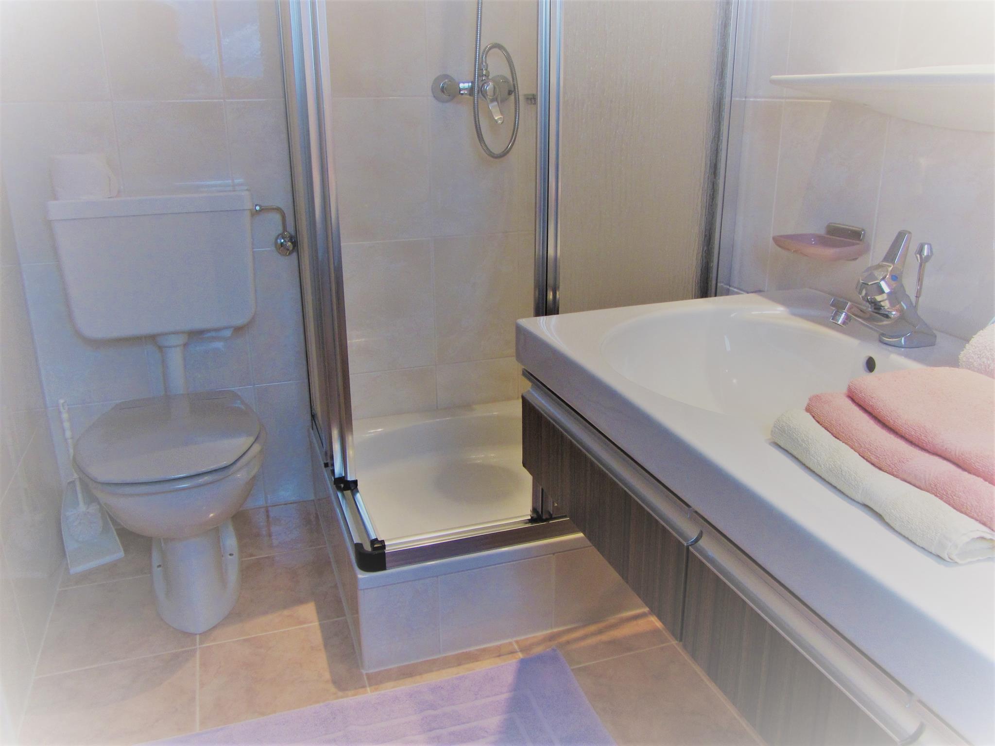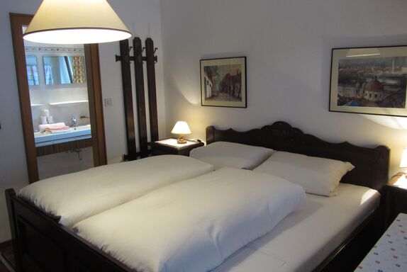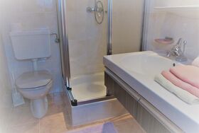 Die Ferienwohnung im ersten Stock mit ca. 80 m² besteht aus: 3 Doppelzimmern (1x mit zusätzlicher Schlafcouch) jedes Zimmer mit Dusche/WC, Sat-TV, Safe und Balkon, sowie einem schönen Aufenthaltsraum mit vollausgestatteter Küche und großer Terrasse.