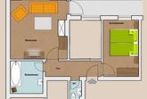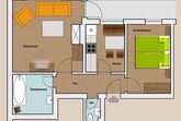 Appartement/Suite Smaragd im 1. Stock mit ca. 42 m² besteht aus 1 Doppelzimmer (Betten auf Anfrage getrennt möglich); 1 Wohnraum mit Schlafcouch für 2 weitere Personen, Sat-TV und Safe; 1 vollausgestattete Küche mit Elektroherd, Kühlschrank, Geschirr, Wasserkocher, Kaffeemaschine, Essbereich uvm., 1 Vorraum; 1 Badezimmer mit Badewanne oder Dusche; 1 seperates WC. Das Appartement verfügt über einen Balkon.