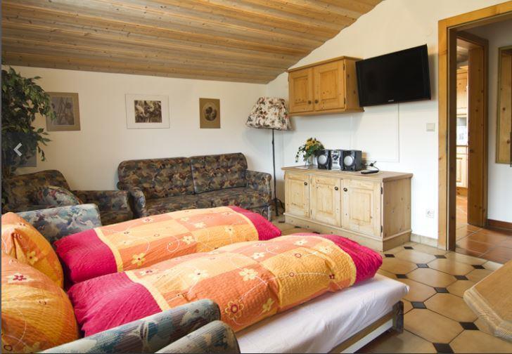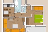 Appartement/Suite Rubin im 1. Stock mit ca. 49 m² besteht aus: 1 Doppelzimmer mit einem Zusatzbett; Wohnzimmer mit Couchen für 3 weitere Personen, Sat-TV, Radio-CD; 1 Badezimmer mit Dusche; 1 vollausgestattete Küche mit Elektroherd, Kühlschrank, Geschirr, Wasserkocher, Kaffeemaschine, Essbereich uvm.; 1 separates WC; Vorraum und Balkon.