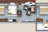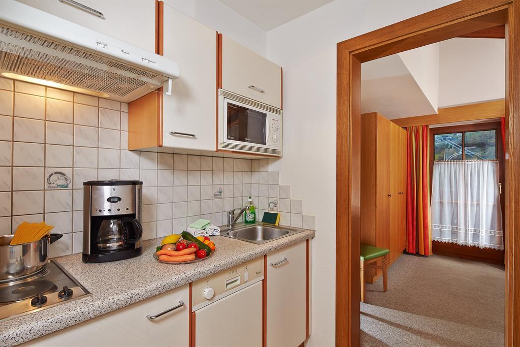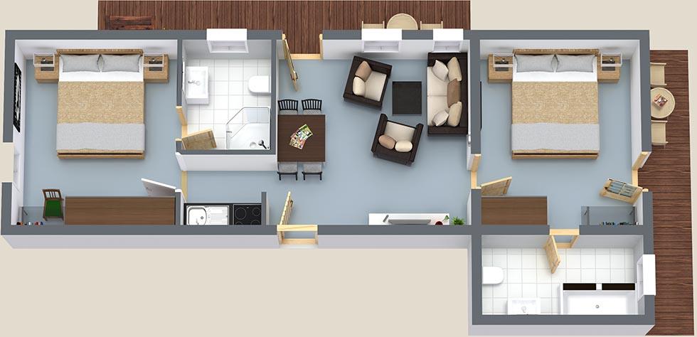 Appartement für bis zu 4 Personen mit ca. 55 m²: 2 Doppelzimmer mit je einem Badezimmer mit Dusche/WC; vollausgestattete Wohnküche mit Küchenzeile (Elektroherd ohne Backrohr, Spühlmaschine, Mikro, Kaffeemaschine, Kühlschrank, Wasserkocher, Toaster uvm.) mit Essplatz. Genießen Sie die Sonnenstrahlen am Balkon.