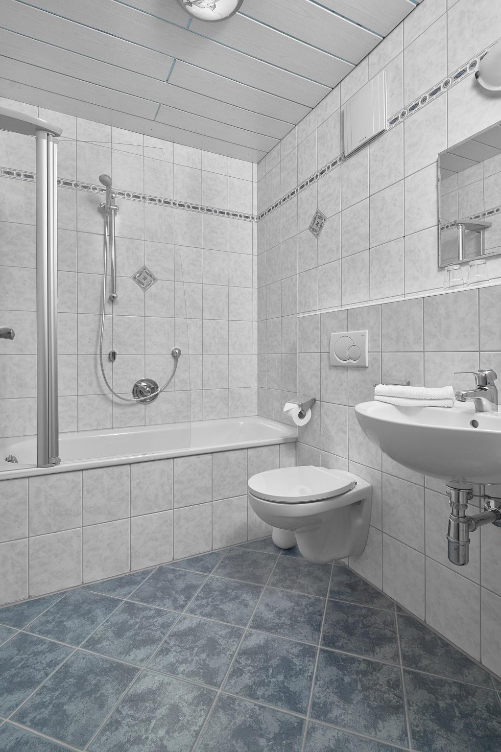 • 1 Schlafzimmer mit Doppelbett, Schlafsofa und eigenem Badezimmer (Badewanne, WC, Waschbecken)