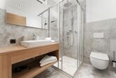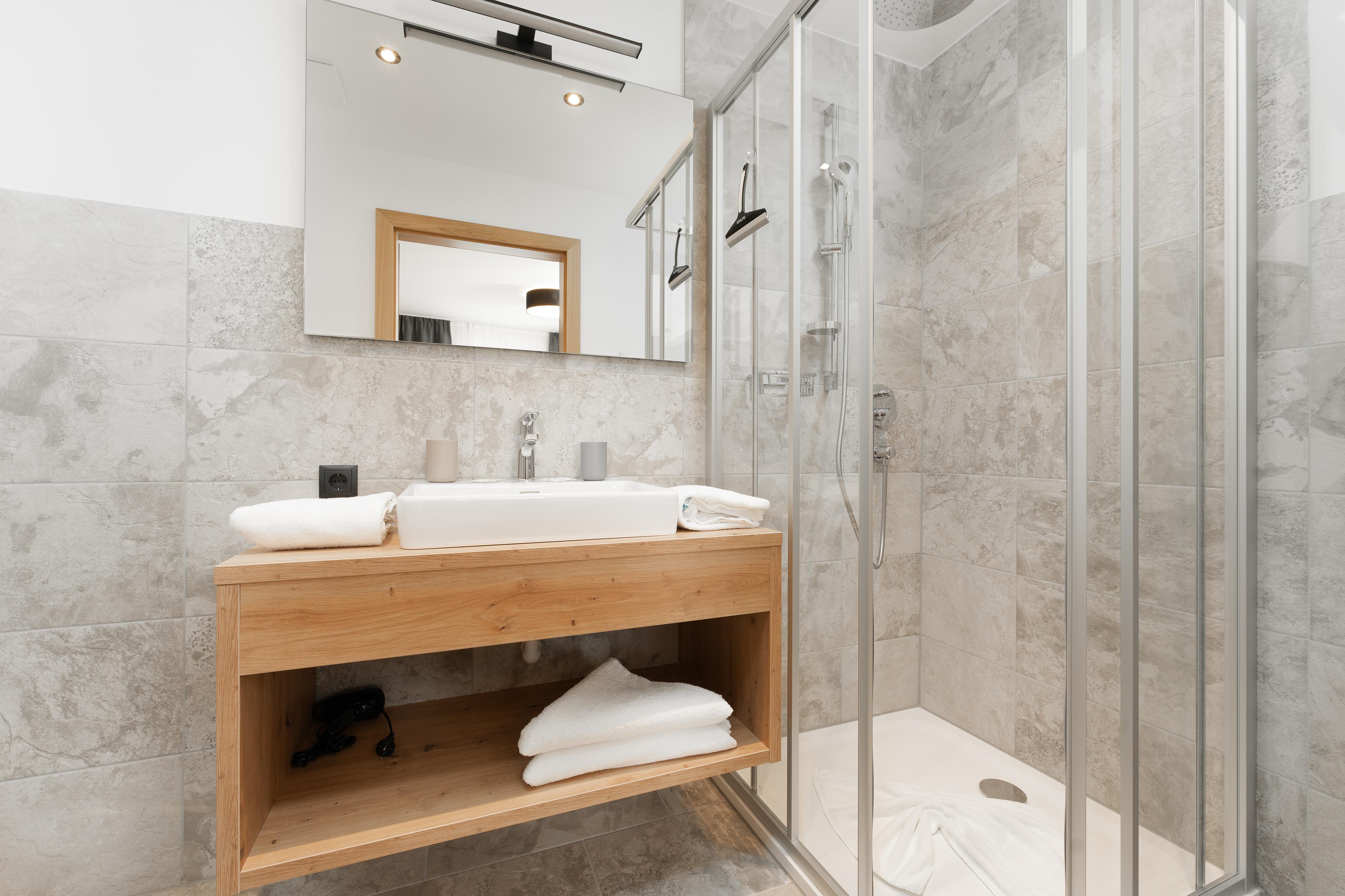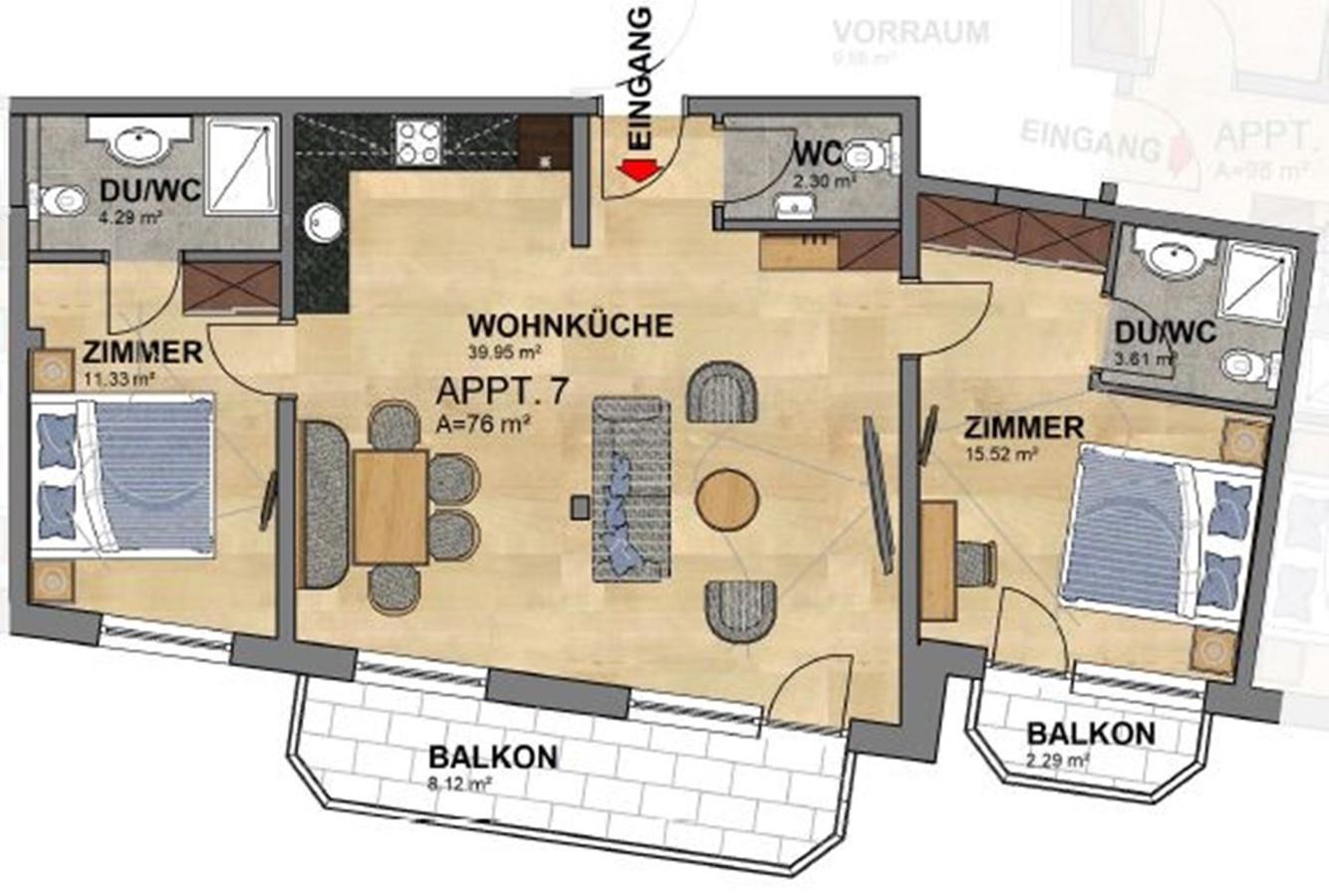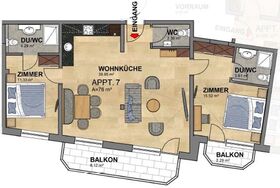 Top 7 mit ca. 77 m²: 2 Doppelzimmer, 2 Badezimmer mit Dusche/WC, 1 separates WC, gemütliche Wohnküche mit Schlafsofa für 2 Personen, vollausgestattete Küchenzeile mit Cerankochfeld, Backofen, Kühlschrank, Mikrowelle, Kaffeemaschine uvm., 2 Balkone.