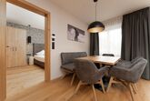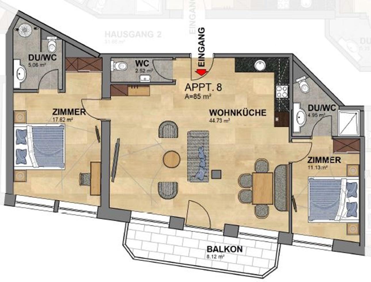 Top 8 mit ca. 86 m²: 2 Doppelzimmer, 2 Badezimmer mit Dusche/WC, 1 separates WC, großzügige Wohnküche mit Schlafsofa für 2 Personen, vollausgestattete Küchenzeile mit Cerankochfeld, Backofen, Kühlschrank, Mikrowelle, Kaffeemaschine uvm., 8 m² Balkon.