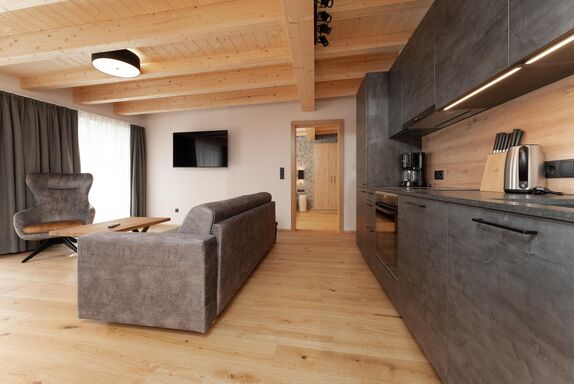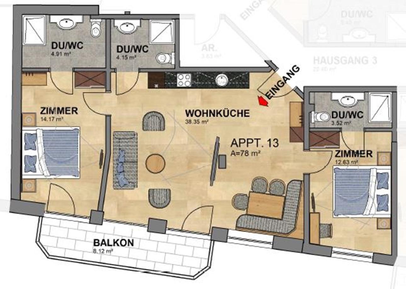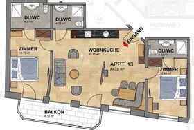 Top 13 mit ca. 79 m²: 2 Doppelzimmer, 3 Badezimmer mit Dusche/WC, großzügige Wohnküche mit Schlafsofa für 2 Personen, Essbereich, vollausgestattete Küchenzeile mit Cerankochfeld, Backofen, Kühlschrank, Mikrowelle, Kaffeemaschine uvm., 8 m² Balkon.