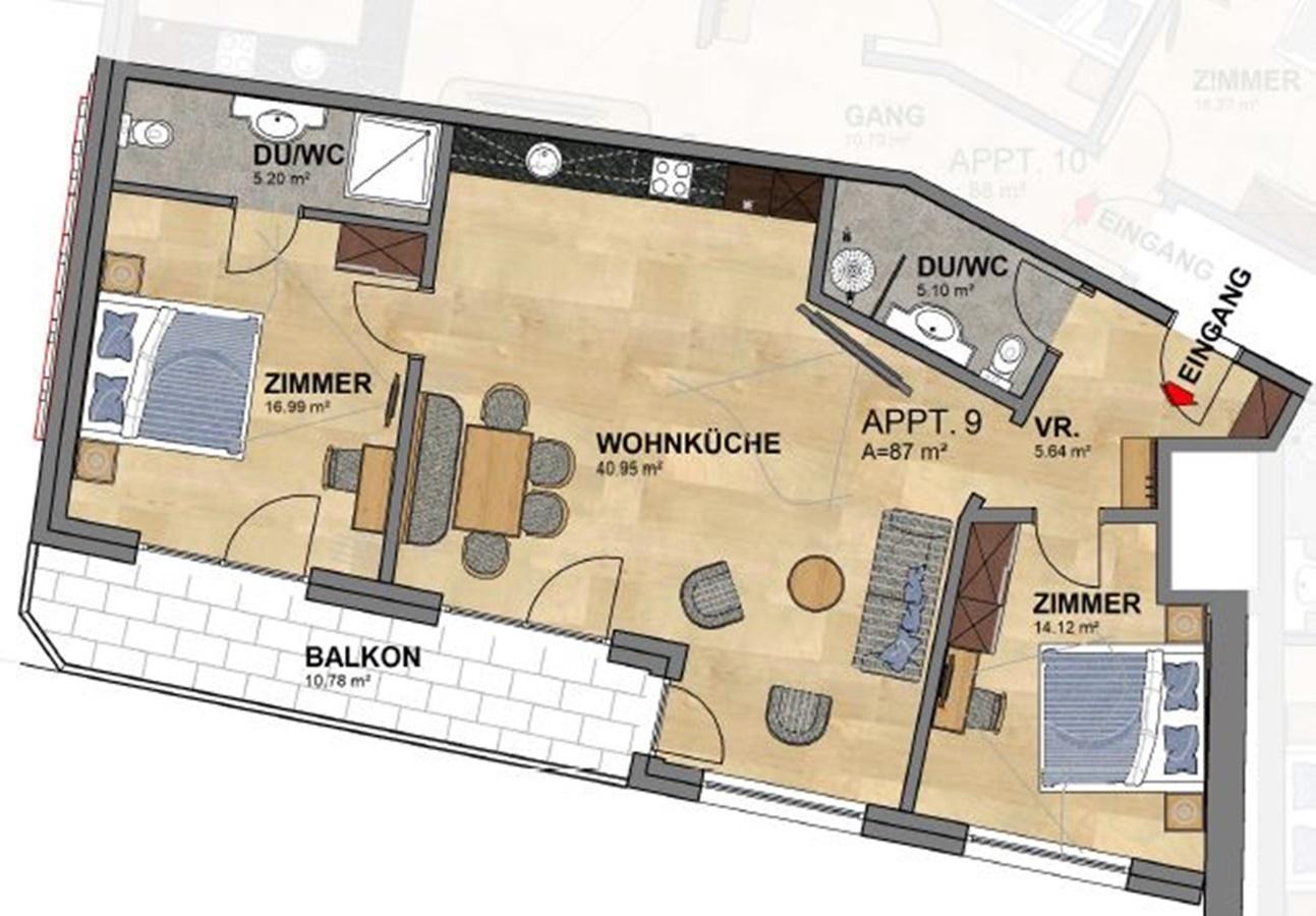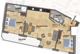 Top 9 mit ca. 88 m²: 2 Doppelzimmer, 2 Badezimmer mit Dusche/WC, großzügige Wohnküche mit Schlafsofa für 2 Personen, Essbereich, vollausgestattete Küchenzeile mit Cerankochfeld, Backofen, Kühlschrank, Mikrowelle, Kaffeemaschine uvm., 10 m² Balkon.