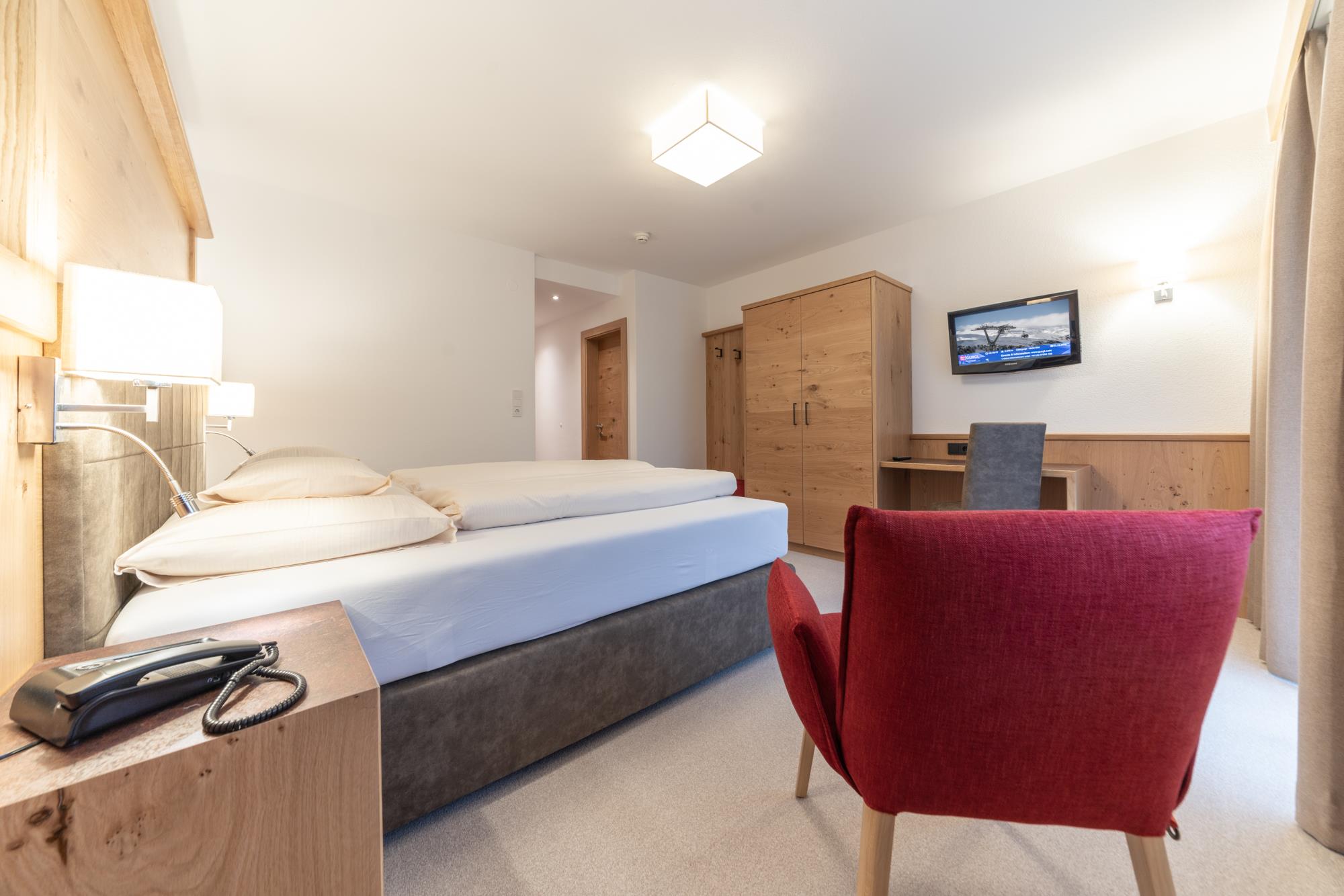 Komfortable Doppelzimmer ohne Balkon mit ca. 22 m², Badewanne mit Duschglaswand und Haarfön, separates WC, Flat-TV, Telefon. Ruhige Lage - zur Hausrückseite (eingeschränkte Aussicht)