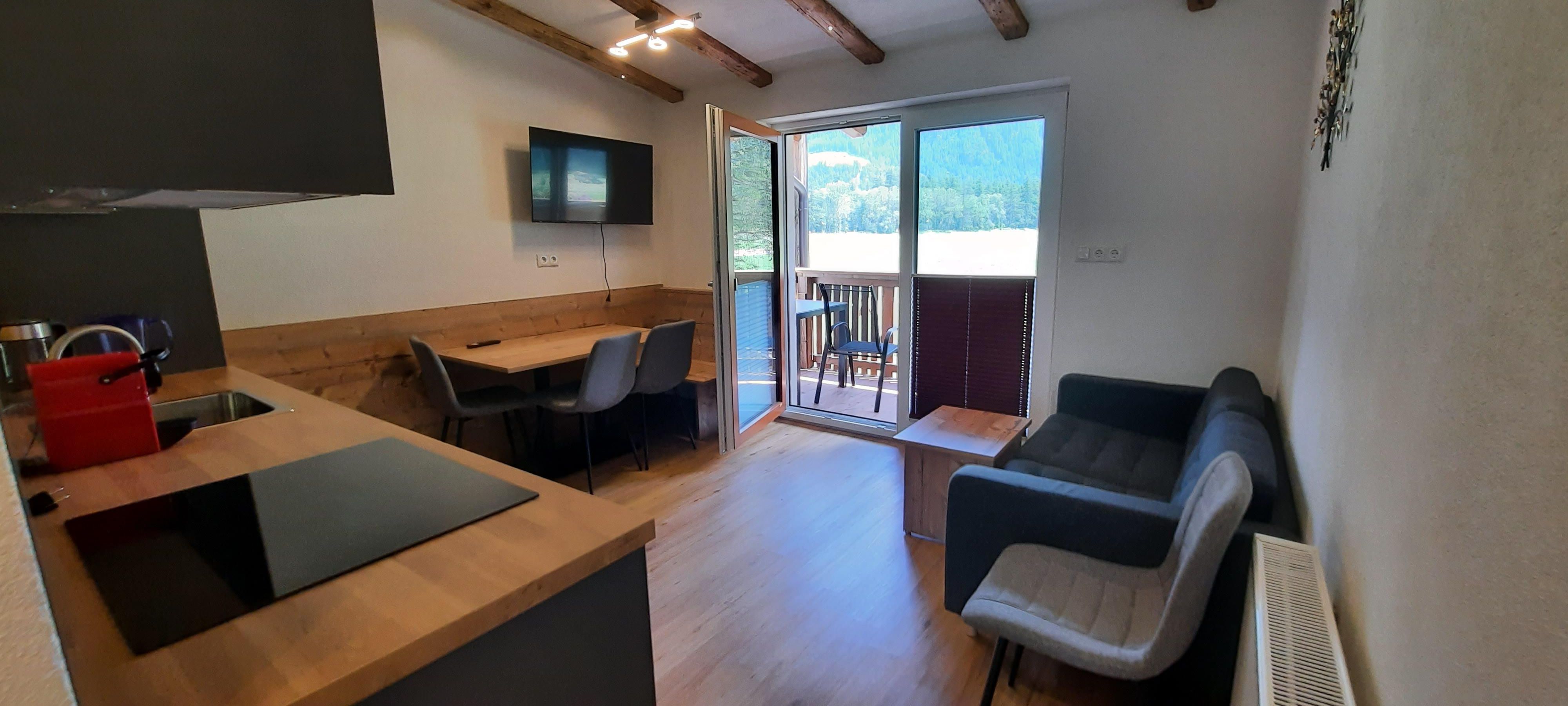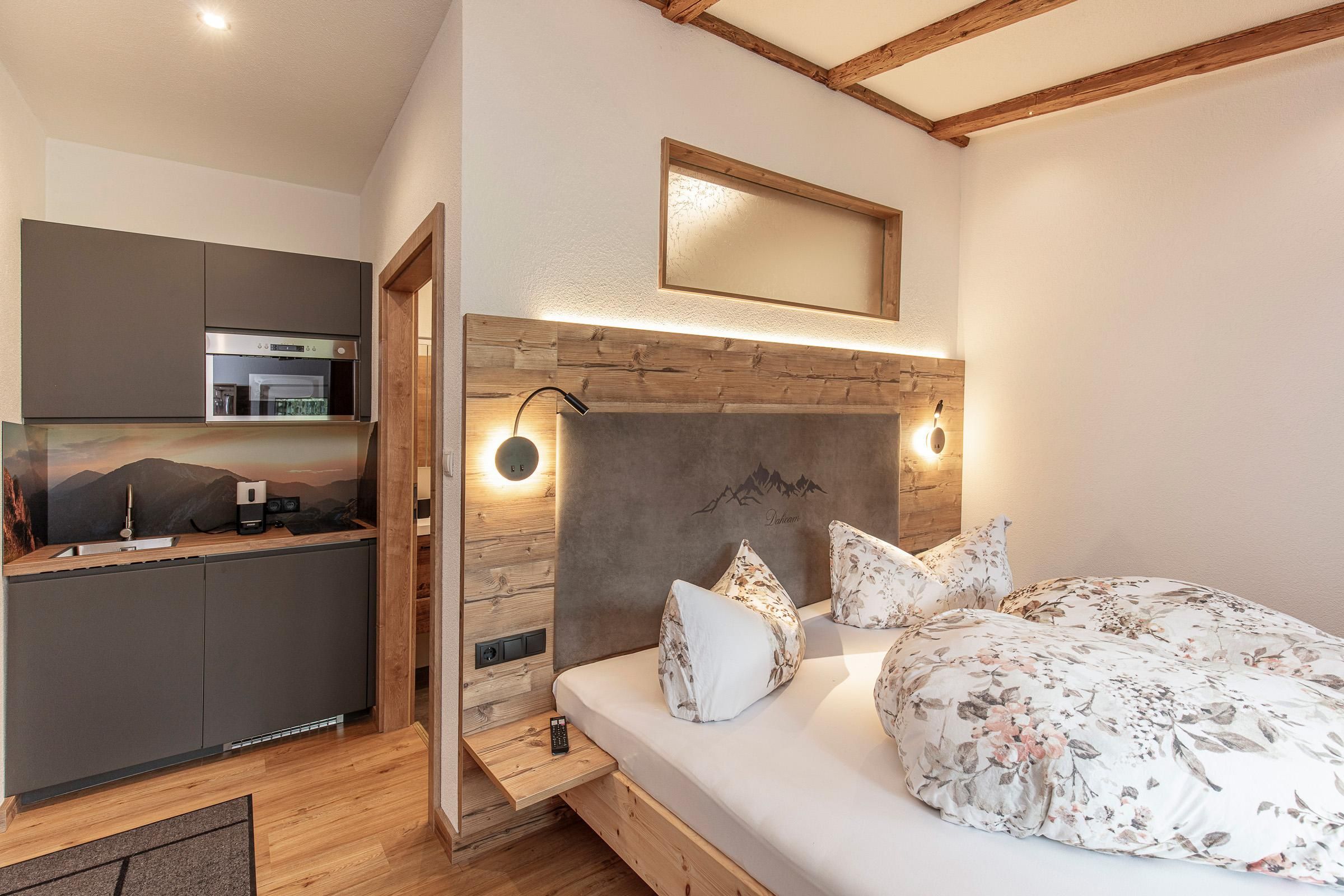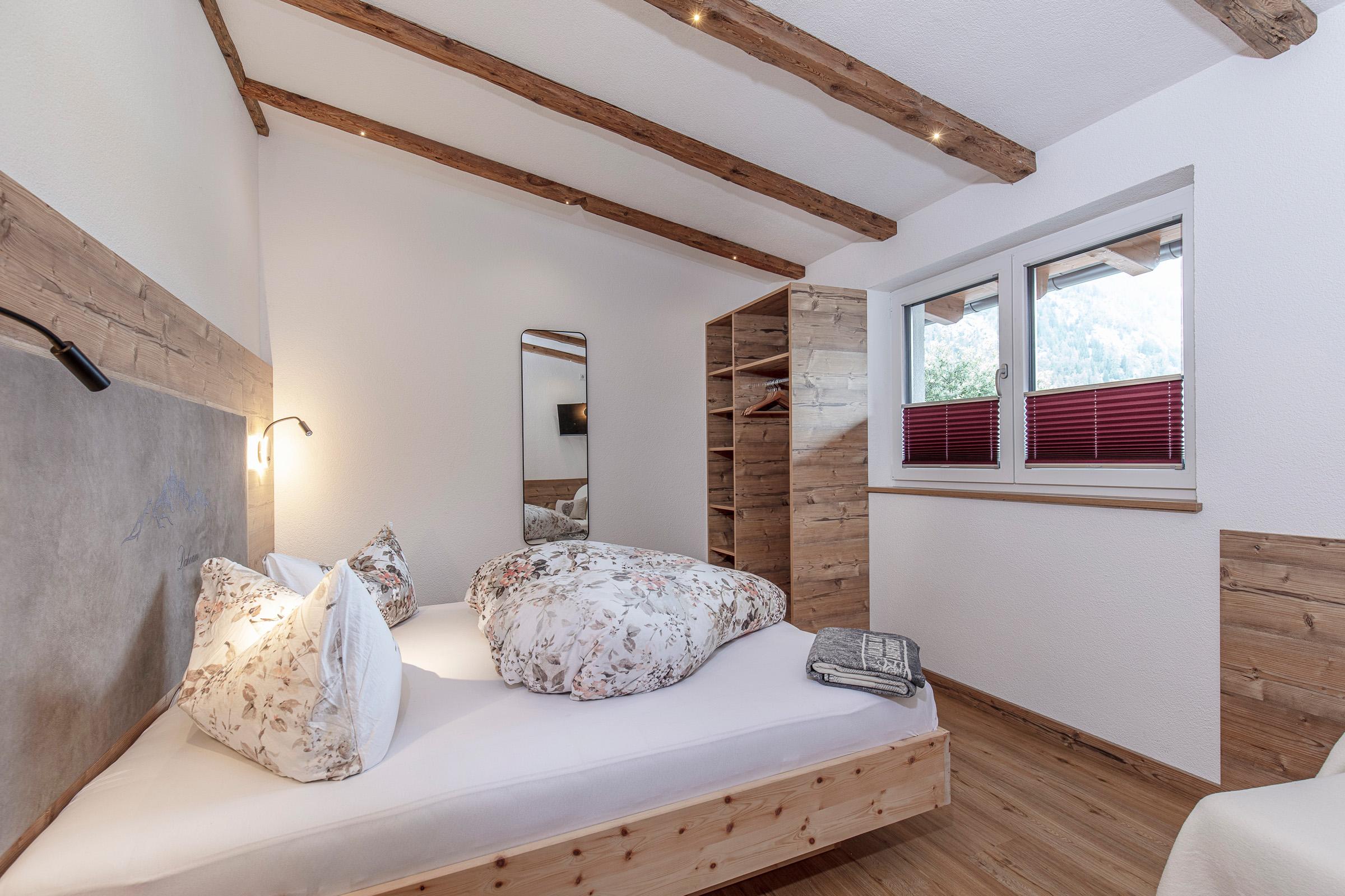 Die Ferienwohnung Dahoam (ca. 70 m²) besteht aus zwei Doppelzimmern, einem Badezimmer mit Dusche/WC und einer vollausgestatteten Wohnküche (Induktionskochfeld, Backrohr, Geschirrspülmaschine, Kühlschrank/Gefrierfach, Nespresso-Kaffee Maschine, Wasserkocher uvm.) mit Sat-TV und Couch. Mit einem faszinierenden Ausblick auf den Hauerkogel und die Ötztaler Alpen rückt der stressige Alltag auf unserem möblierten Balkon schnell in den Hintergrund.