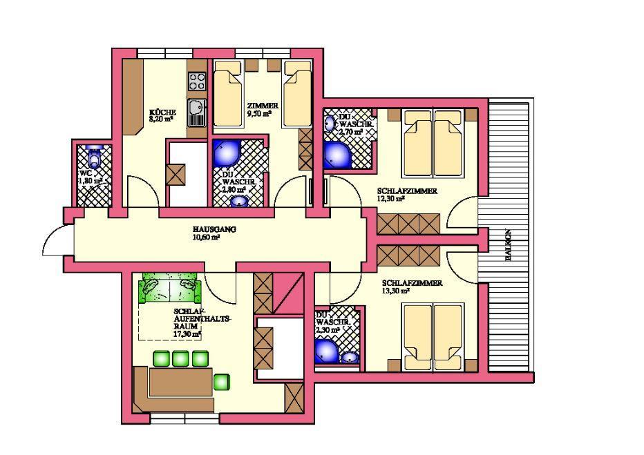 Ferienwohnung mit Balkon und ca. 125 m²: 2 Doppelzimmer, 1 Zweibettzimmer, je ein Badezimmer mit Dusche; separates WC, zwei weitere Doppelzimmer mit je einem Badezimmer mit Dusche/WC befindet sich außerhalb der Einheit auf der gleichen Etage. Gemütliches, rustikales Wohnzimmer mit großzügiger Essecke, Radio, Sat-TV und Sofa. Vollausgestattete Küche mit Cerankochfeld, Backrohr, Kühlschrank, Gefrierfach, Mikrowelle und Geschirrspüler, Kaffeemaschine, Staubsauger uvm.