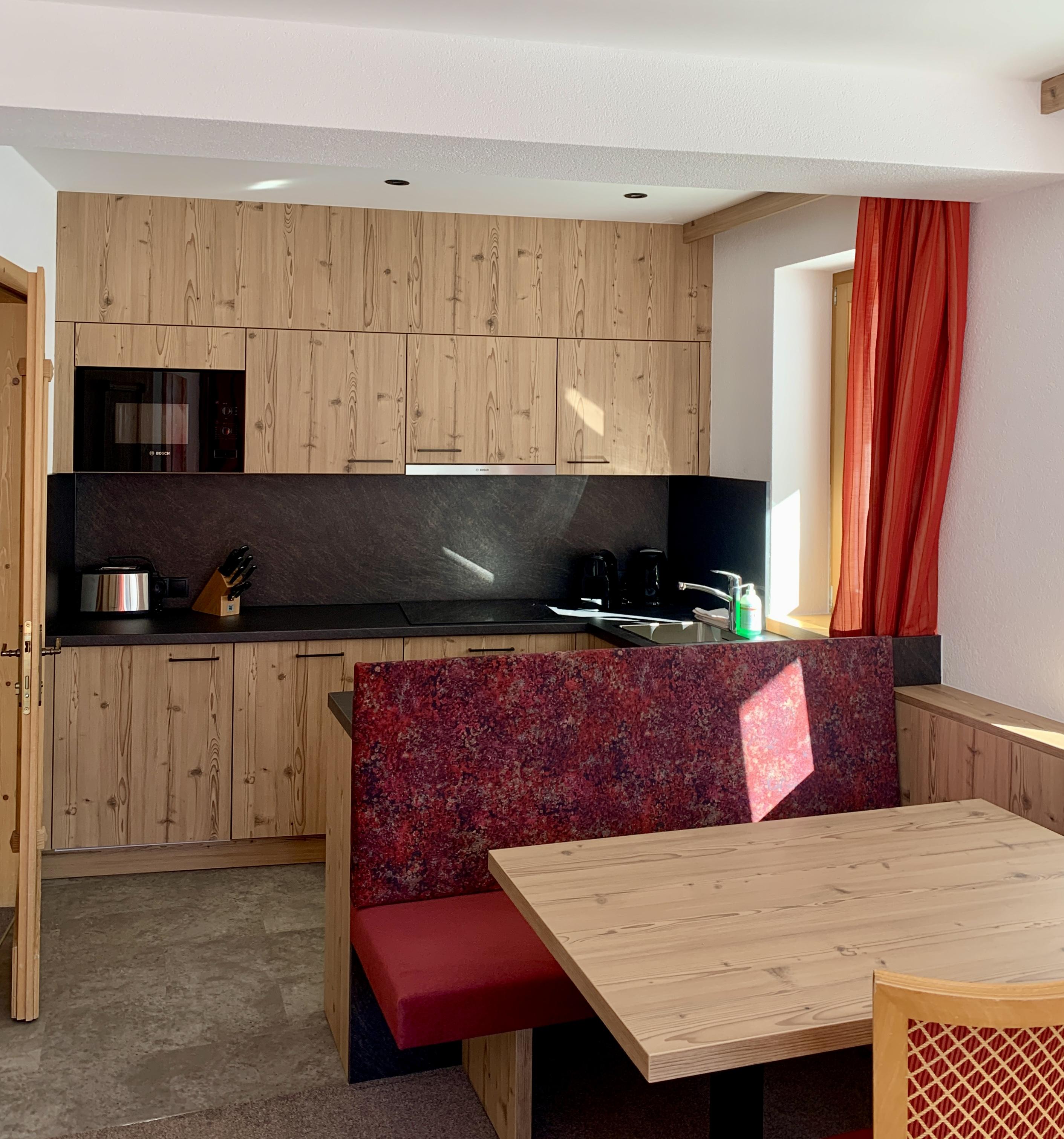 Apartment mit ca. 50 m² für 2-4 Personen mit südgerichteter Terrasse und Bergblick. Bestehend aus 1 Doppelzimmer mit Kabel-TV/Flat-Screen und Zimmersafe; 1 Wohn- Schlafraum mit Doppelschlafsofa, Kabel-TV mit Flat-Screen, Kochnische mit Kühlschrank, 4-Platten-Herd, Mikrowelle, Toaster, Kaffeemaschine, Besteck, Küchen- und Essgeschirr sowie Essecke; Badezimmer mit Wanne, Fön, Kosmetikprodukte und -spiegel. WC separat; Das Apartment ist im Erdgeschoß gelegen und über einen separaten Eingang von außen zu erreichen.