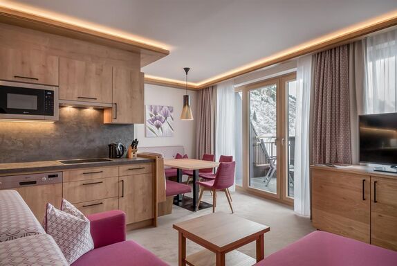 Neues Apartment Panorama (ca. 50 m²). Ideal für Menschen die Unabhängigkeit und Platz im Urlaub lieben. Doppelzimmer, offener Wohnbereich mit Küchenzeile (4-Platten-Herd, Kühlschrank, Mikrowelle, Toaster, Kaffeemaschine, Küchen- und Essgeschirr, Besteck), Essecke und ausziehbarer Couchecke mit Schlafsofafunktion zum Entspannen. Badezimmer mit Badewanne und Dusche, Pflegeprodukte, Haarfön, Kosmetikspiegel und separatem WC. Weitere Ausstattung: zwei Kabel-TV mit Flat-Screen, Selbstwahltelefon und Zimmersafe.
