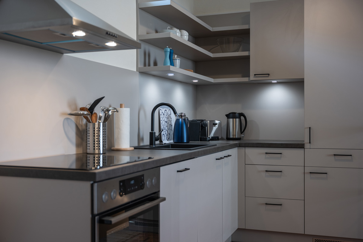 Gemütliche Essküche mit Esstisch und voll ausgestatteter Küche sowie Garderobe, Bad mit Dusche und extra Toilette. Ein paar Stufen weiter oben befindet sich das Wohn-Schlafzimmer mit Boxspringbett und einer großen Schlafcouch, Schreibtisch und Fernseher.