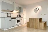 Die Küchenzeile ist ausgestattet mit: Kühlschrank, Gefrierfach, Geschirrspülmaschine, Backofen, Kaffeemaschine, Wasserkocher, Elektroherd, Toaster, Töpfe, Besteck, Geschirr