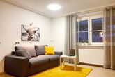 1 Wohnzimmer mit einer sehr bequemen ausziehbaren Couch, SAT-TV, Küchenzeile und Esstisch.