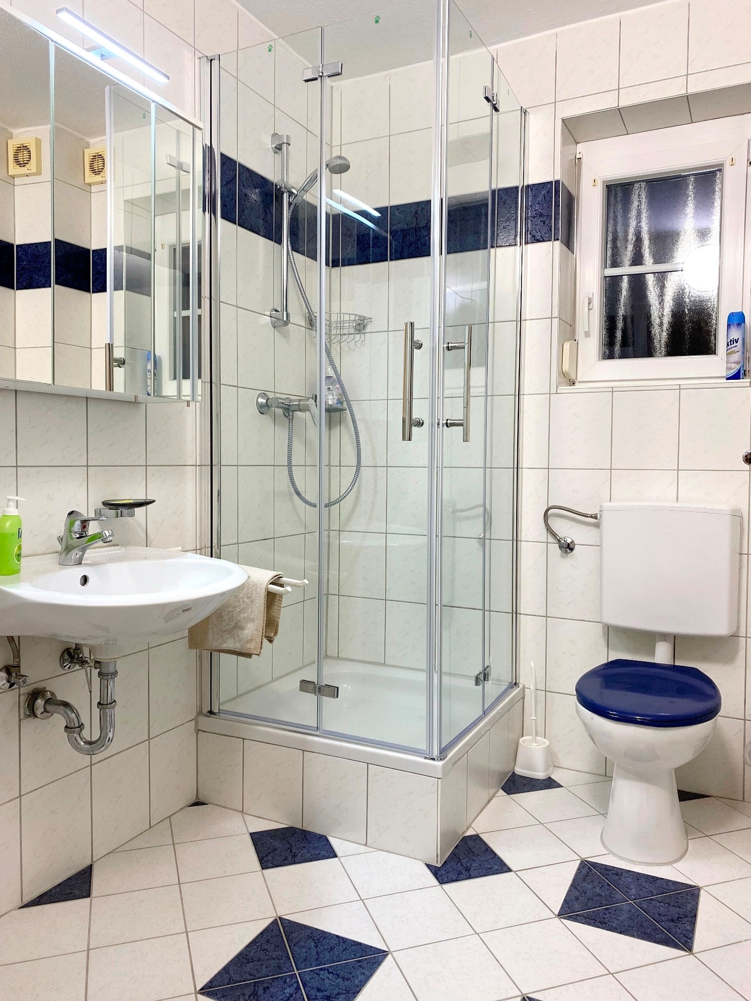 1 Badezimmer mit WC, Dusche, frischen Handtüchern und Haartrockner.