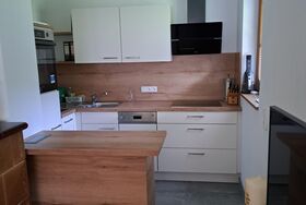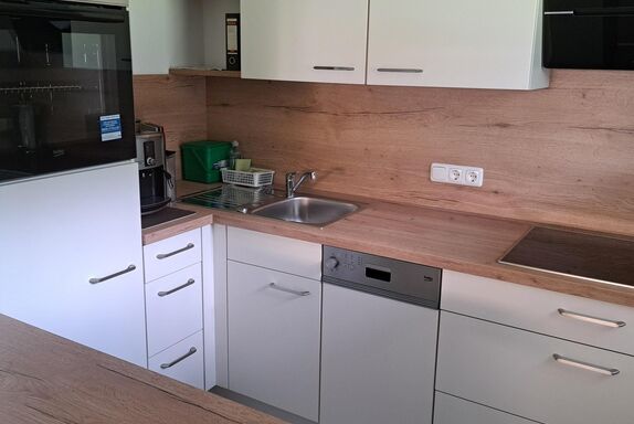 Küche mit Ess-/Wohnbereich: Induktionsherd, Backofen, Kühlschrank mit Gefrierfach, Geschirrspüler, Kaffeemaschine, Sat-TV, Radio