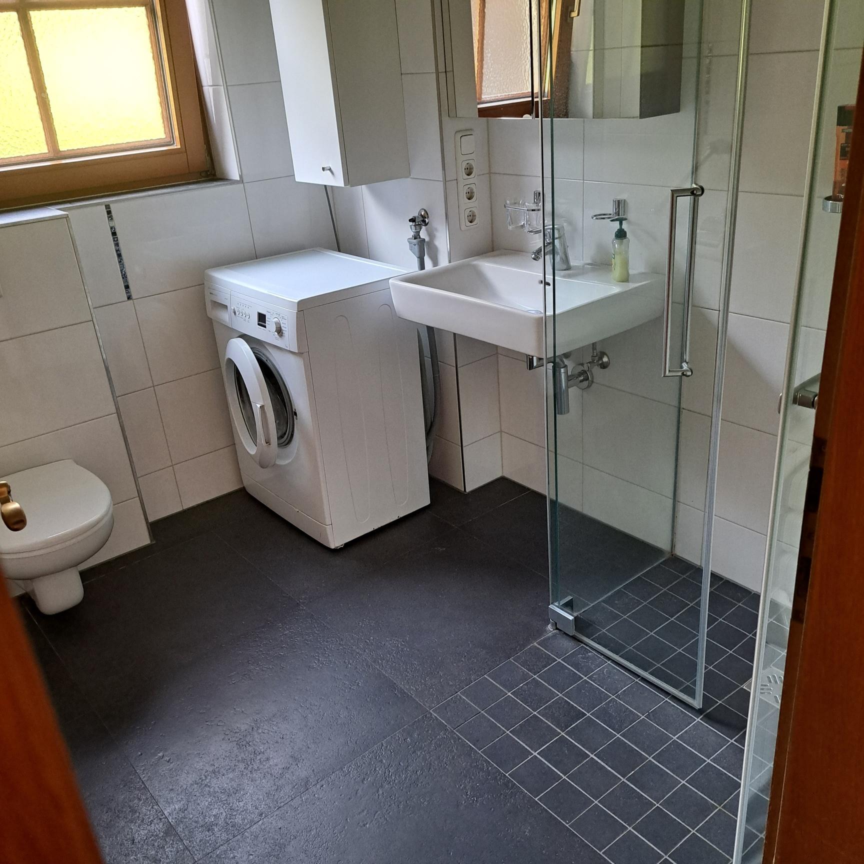 Badezimmer mit Waschbecken, WC, Dusche