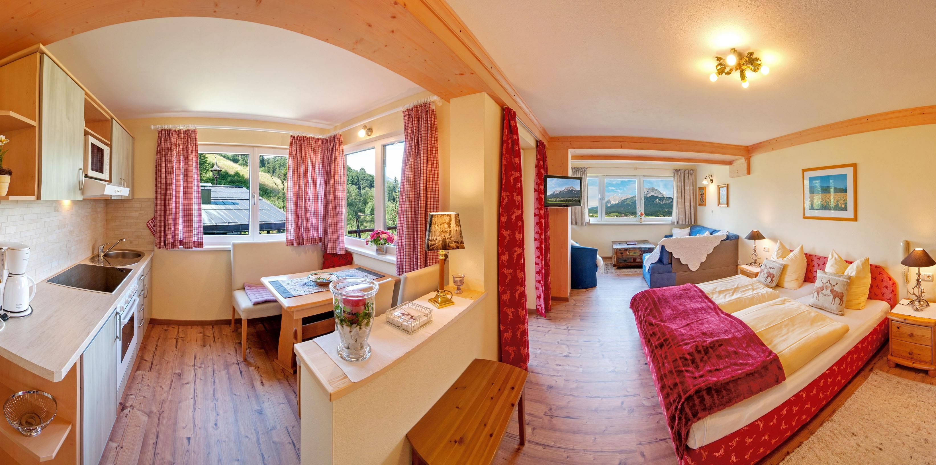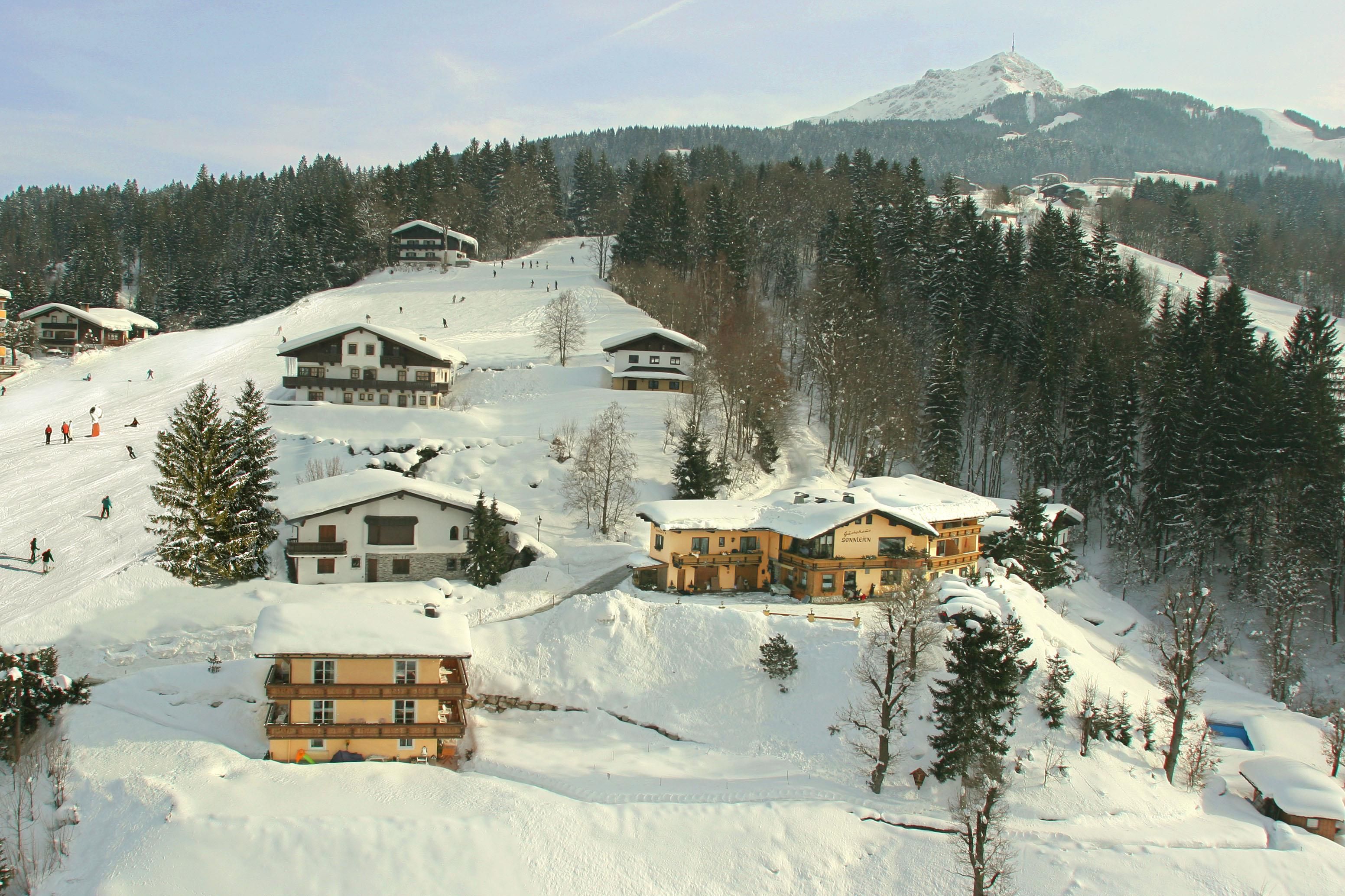 Romantik Aparthotel Sonnleitn – Traumlage in den Kitzbüheler Alpen! Am Hang des Kitzbüheler Horns mit schönster Aussicht zum Wilden Kaiser befindet sich in ruhiger Südwesthanglage – ca. 30 Meter über St.Johann das „Sonnleitn“.