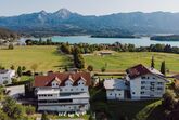 Unser Haus liegt auf einer Erhebung mit einem wunderschönen Rundblick. Südseitig mit Blick auf den Faaker See (ca. 8 Gehminuten) und die Karawanken.