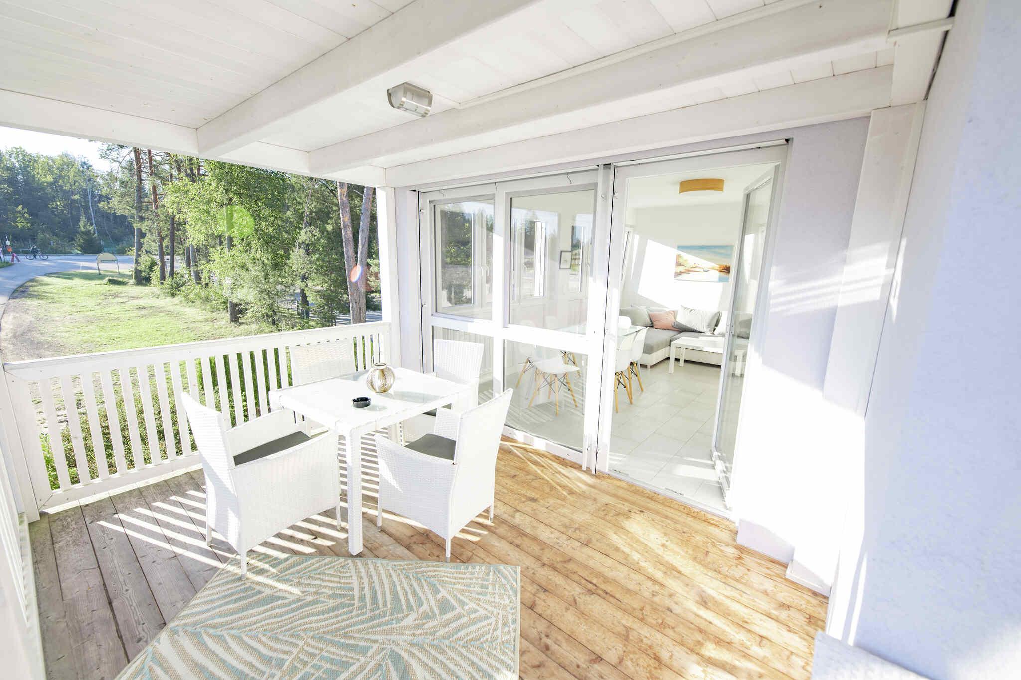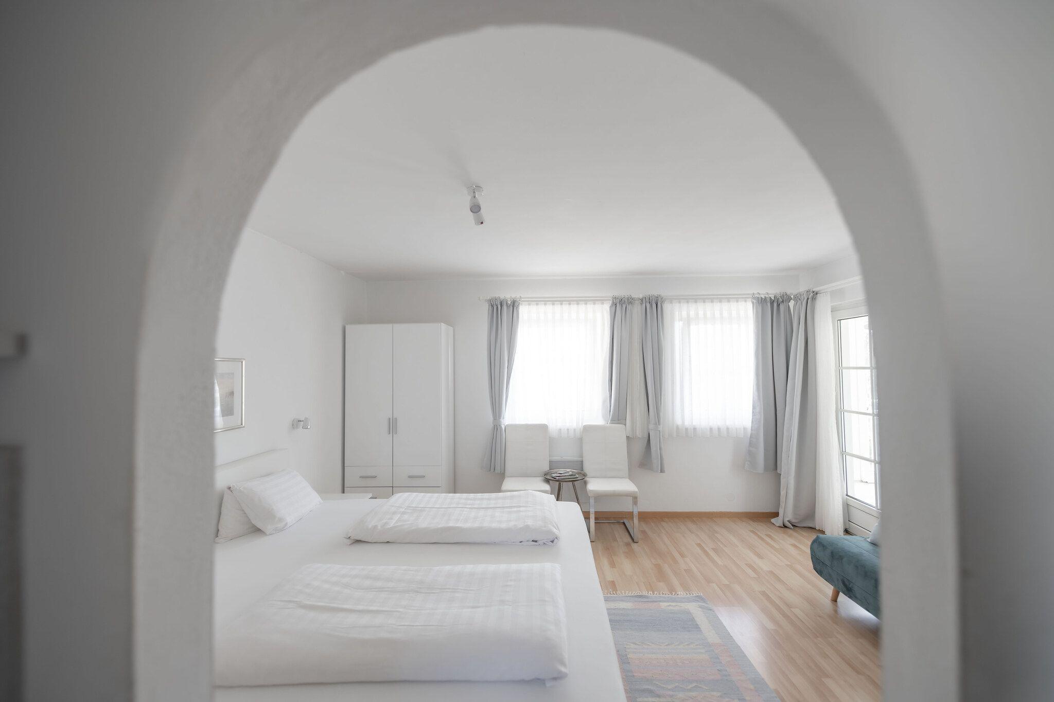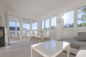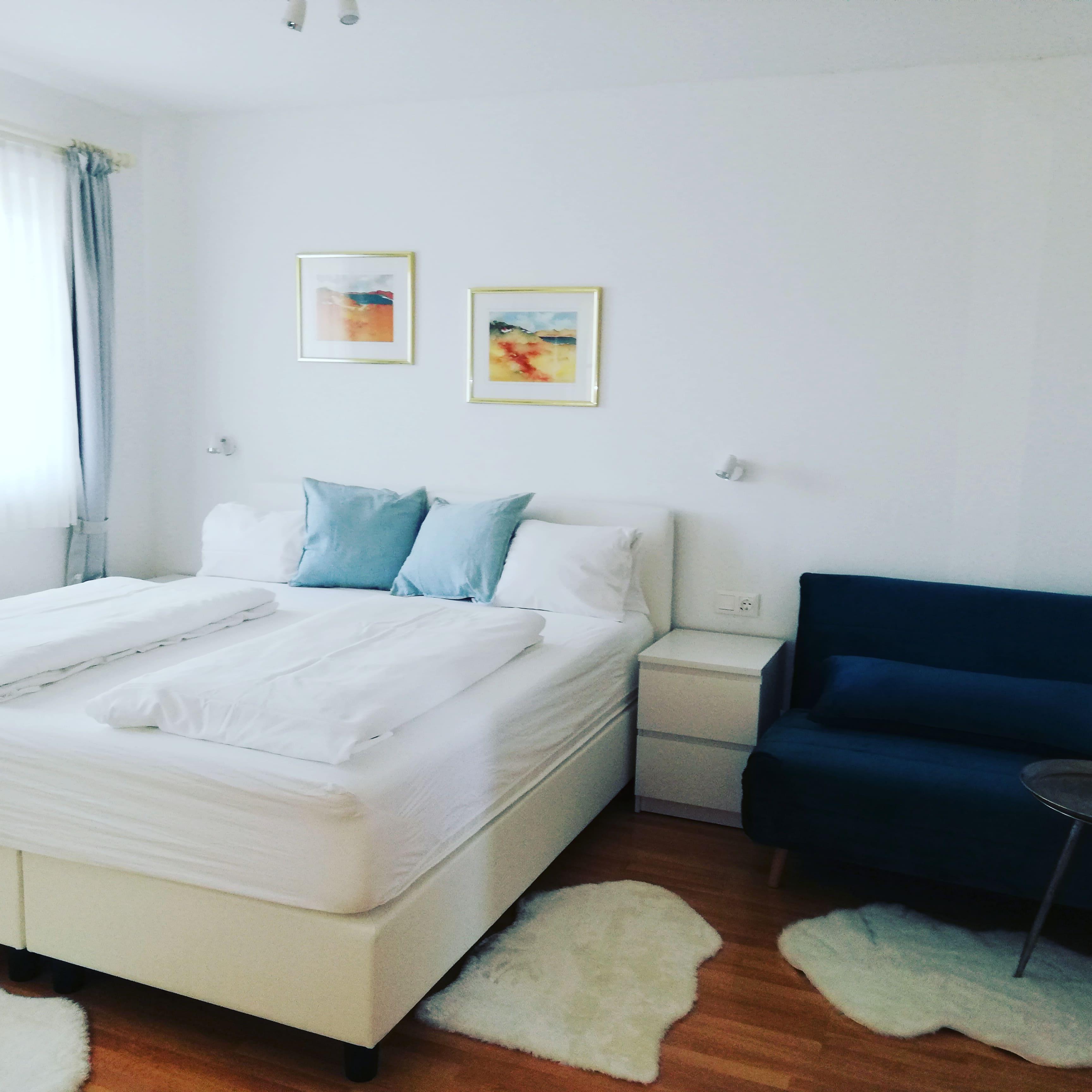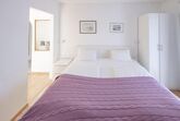 Unser schönstes und größtes Appartment, mit breiter Fensterfront im Wohnraum, Kamin und Couch zum Wohlfühlen. Natürlich sind auch hier alle Möbel in weiß gehalten, die Schlafzimmer mit Boxspringbetten ausgestattet.