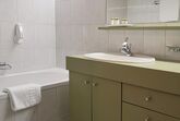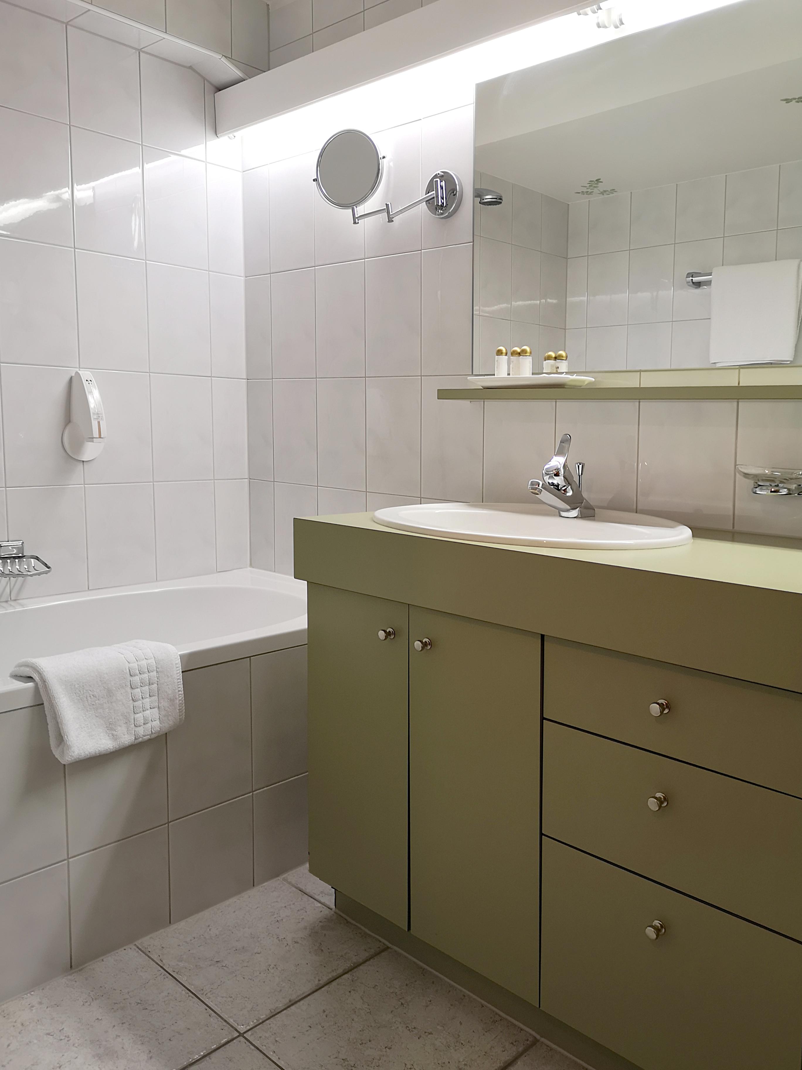 Bad mit Doppelwaschbecken, Fön, Kosmetikspiegel und Kosmetikartikeln, WC getrennt.