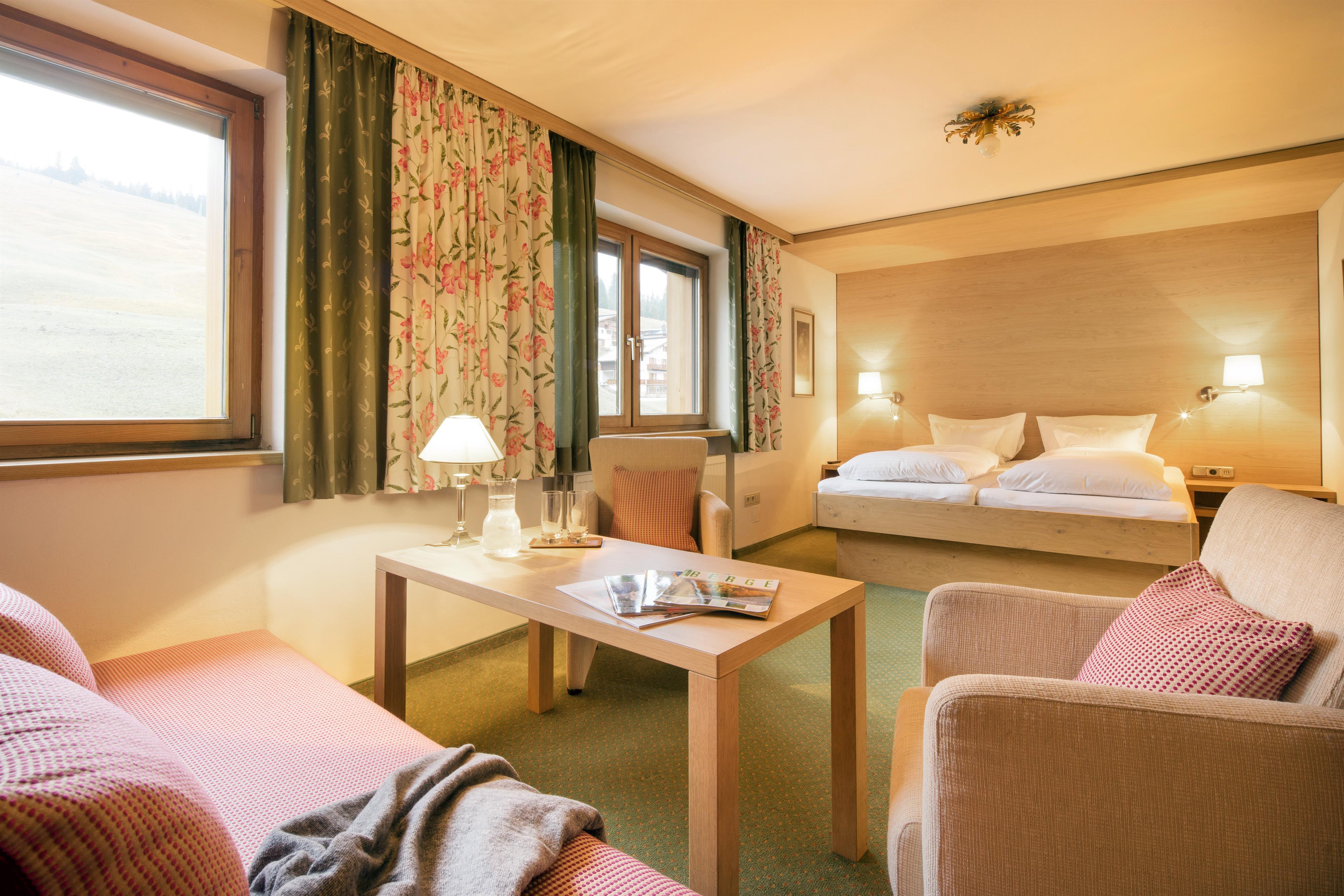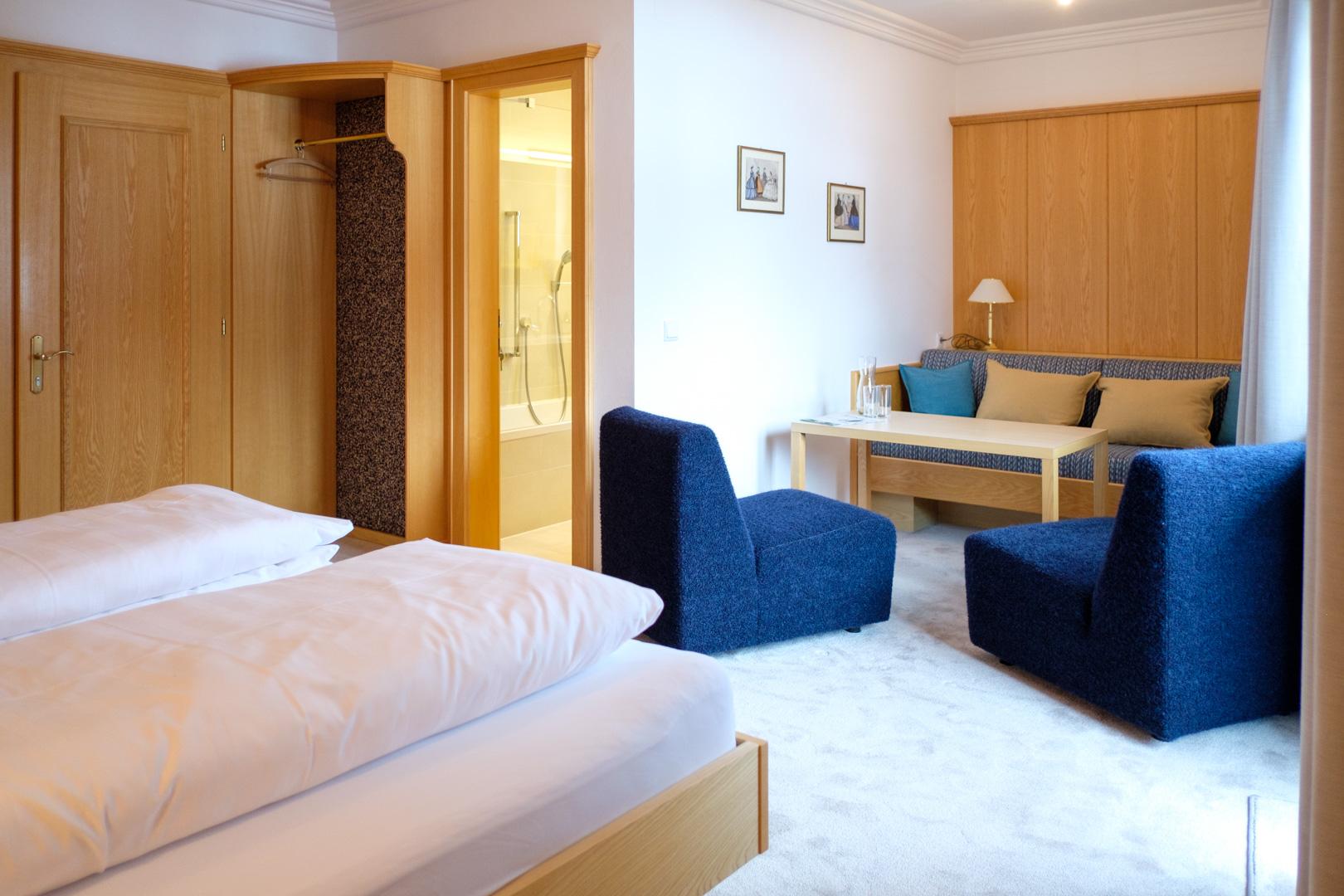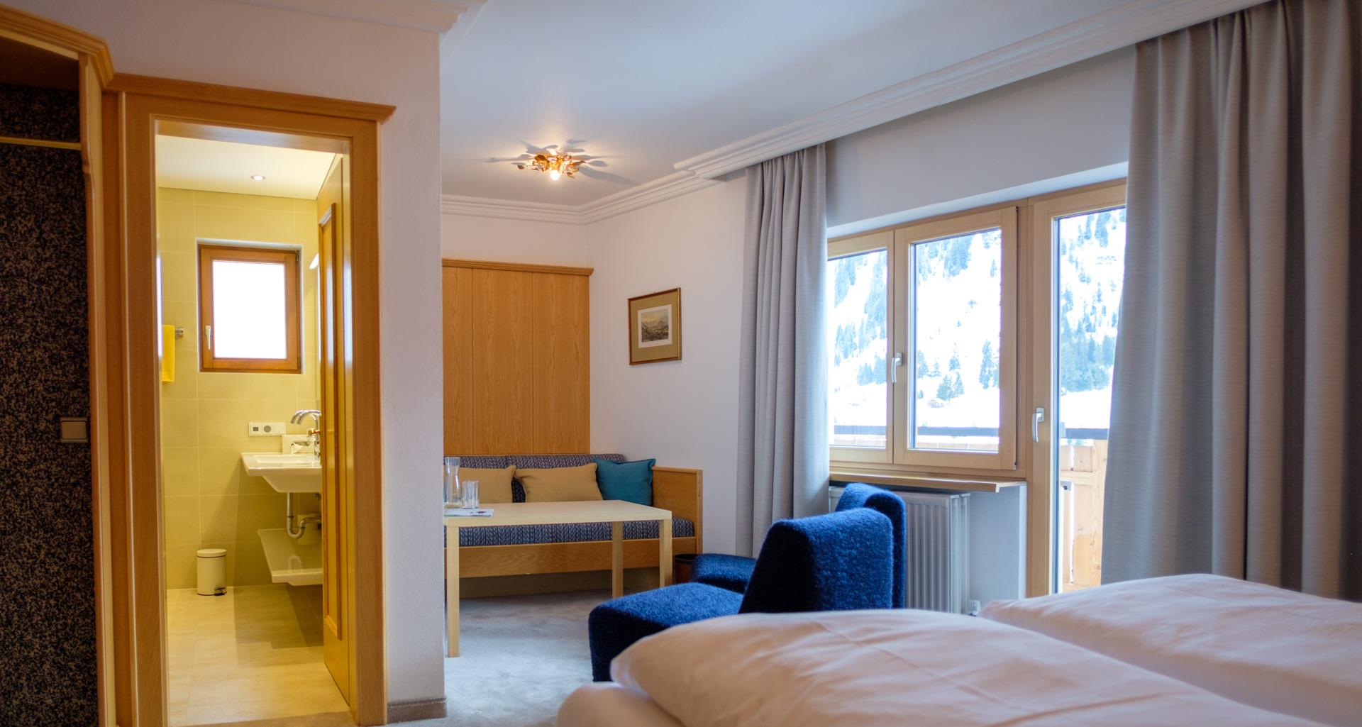Großes Doppelzimmer mit gemütlicher Sitzecke. Das Zimmer hat einen Balkon mit einem tollen Blick auf das Ortszentrum von Lech.
