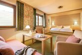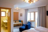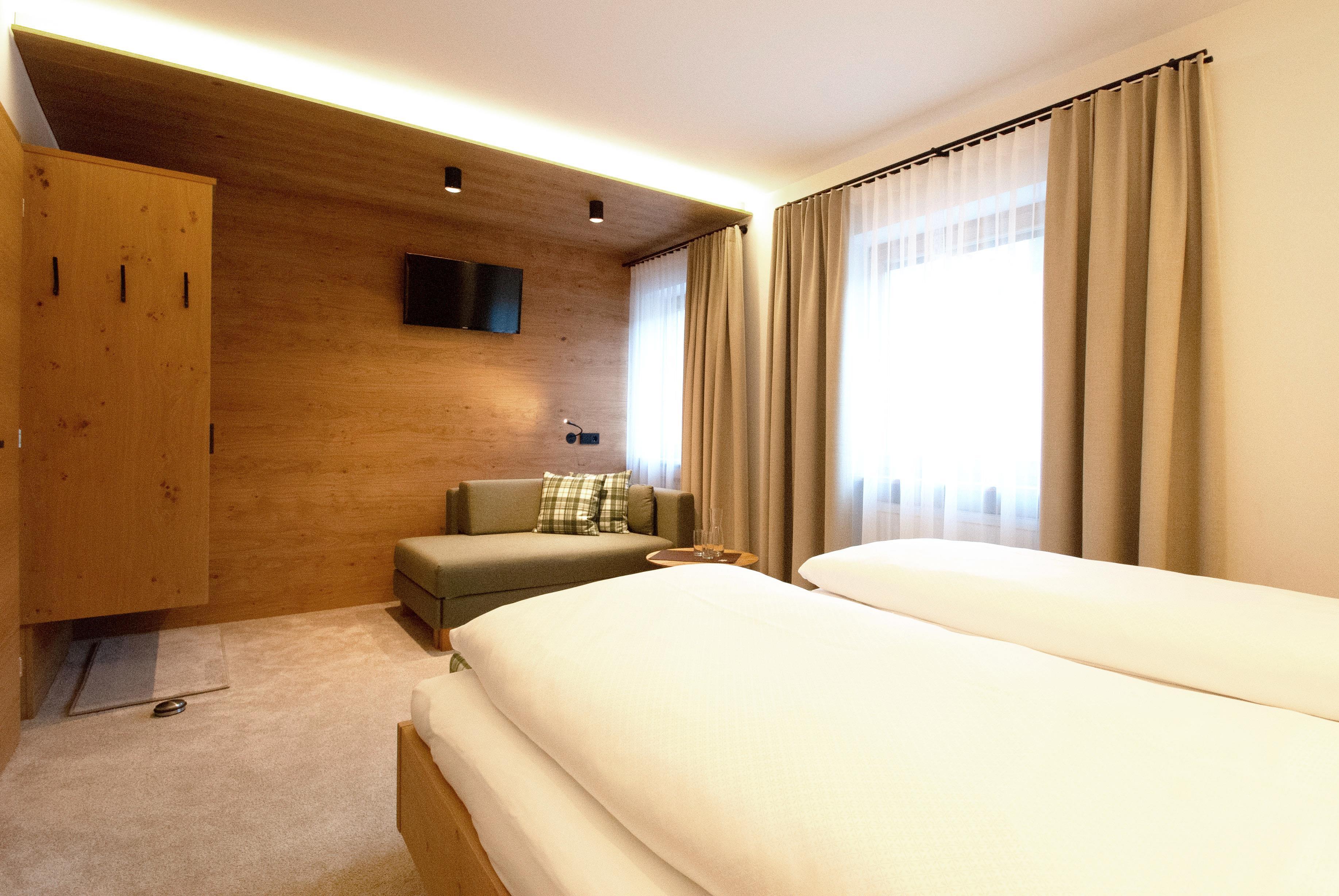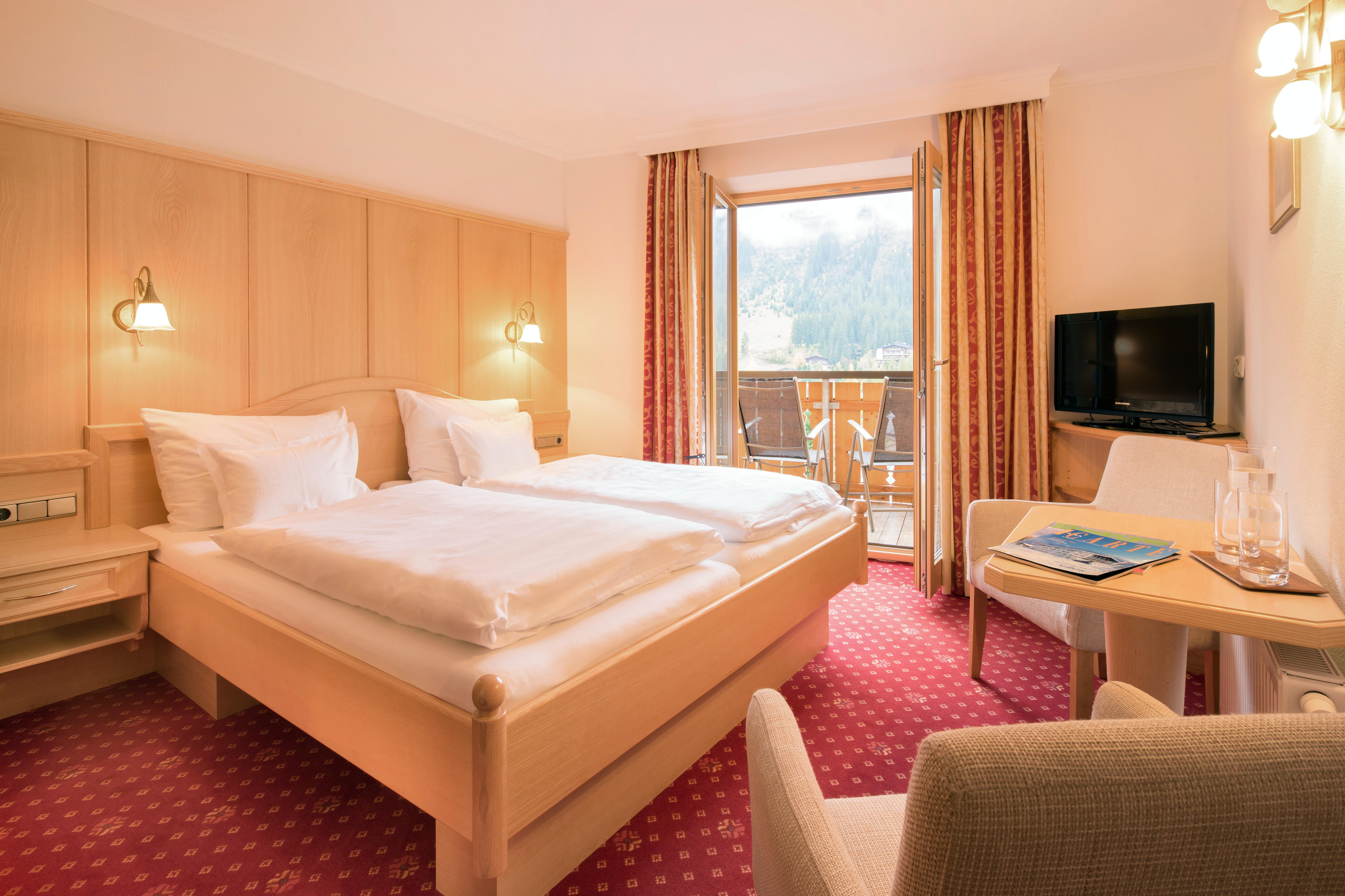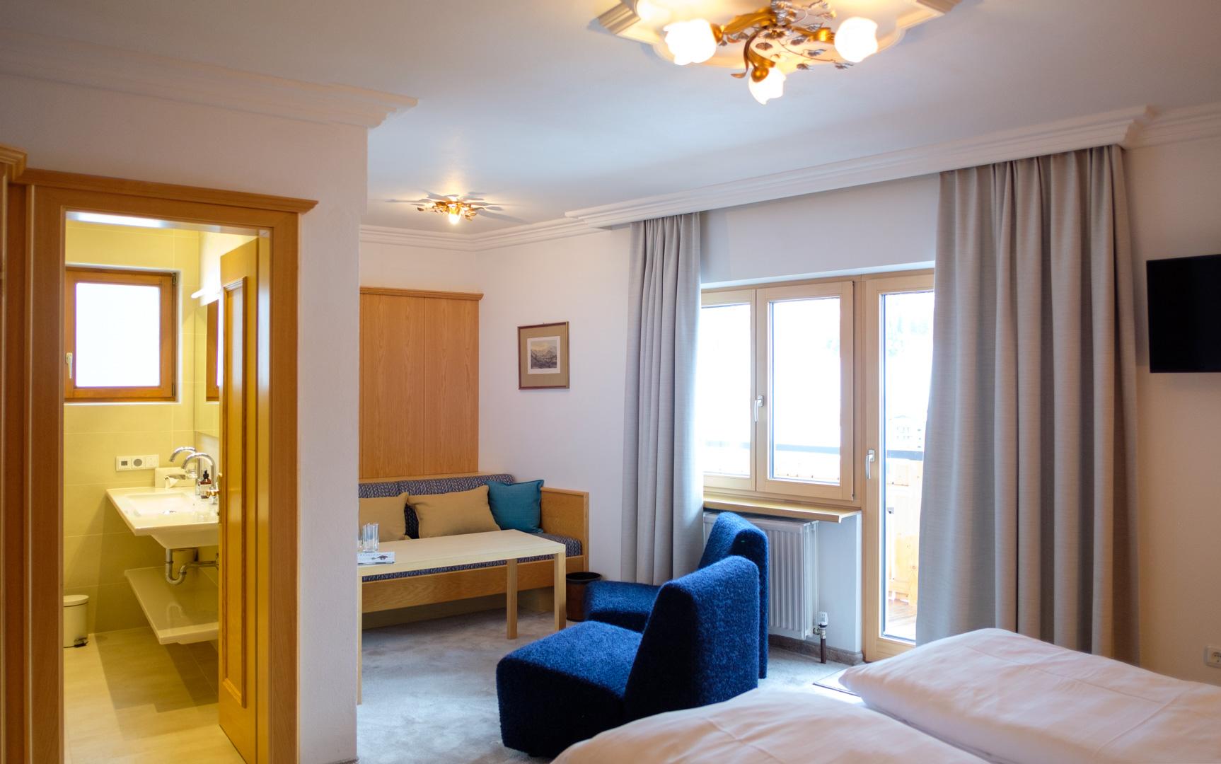 Großes Doppelzimmer mit gemütlicher Sitzecke. Das Zimmer hat einen Balkon mit einem tollen Blick auf das Ortszentrum von Lech.