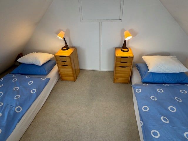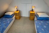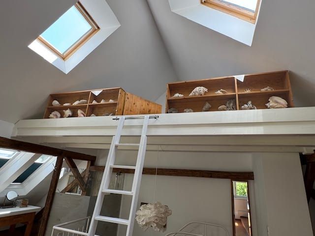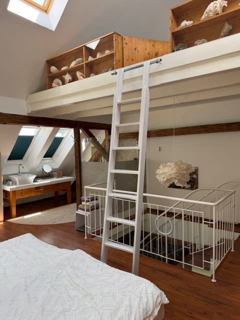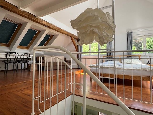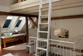 Die gewundene Treppe führt über den Kachelofen in den Oberstock. Ein Doppelbett, Couch, WC, Dusche, Waschtisch, Garderobe bieten viel Platz. Die abnehmbare Leiter führt zu 2 Hochbetten im Giebel.