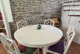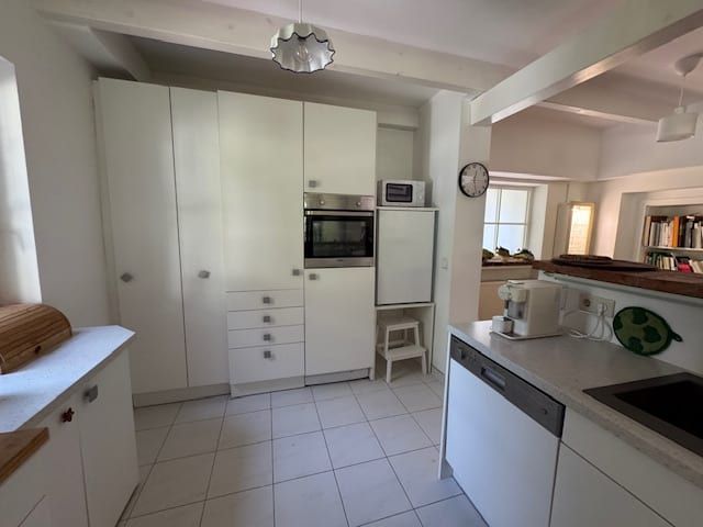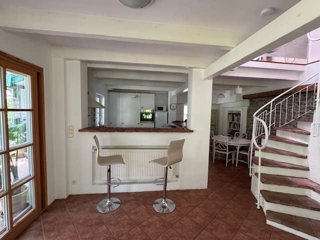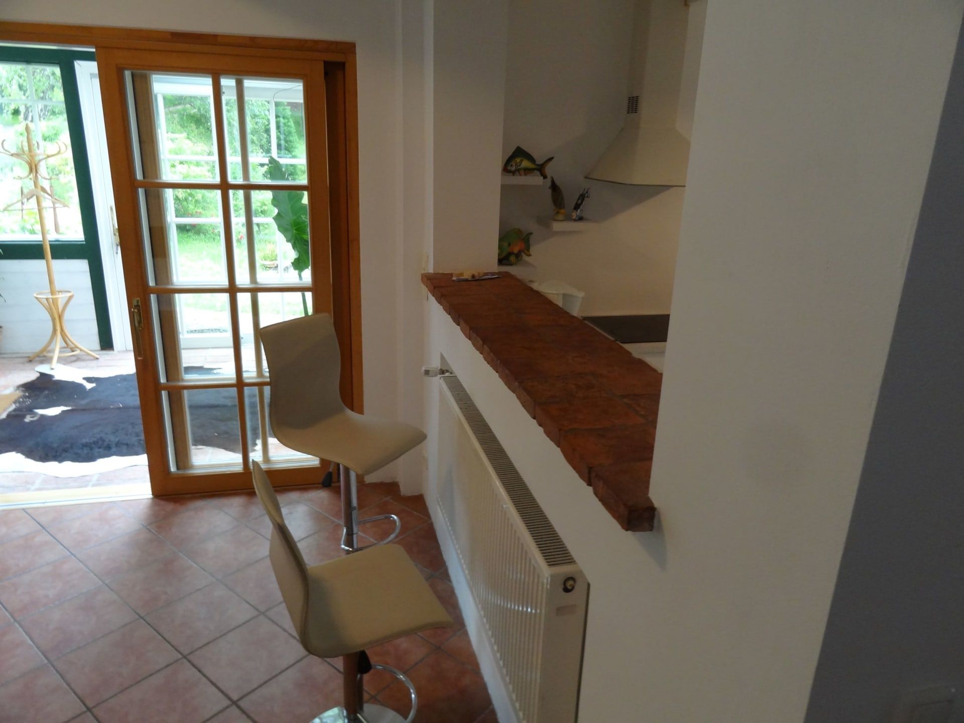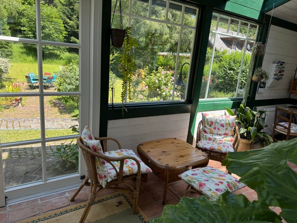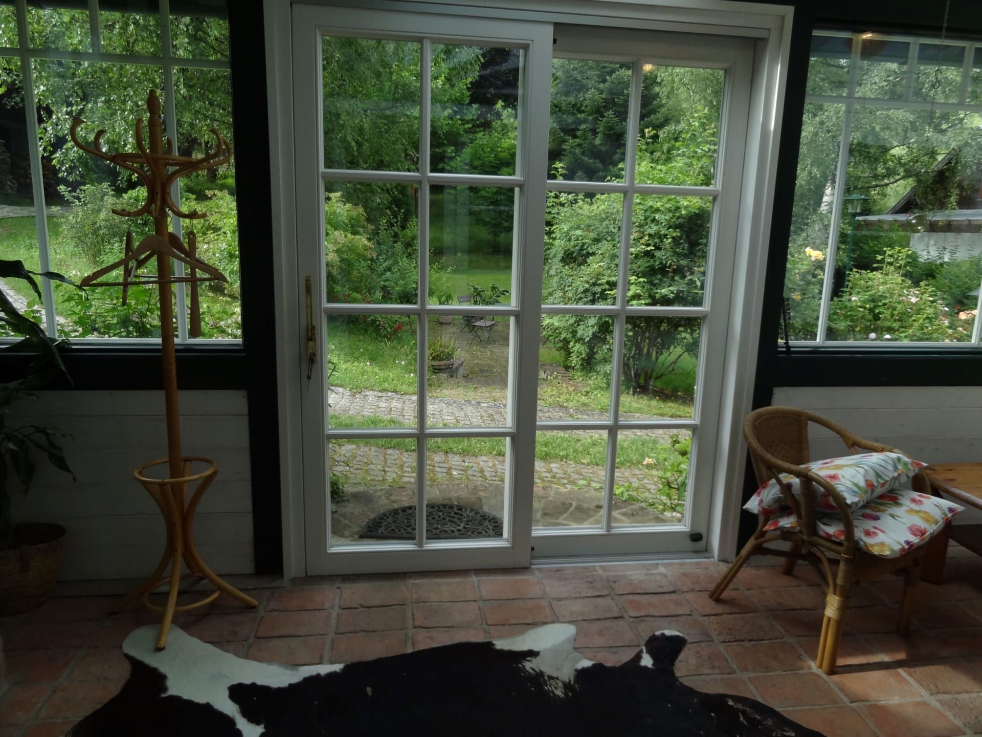 Herzlichst willkommen in Deinem Apartment. Du kannst dieses entweder über eine kleine überdachte Terrasse betreten oder von Deiner Gartenwiese kommend, durch eine Schiebetüre. In beiden Fällen stehst Du nun im Wintergarten, der Garderobe, Sauerstofftankstelle und Schreibplatz ist. Von hier aus geht’s rechts in das Wohnzimmer, ausgestattet mit 2 Couchen, Fernseher, DVD-Player, Radio und Kachelofen. Links davon, vorbei an einer kleinen Bar, gelangt man in den Speisebereich mit Speisetisch, Glasschrank, Bibliothek und Spielebord. Eine Durchreiche verbindet Küche und Speisebereich.