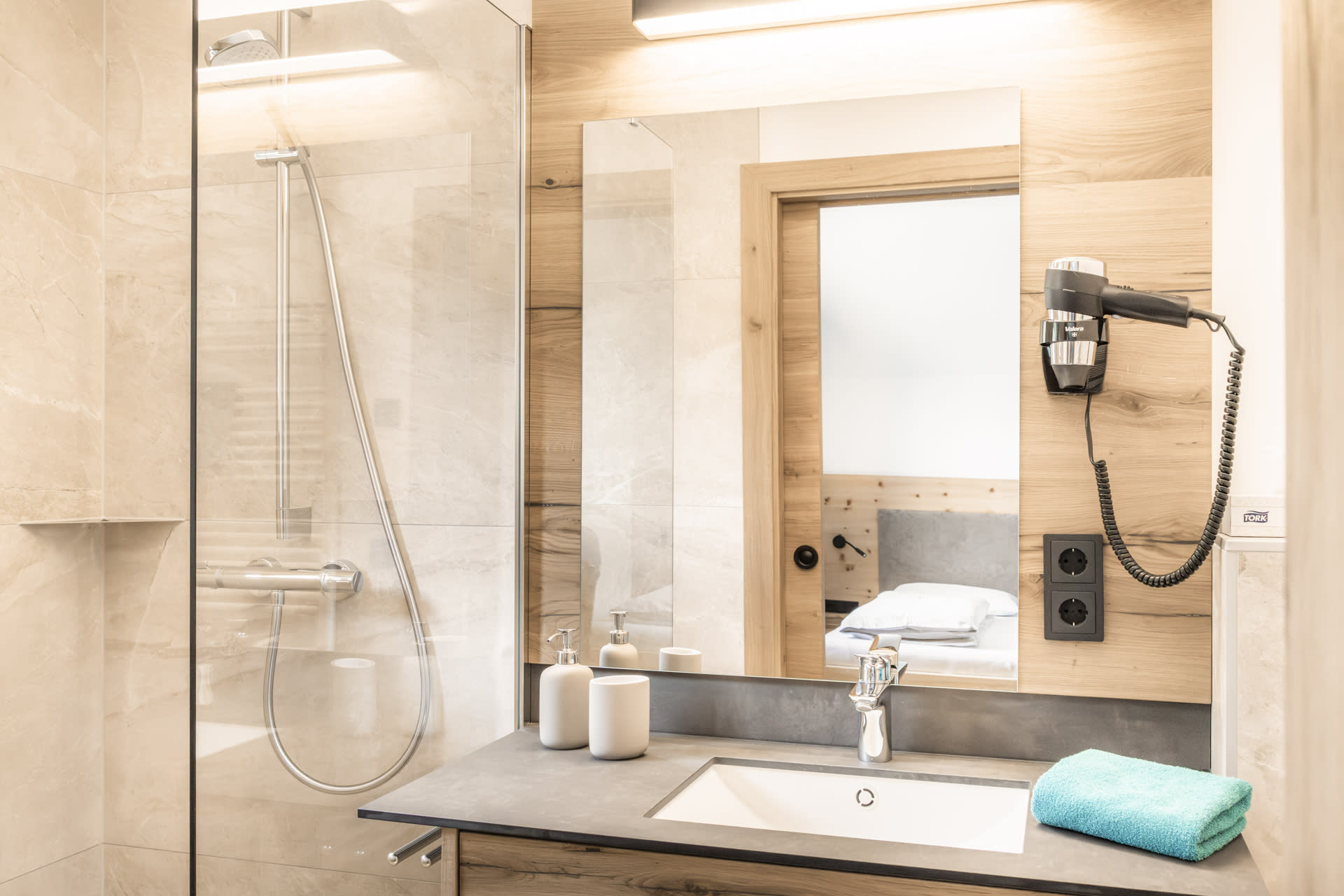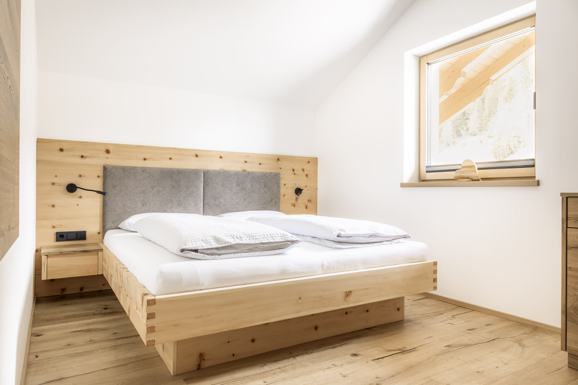 Unsere zwei neu erbauten Lodges im 2. Stock bieten viel Platz, modernen Komfort und eine traumhafte Aussicht. Dank der Ausrichtung zur Morgensonne genießt du bereits beim Aufstehen die ersten Sonnenstrahlen. Ein besonderes Highlight: Jede Lodge verfügt über eine private Sauna mit Panoramafenster, ideal zum Entspannen nach einem aktiven Tag in den Bergen.
