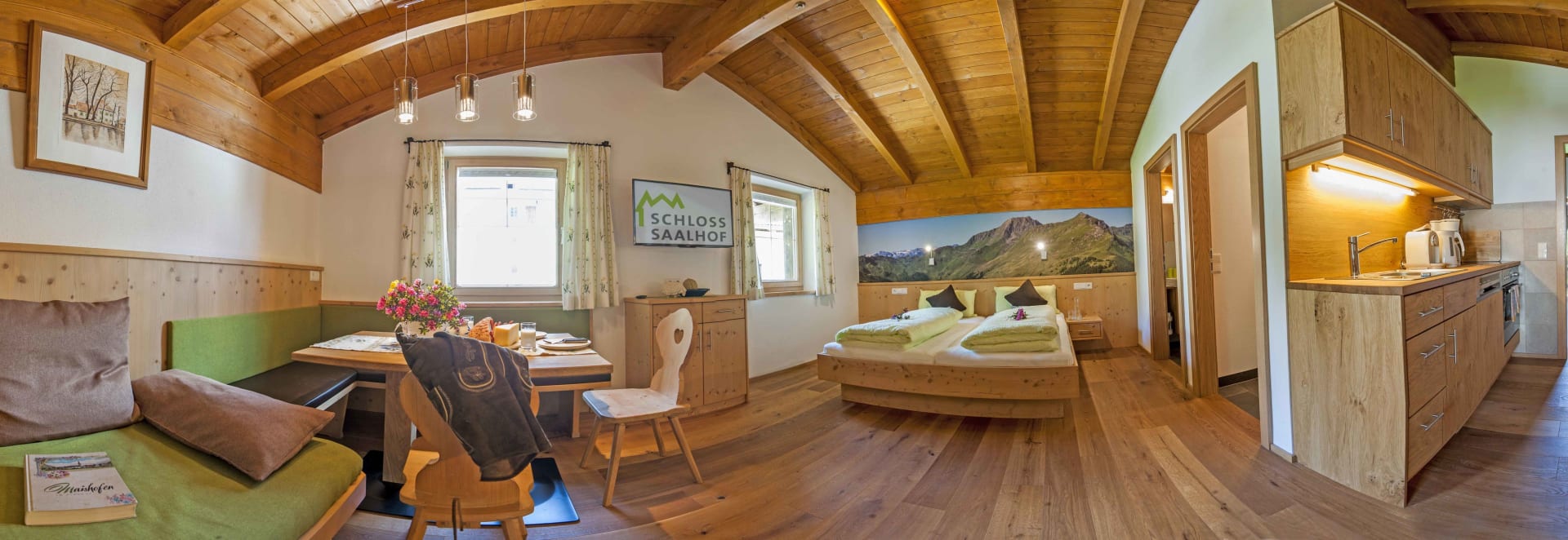 Zu den Prunkstücken von Schloss Saalhof zählt seine einzigartige, pittoreske Alleinlage pittoreske zwischen sanften Grasbergen und schroffen Gipfeln. Die schönsten Wandergebiete sind dennoch nur wenige Minuten entfernt. Im Sommer wollen die Wanderschuhe geschnürt und die Fahrradtaschen gepackt werden. Die Gondeln auf den Weißseegletscher und ins Loferer Almengebiet und die Rauriser Bahnen können 1x gratis pro Aufenthalt genutzt werden. Wie wärs danach mit einem Sprung ins kühle Nass des Zeller Sees: Mit der Gästekarte haben Sie gratis Zutritt zum Maishofner Strandbad.