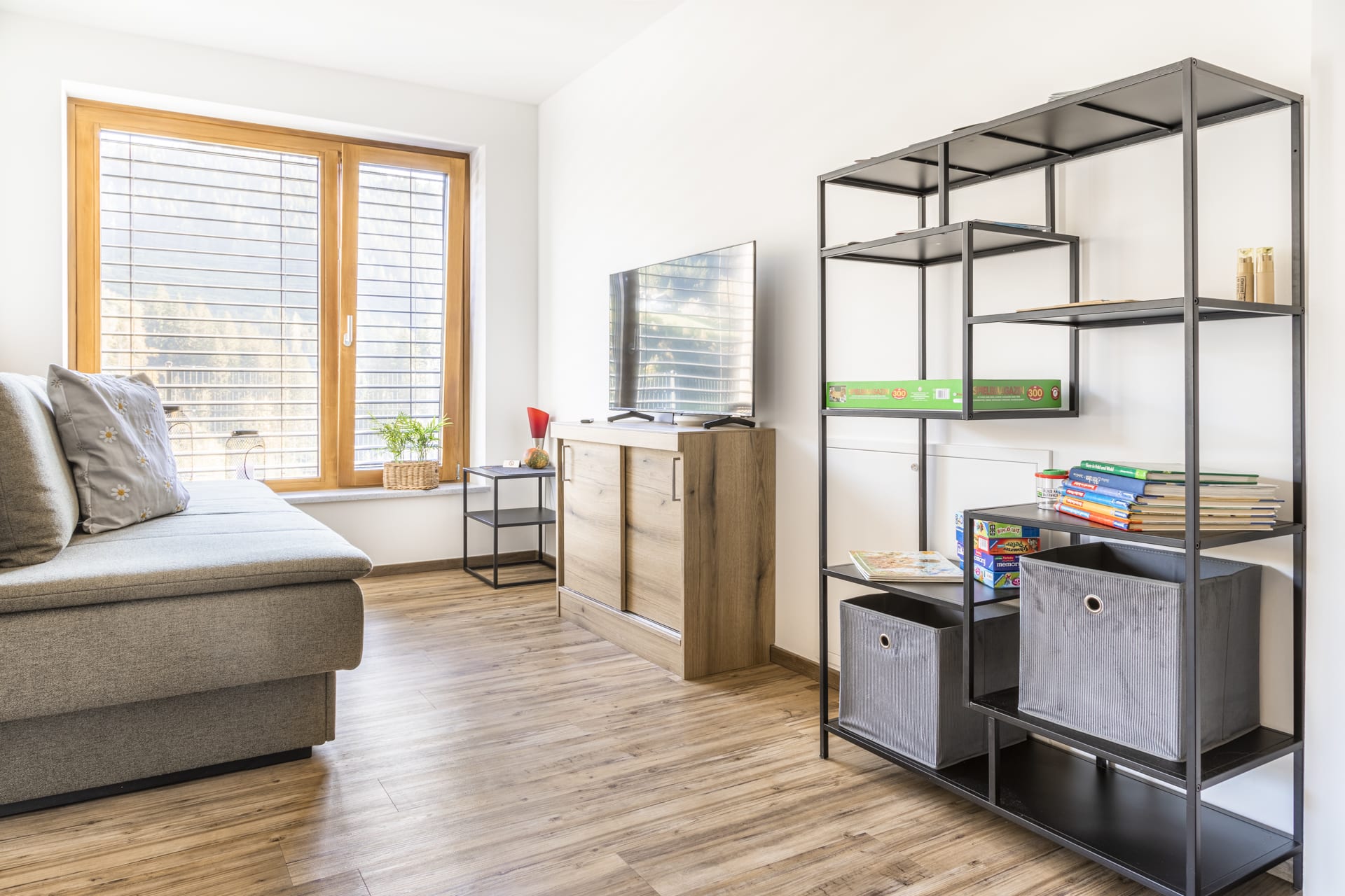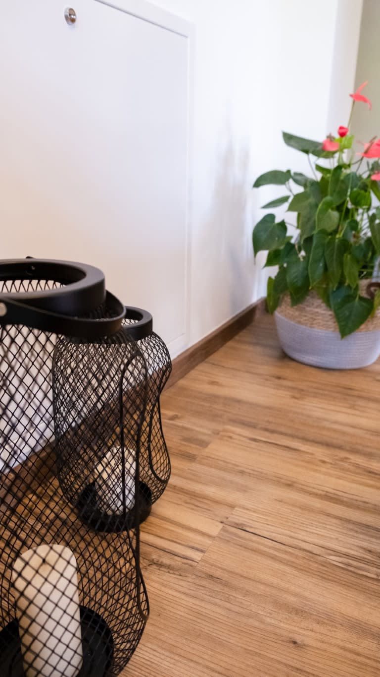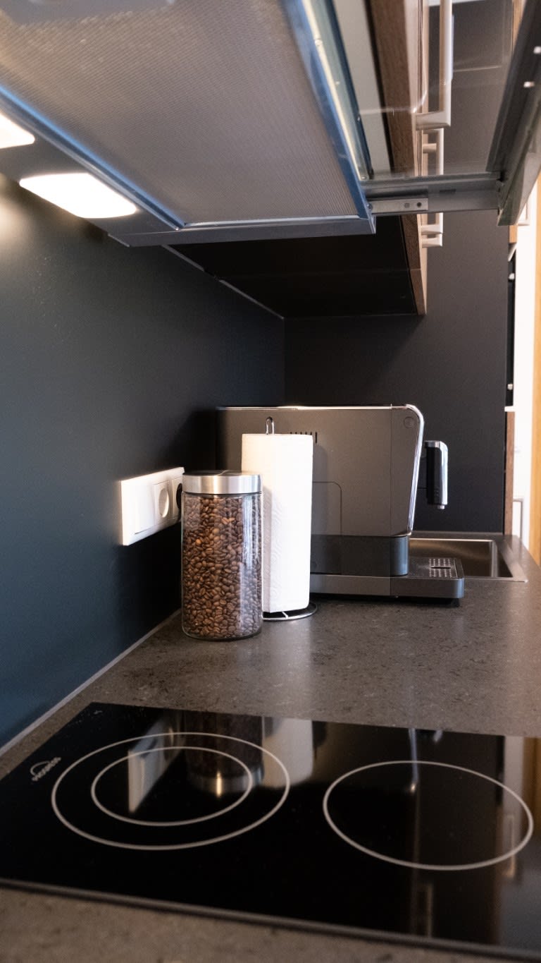 Die Ferienwohnung ist ebenerdig und hat eine private Terrasse anbei. Sie ist optimal für eine Familie mit 2 Erwachsenen und 2 Kinder, mit je einem Schlafzimmer für die Erwachsenen und einem Zimmer mit einem Stockbett für Kinder (in diesem Zimmer befindet sich kein Fenster). Sie bietet alles, was man für einen unbeschwerten Urlaub benötigt. In der Küche findet sich eine komplette Ausstattung samt 2-Platten Herd, eine Mikrowelle mit Backfunktion und eine Kaffeemaschine, für den morgendlichen Kaffee. Und falls mal zu wenig eingepackt wurde, steht eine Waschmaschine bereit.