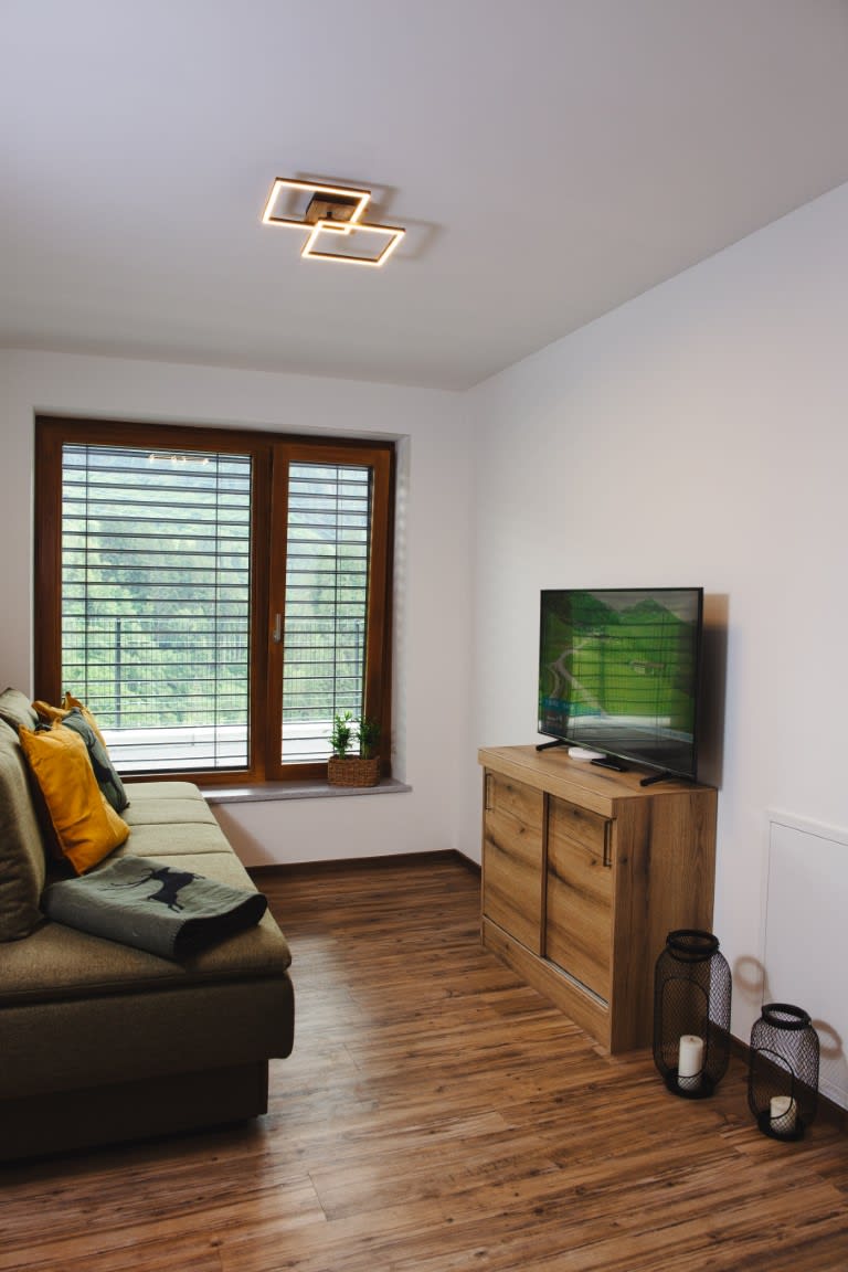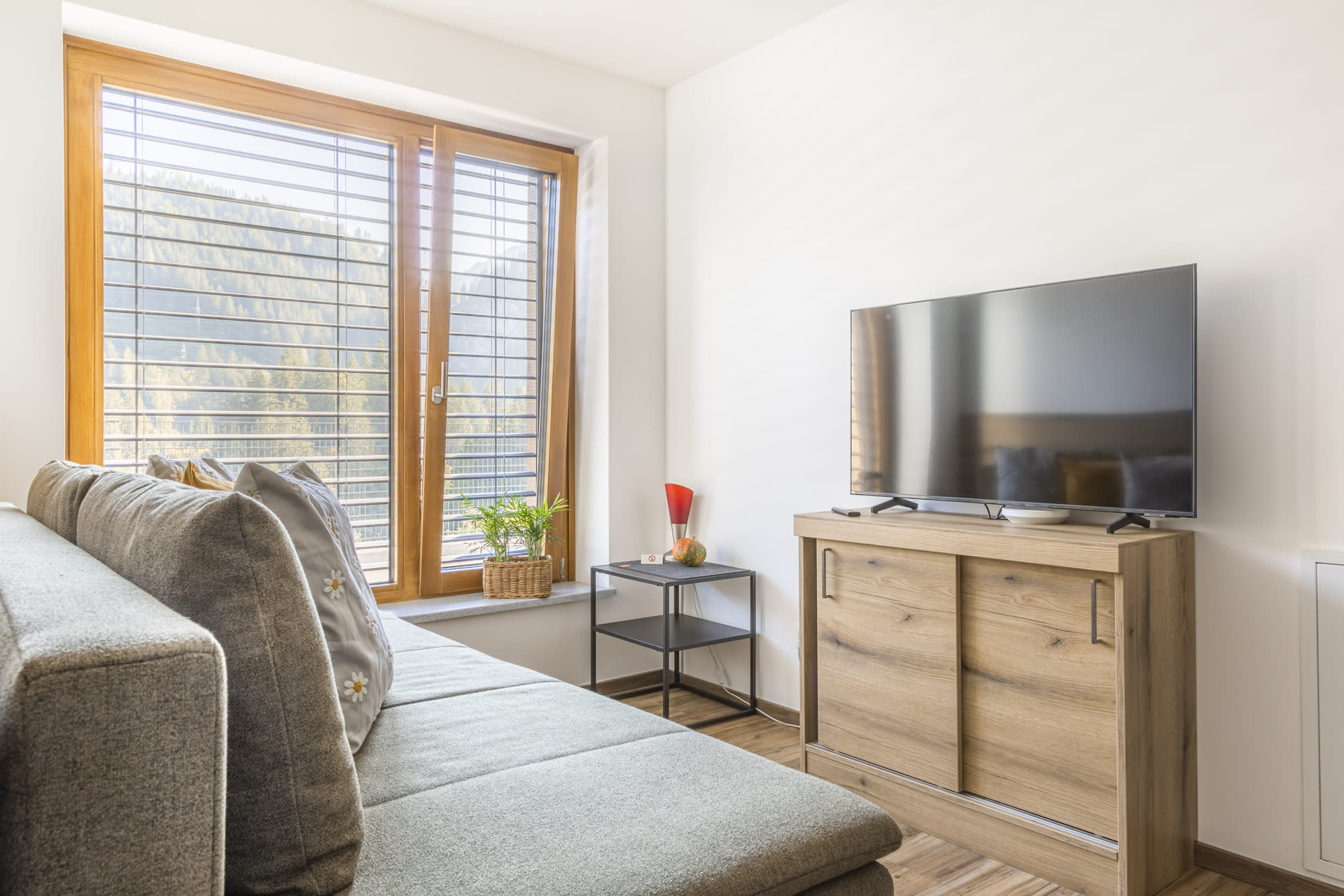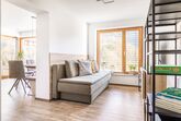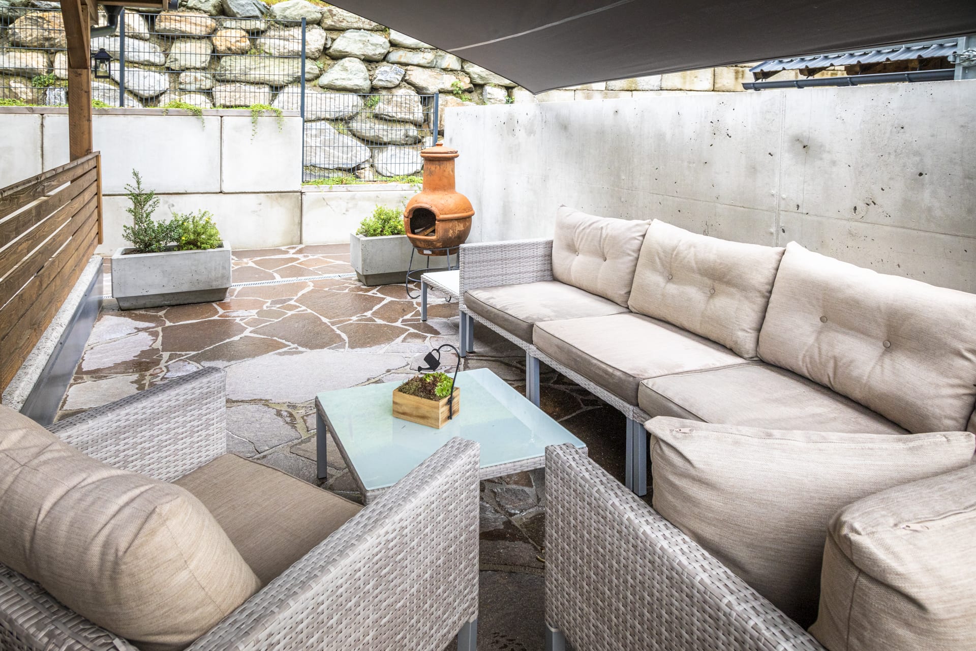 Die Ferienwohnung ist ebenerdig und hat eine private Terrasse anbei. Sie ist optimal für eine Familie mit 2 Erwachsenen und 2 Kinder, mit je einem Schlafzimmer für die Erwachsenen und einem Zimmer mit einem Stockbett für Kinder (in diesem Zimmer befindet sich kein Fenster). Sie bietet alles, was man für einen unbeschwerten Urlaub benötigt. In der Küche findet sich eine komplette Ausstattung samt 2-Platten Herd, eine Mikrowelle mit Backfunktion und eine Kaffeemaschine, für den morgendlichen Kaffee. Und falls mal zu wenig eingepackt wurde, steht eine Waschmaschine bereit.