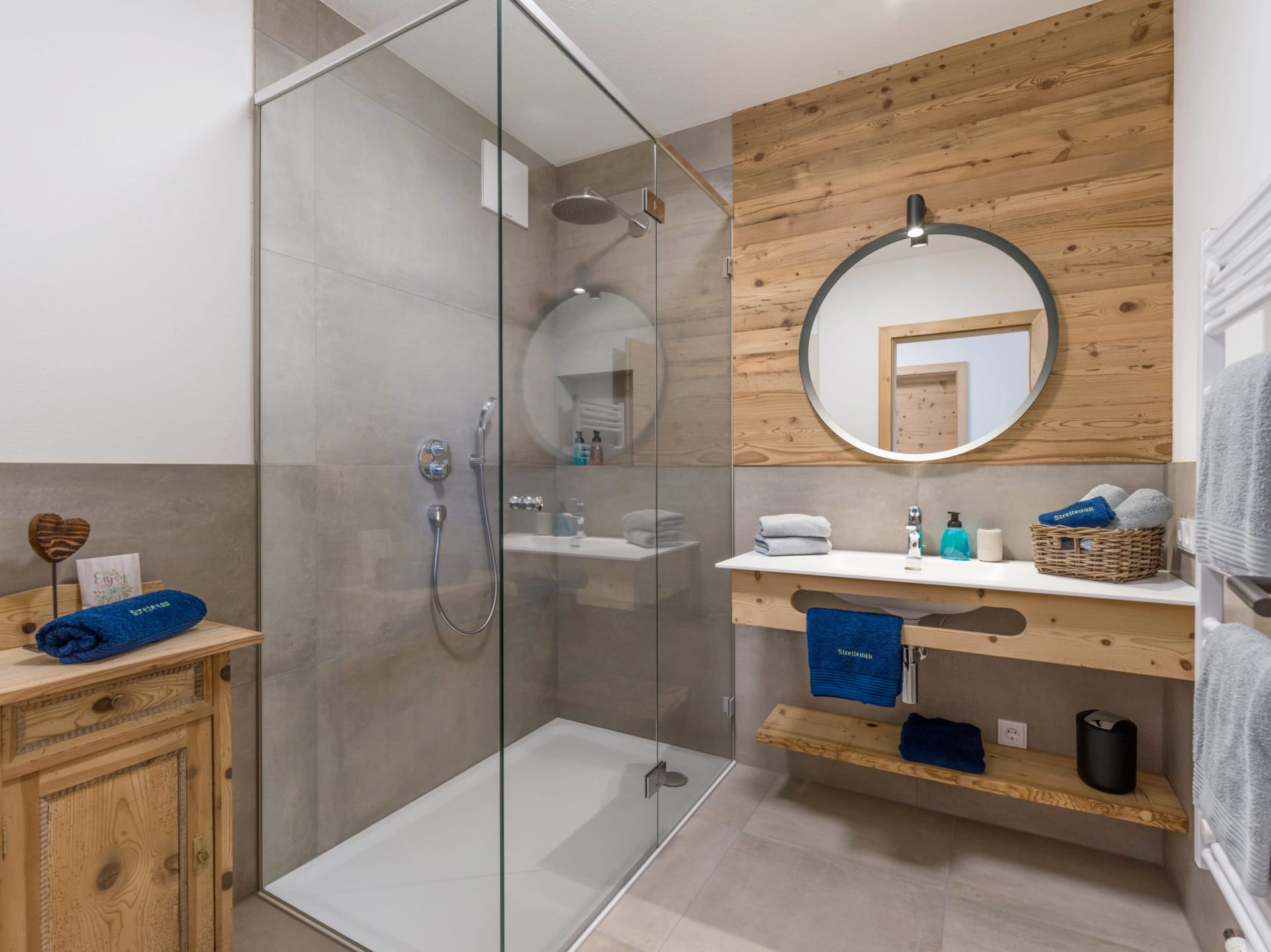 • Badezimmer mit Waschtisch, Handtuchtrockner und Dusche
