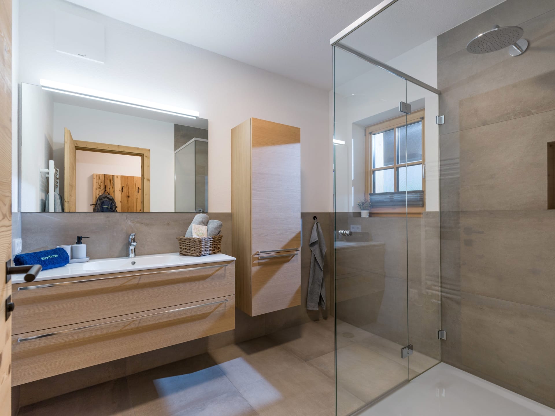 • Badezimmer mit Waschtisch, Handtuchtrockner und Dusche