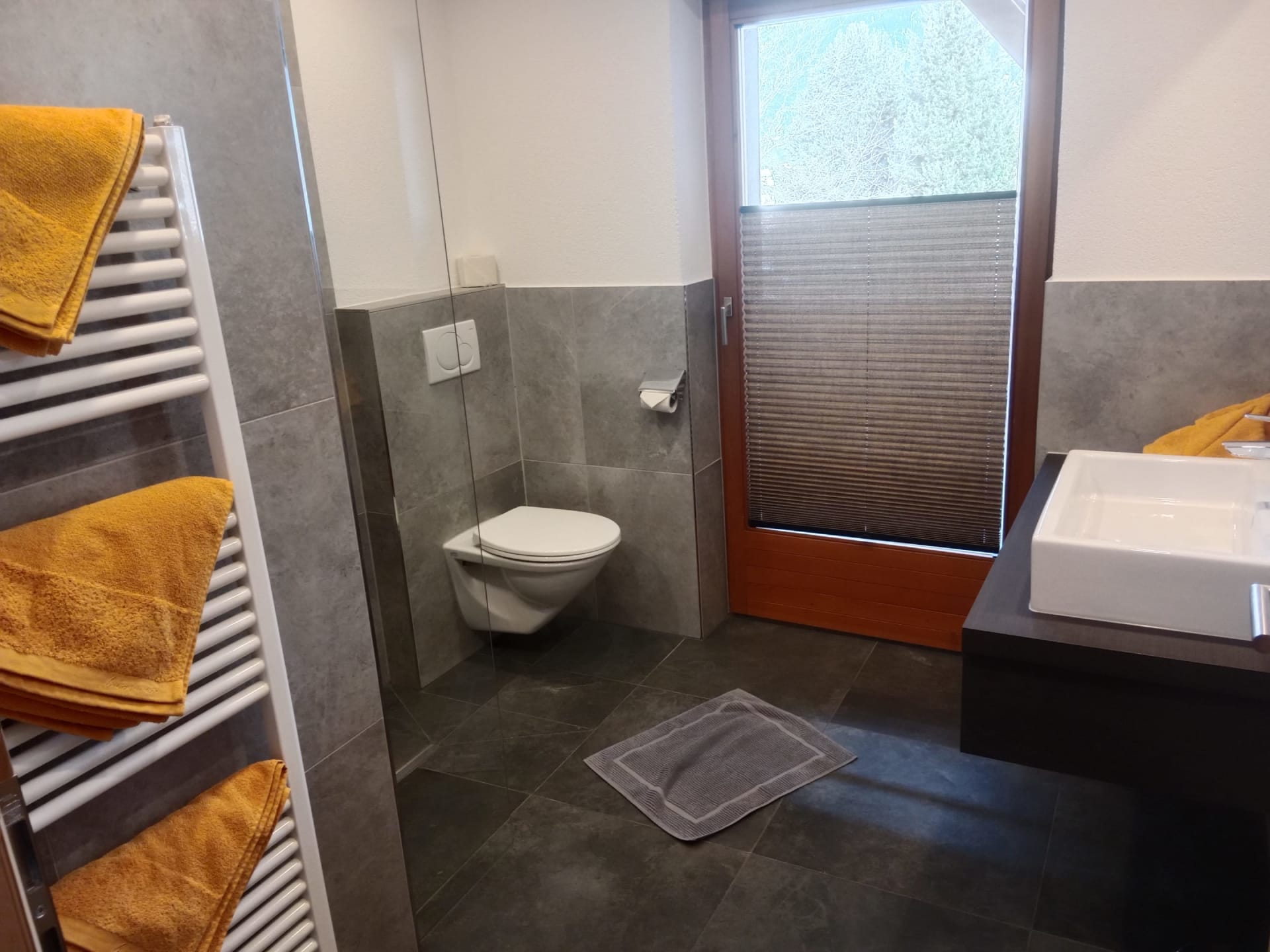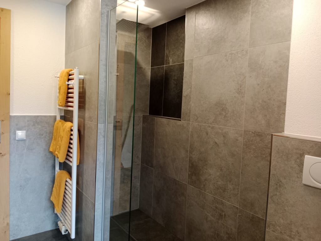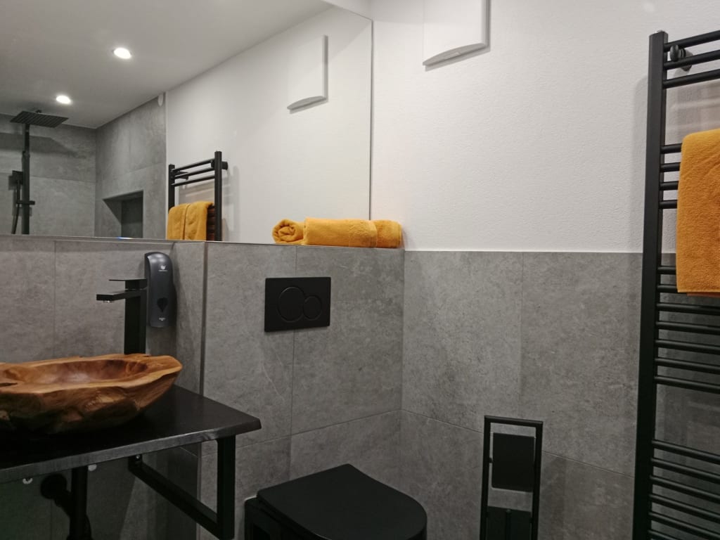 Das Badezimmer ist modern gestaltet und bietet Annehmlichkeiten wie eine Regendusche.