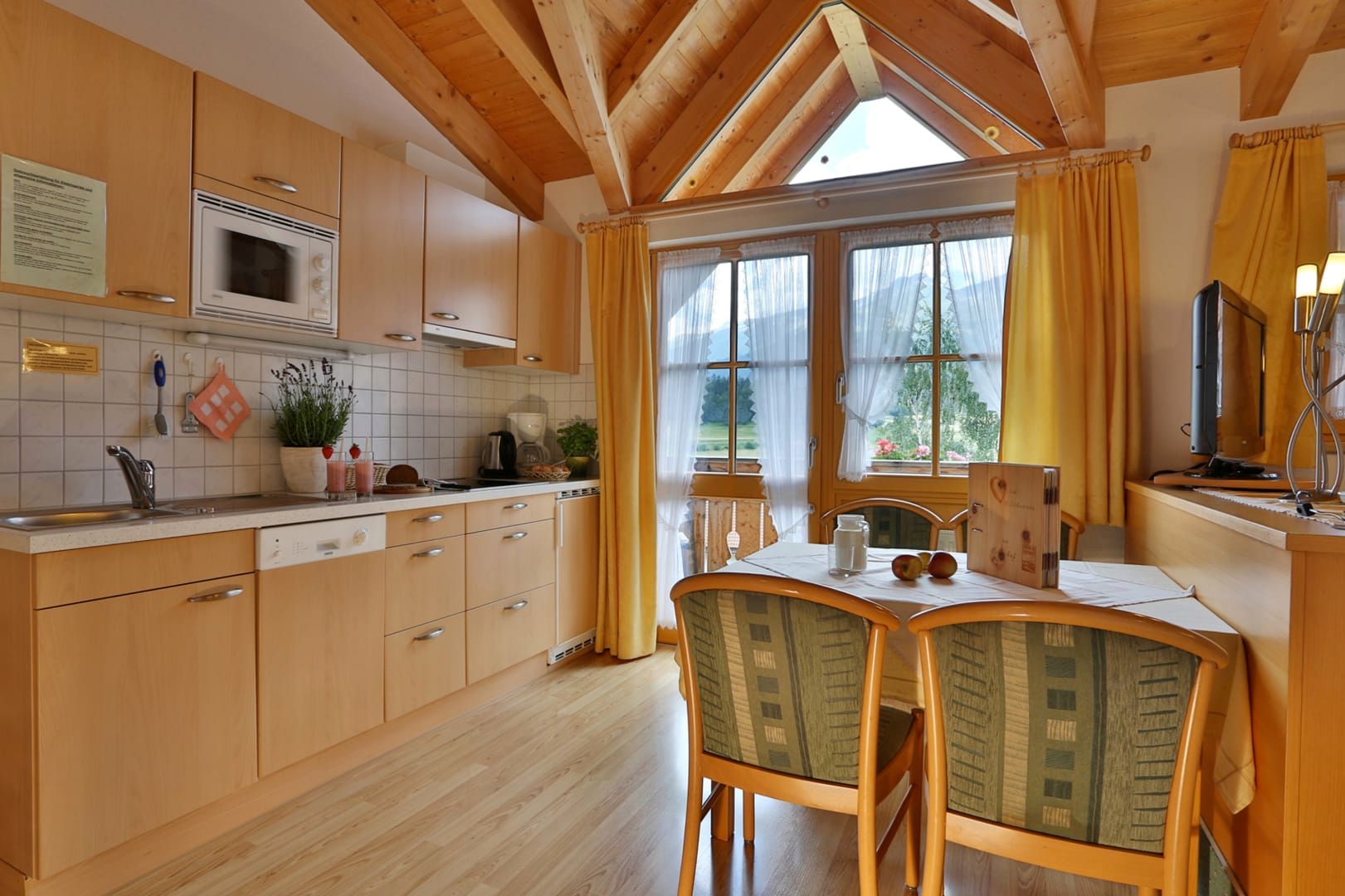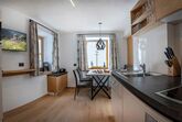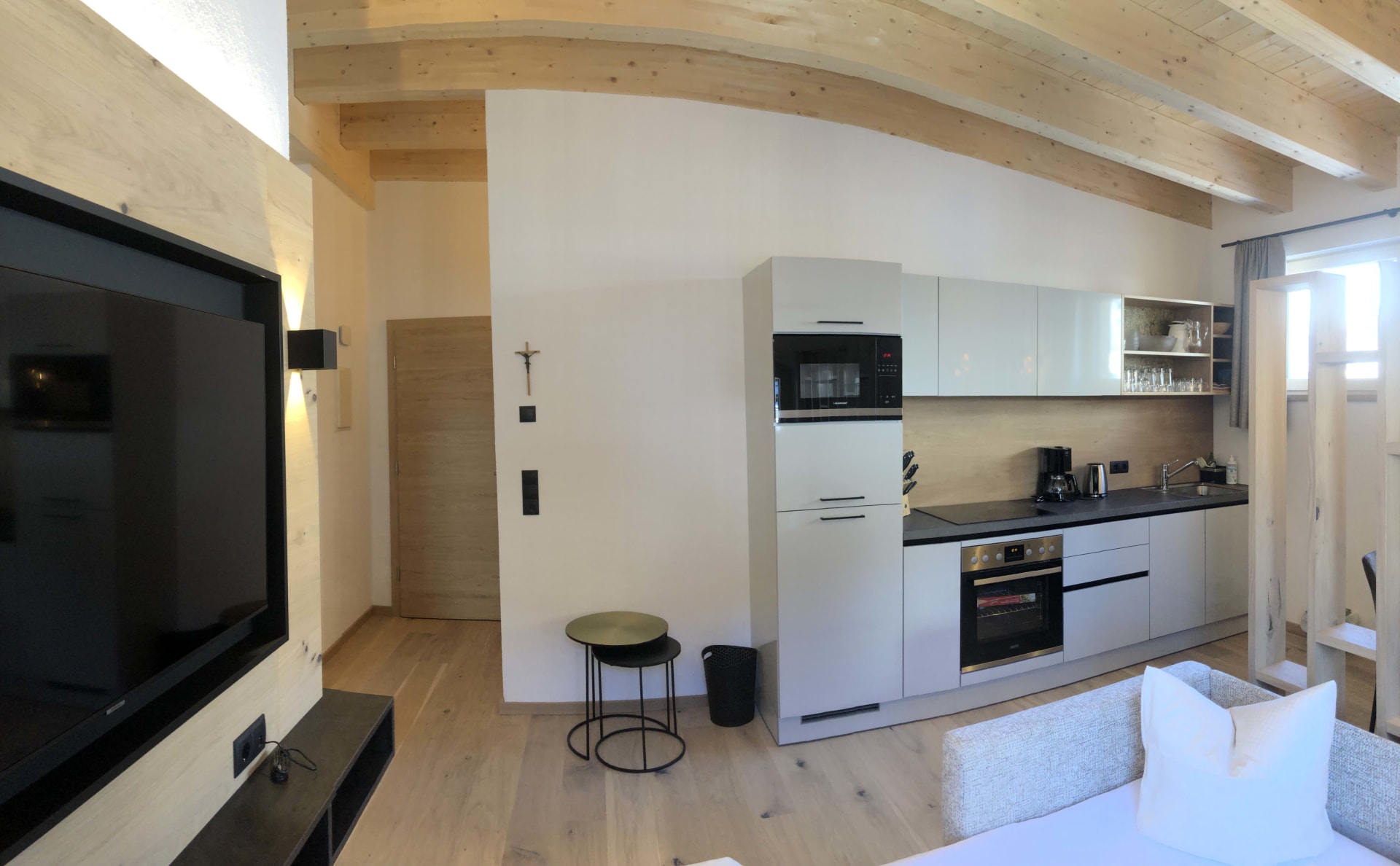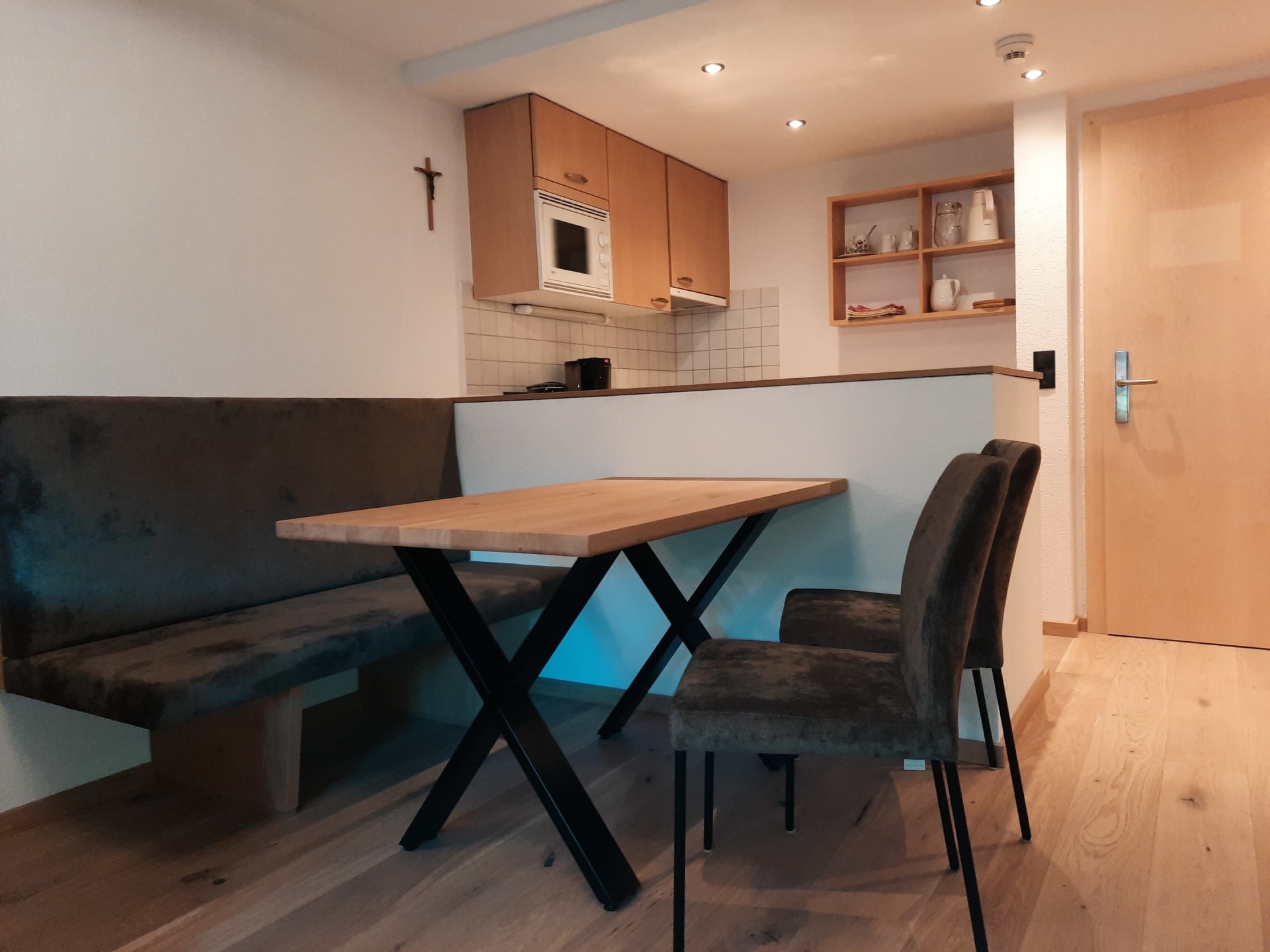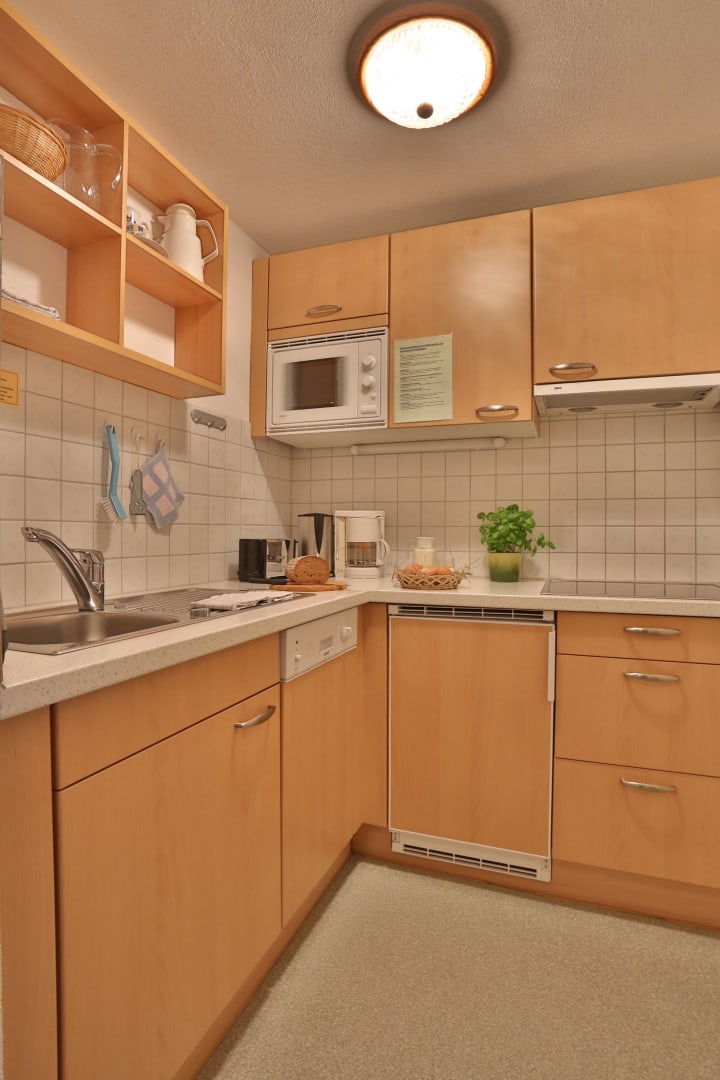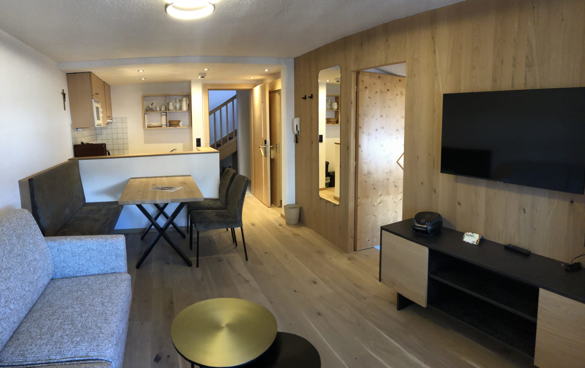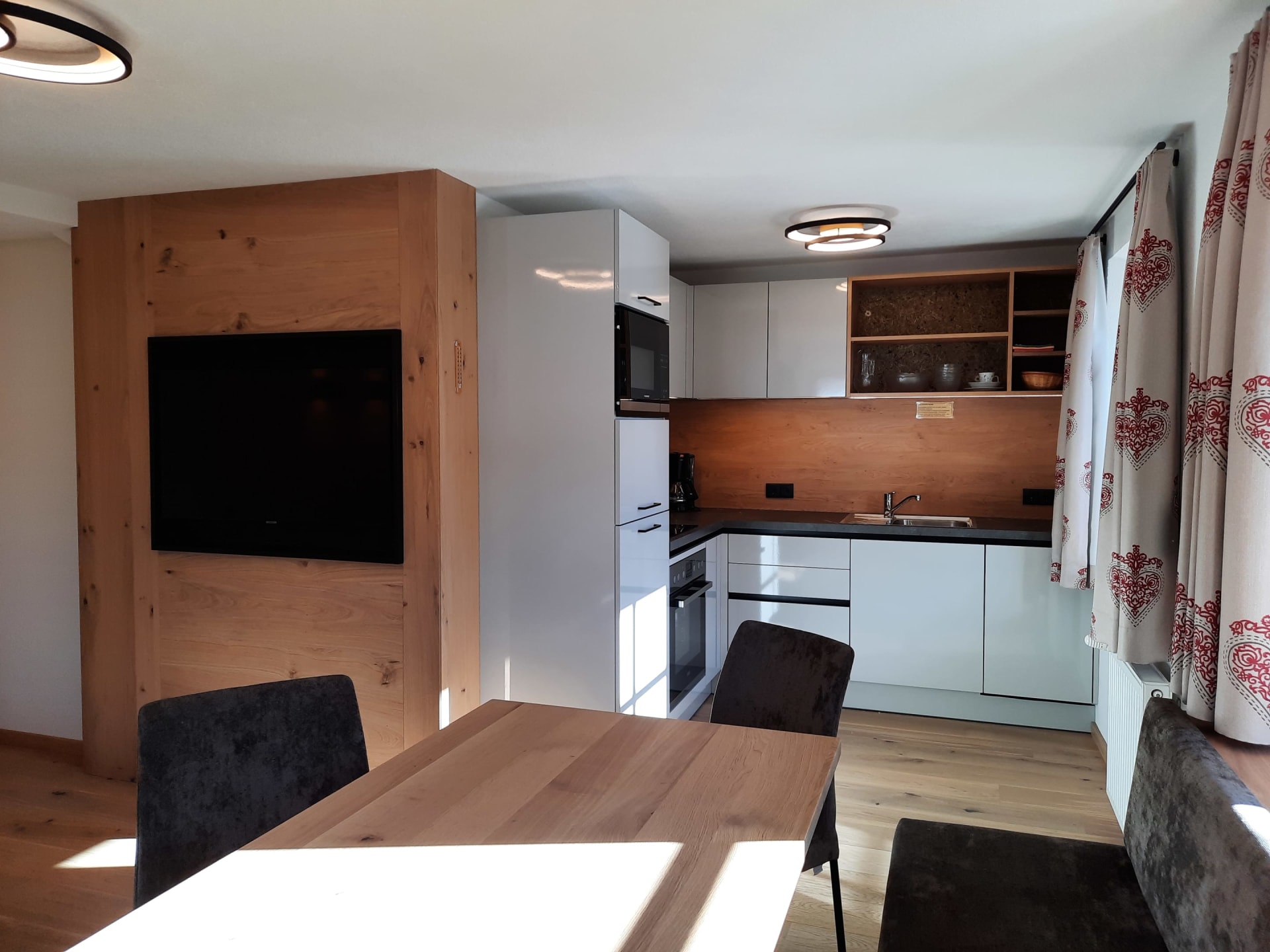 Du wohnst in einer hellen, modernen Küche mit Eichenboden, Essplatz für 4 Personen und TV. Einem neuen Badezimmer mit Walk-In-Dusche, Waschtisch und WC und einem Vorraum mit Garderobe.