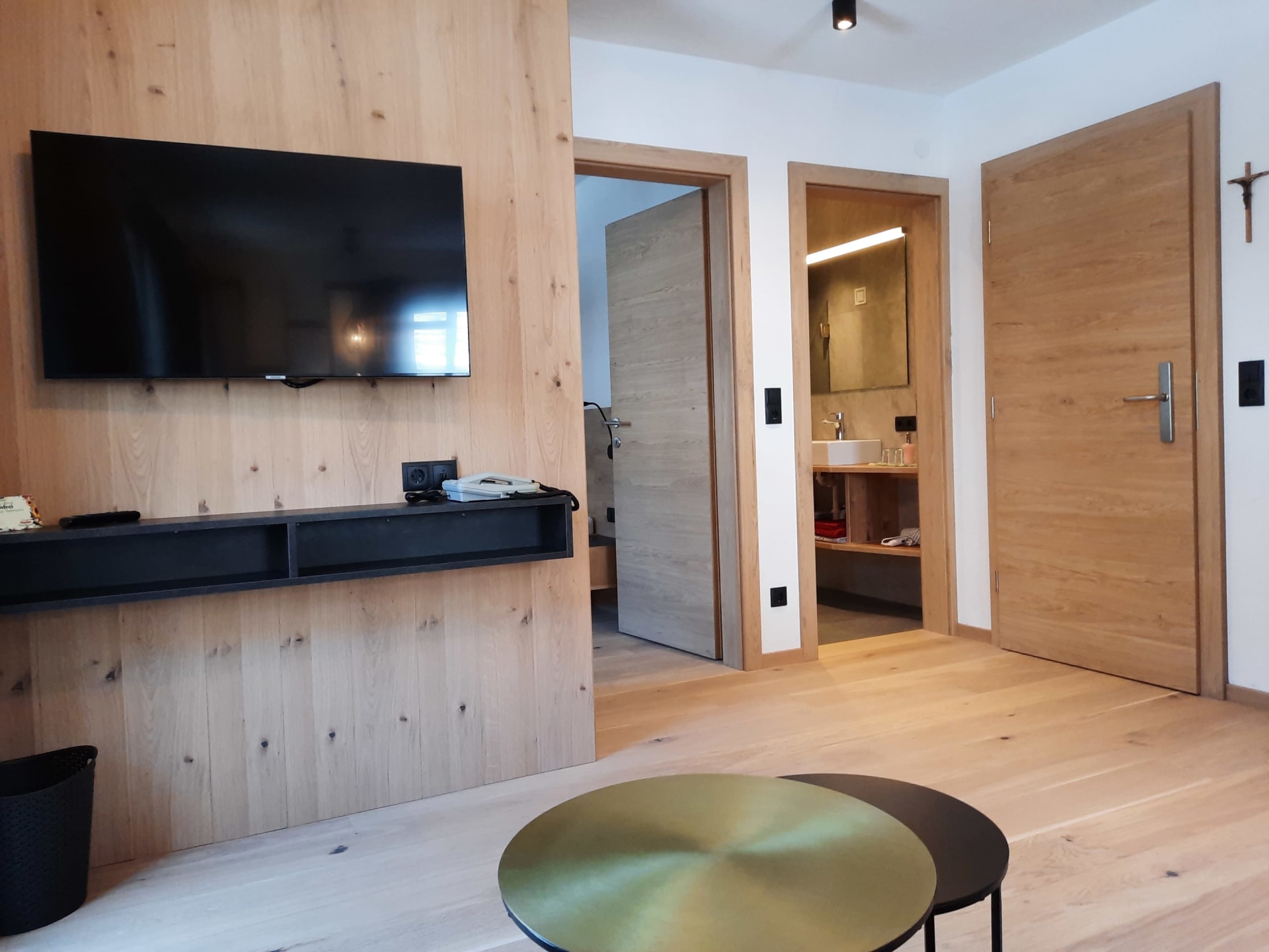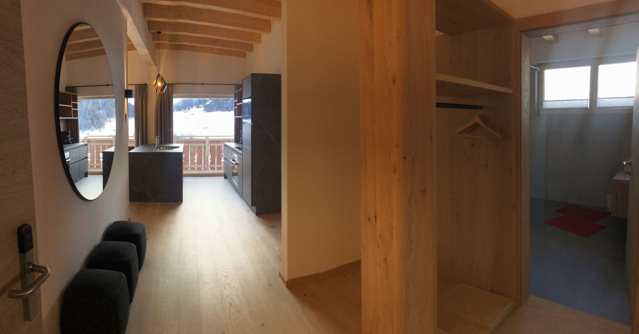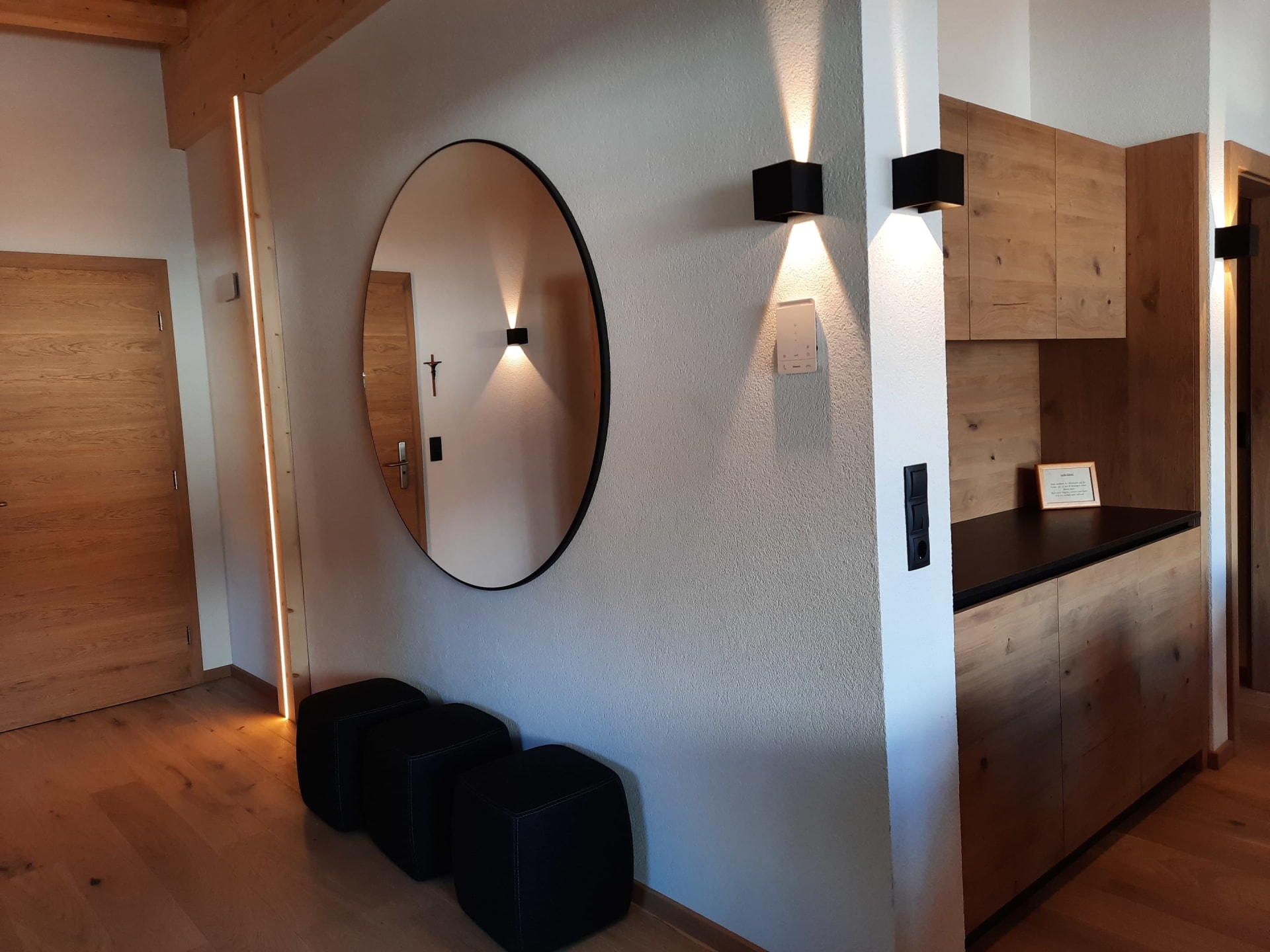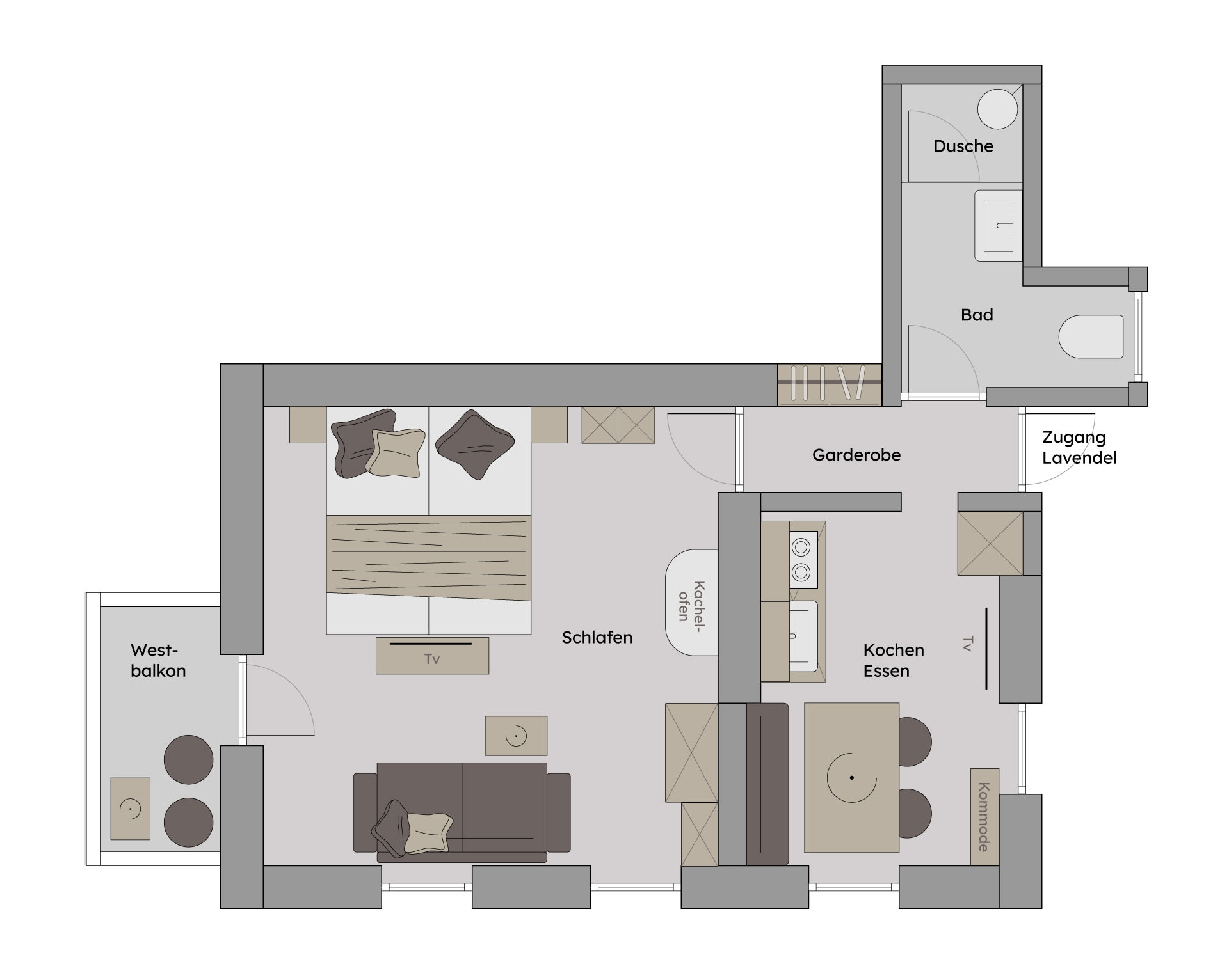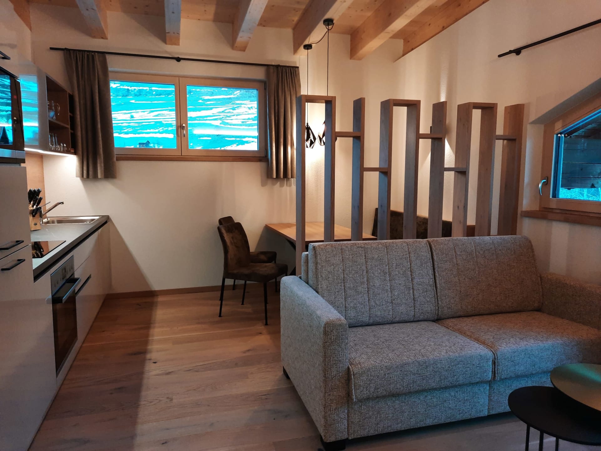 Du wohnst in einer hellen, modernen Küche mit Eichenboden, Essplatz für 4 Personen und TV. Einem neuen Badezimmer mit Walk-In-Dusche, Waschtisch und WC und einem Vorraum mit Garderobe.